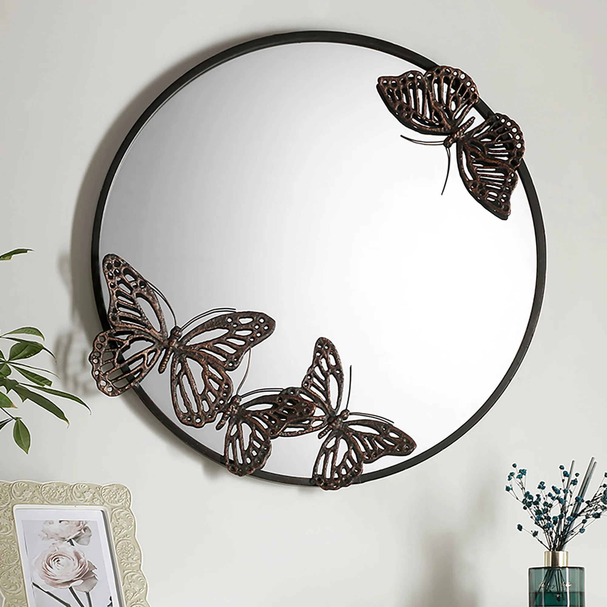 The Butterfly Round Wall Mirror is made of cast iron, metal, and glass.