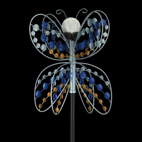 The Butterfly Solar Wind Spinner flutters among the gentle breezes. Made of metal, this two-level, silver wind spinner has 86 metallic discs that move the upper and lower butterfly wings in opposite directions. Colors include shades of dark blue, navy, baby blue, and gold. The top crackled glass ball is clear and has a solar light that provides 6-8 hours of continuous light at night. The weather- and fade-resistant spinner has waterproof solar panels, and a replaceable, rechargeable AA battery is included. The butterfly wind spinner has a thick and strong five-prong ground stake. Outdoor year-round use. Measures 16.5"Wx16.5"Dx69"H.