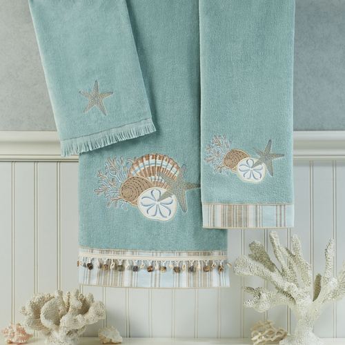 The By the Sea Spa Coastal Bath Towel Set will turn your bathroom into a garden of beachcombing treasures. The terry-looped, sheared pure cotton towel set features sea blue and sand brown charming striped trim and embroidered seashells, starfish, sand dollars, and coral. The spa-colored set includes one bath towel, 25"x50"; one hand towel, 17"x30"; and one fingertip towel, 12"x19". The bath towel has a scallop shell, coastal designs, and dangling iridescent bead and shell accent trim. The hand towel has coastal designs. The fingertip towel has a starfish and fringed edges. Machine wash or dry clean. Imported/USA.