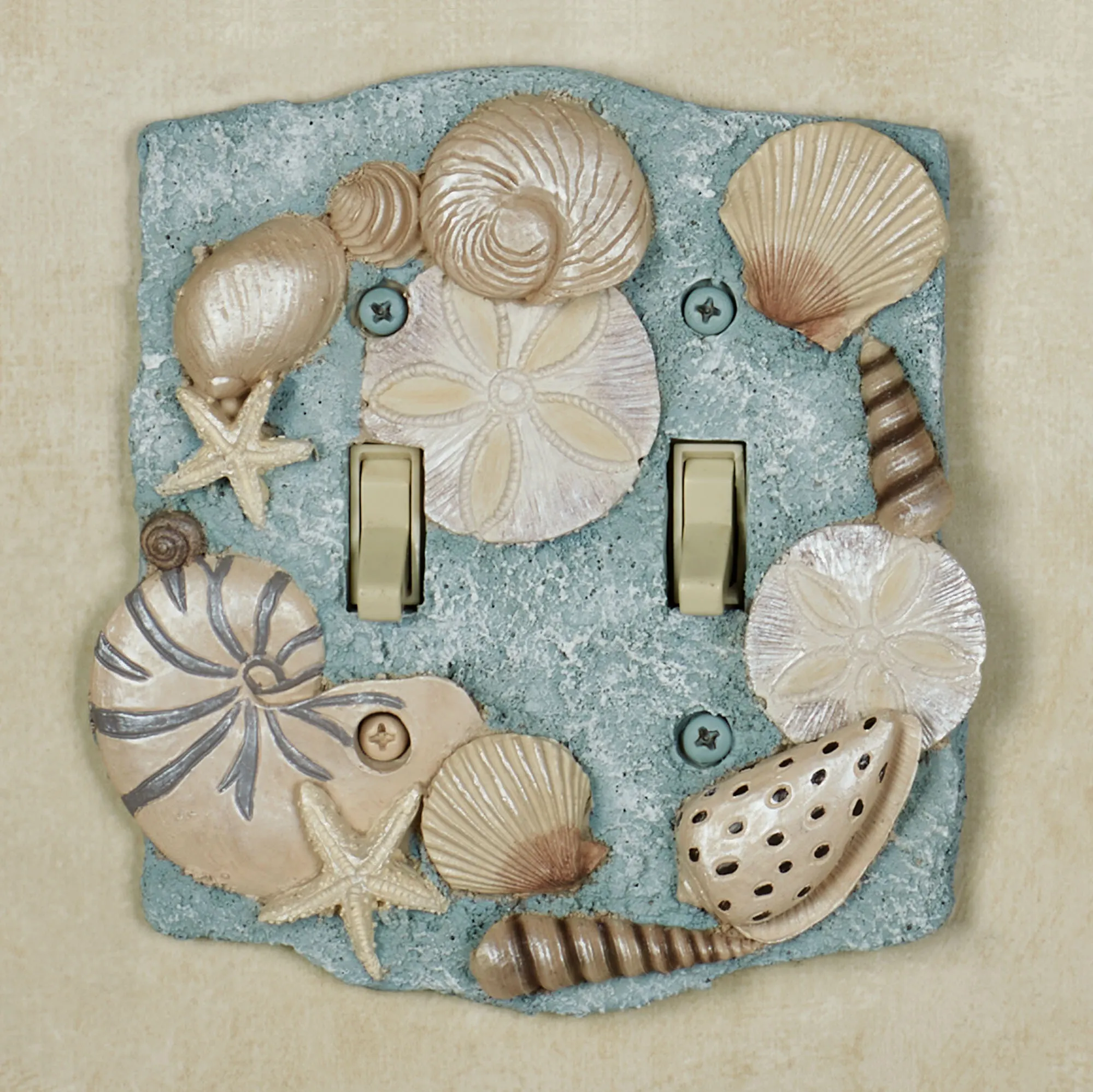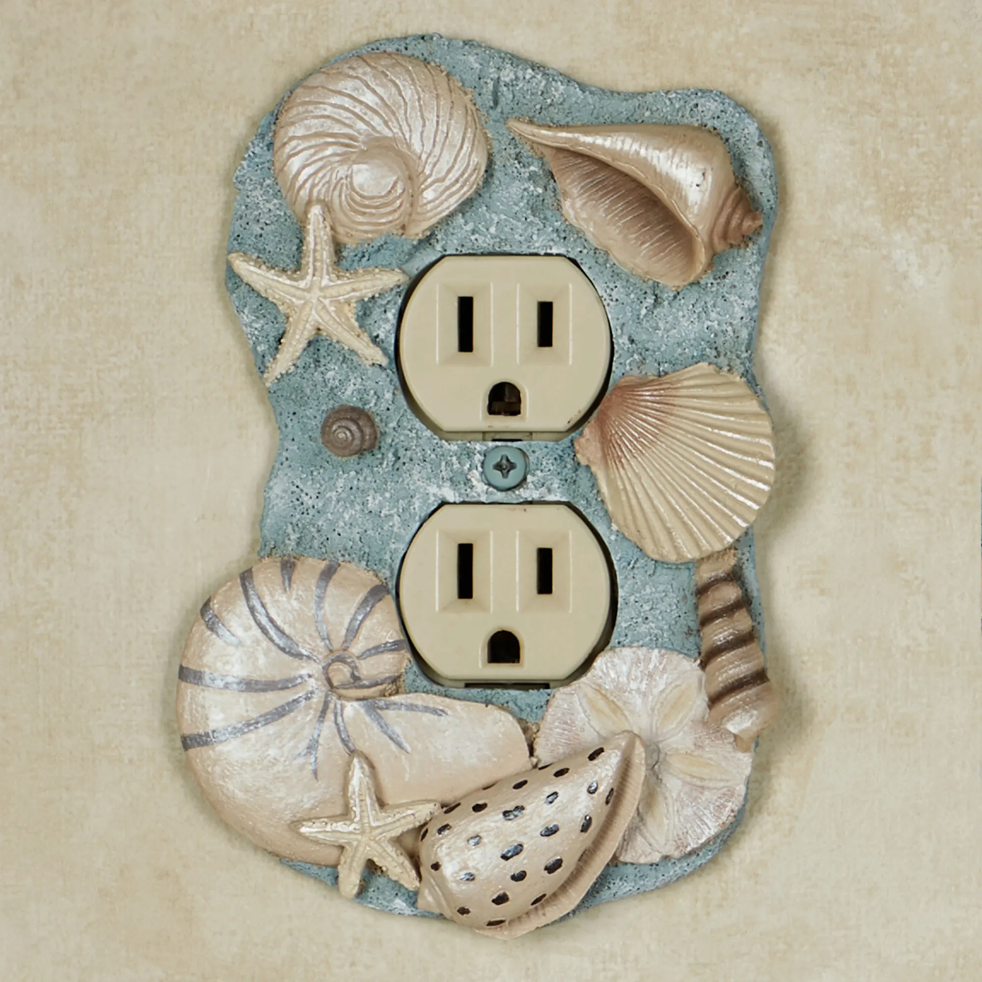Found By the Sea, these beach treasures decorate with coastal brilliance. The handpainted resin Switchplates feature a variety of realistically detailed shells and starfish. The blue background has natural-colored shells. Choose Single Switch, 4"Wx6"H; Double Switch, 5.25"Wx5.5"H; Single Outlet, 4"Wx5.5"H; Single Dimmer/Rocker Switch, 4.25"Wx6"H; or Double Dimmer/Rocker Switch, 5.25"Wx5.5"H. Do not over-tighten the screws. Due to the thickness of the design, these plates may not be able to support large adapters and chargers or nightlights.
