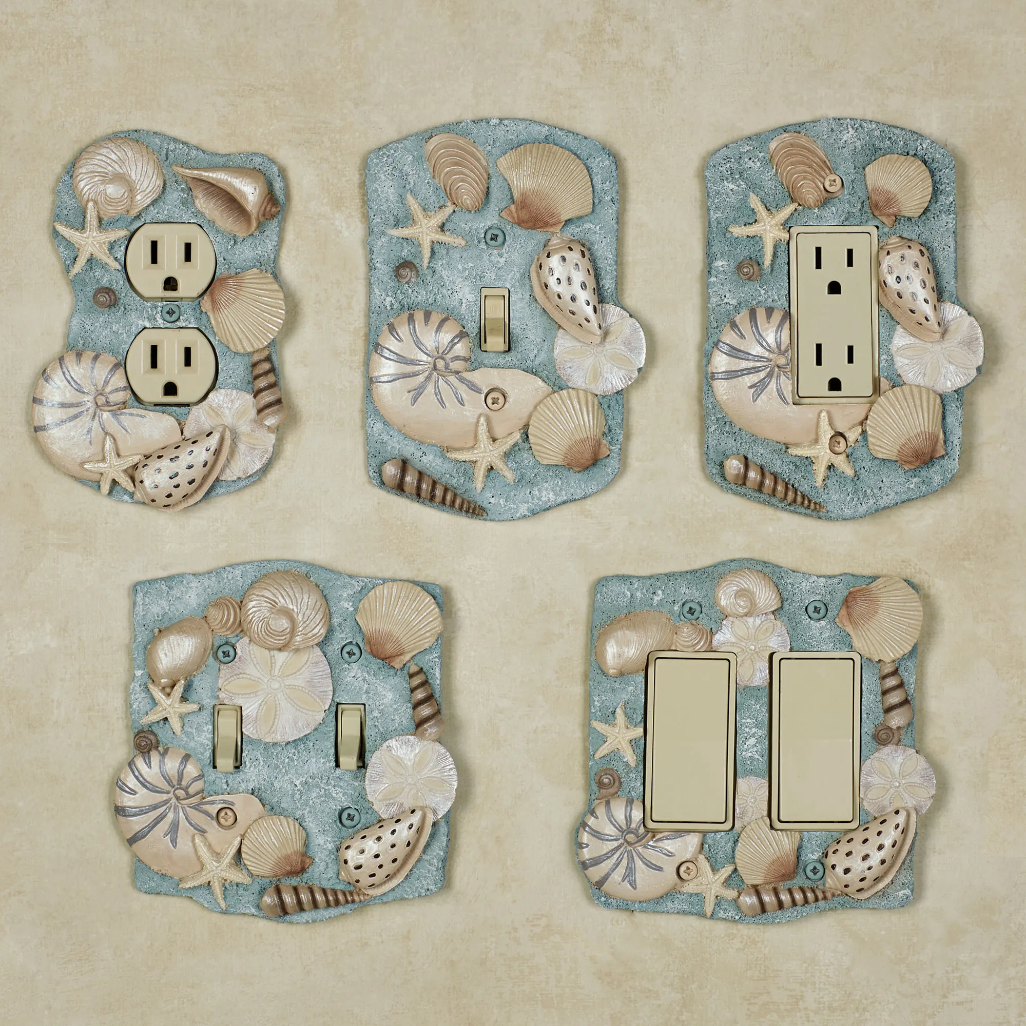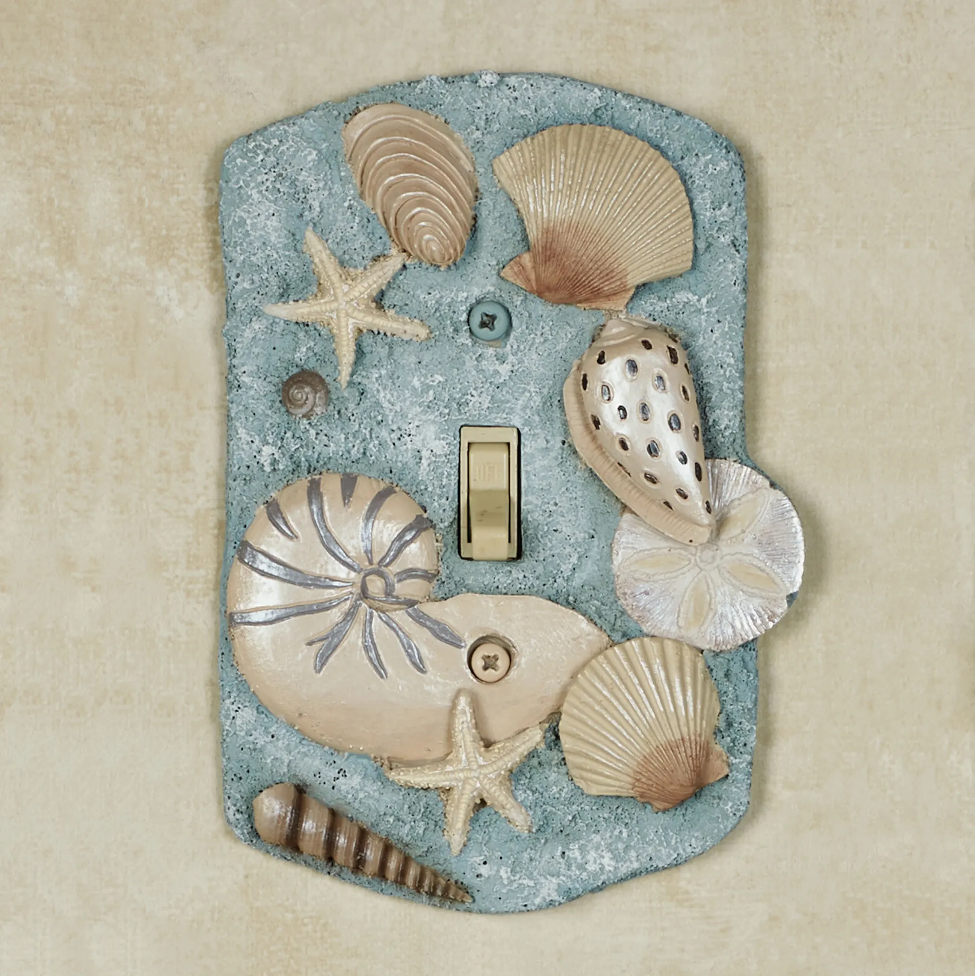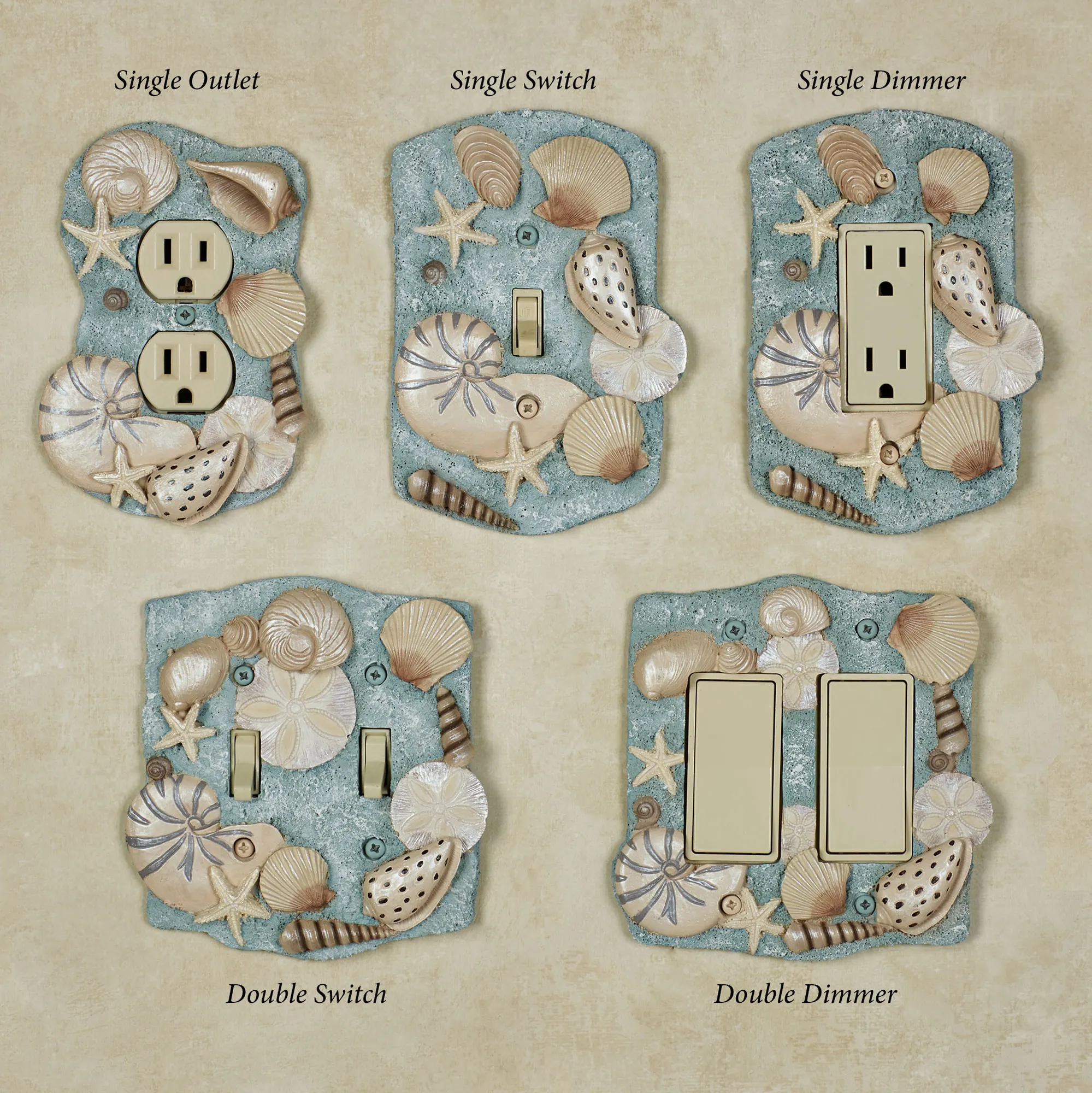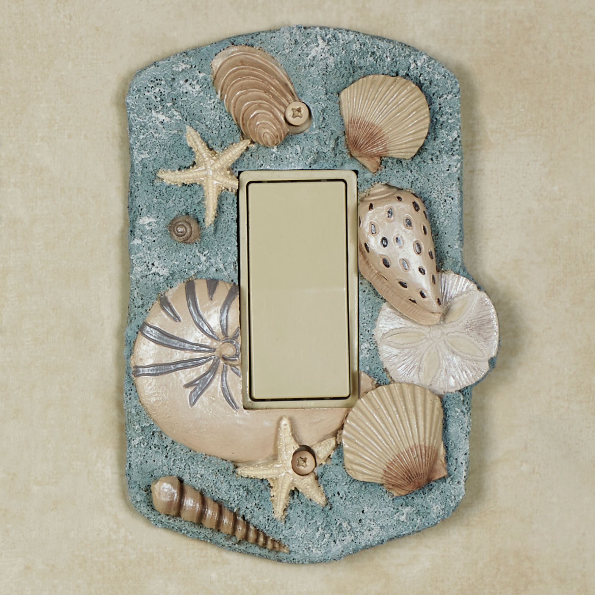 Found By the Sea, these beach treasures decorate with coastal brilliance. The handpainted resin Switchplates feature a variety of realistically detailed shells and starfish. The blue background has natural-colored shells. Choose Single Switch, 4"Wx6"H; Double Switch, 5.25"Wx5.5"H; Single Outlet, 4"Wx5.5"H; Single Dimmer/Rocker Switch, 4.25"Wx6"H; or Double Dimmer/Rocker Switch, 5.25"Wx5.5"H. Do not over-tighten the screws. Due to the thickness of the design, these plates may not be able to support large adapters and chargers or nightlights.