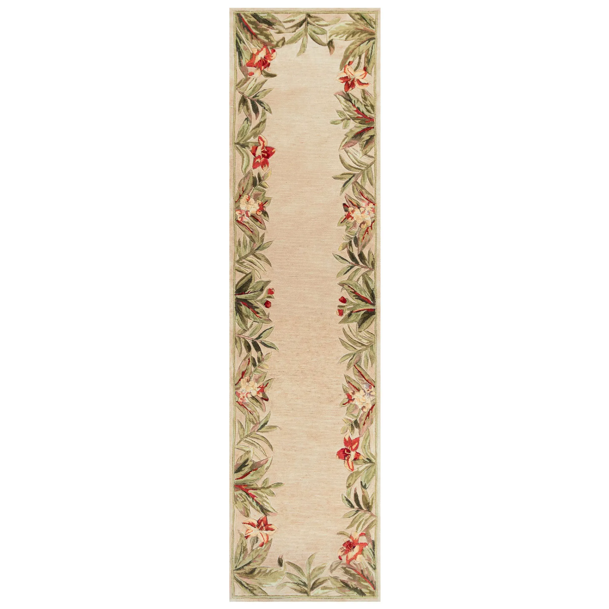Fresh colors and a beautiful design give the Cabana Breeze Area Rugs their unique style. Hand-tufted in India of wool, the .75" thick floorcoverings feature a solid field with an oversized lily and orchid border. We recommend professional cleaning by a rug cleaner.