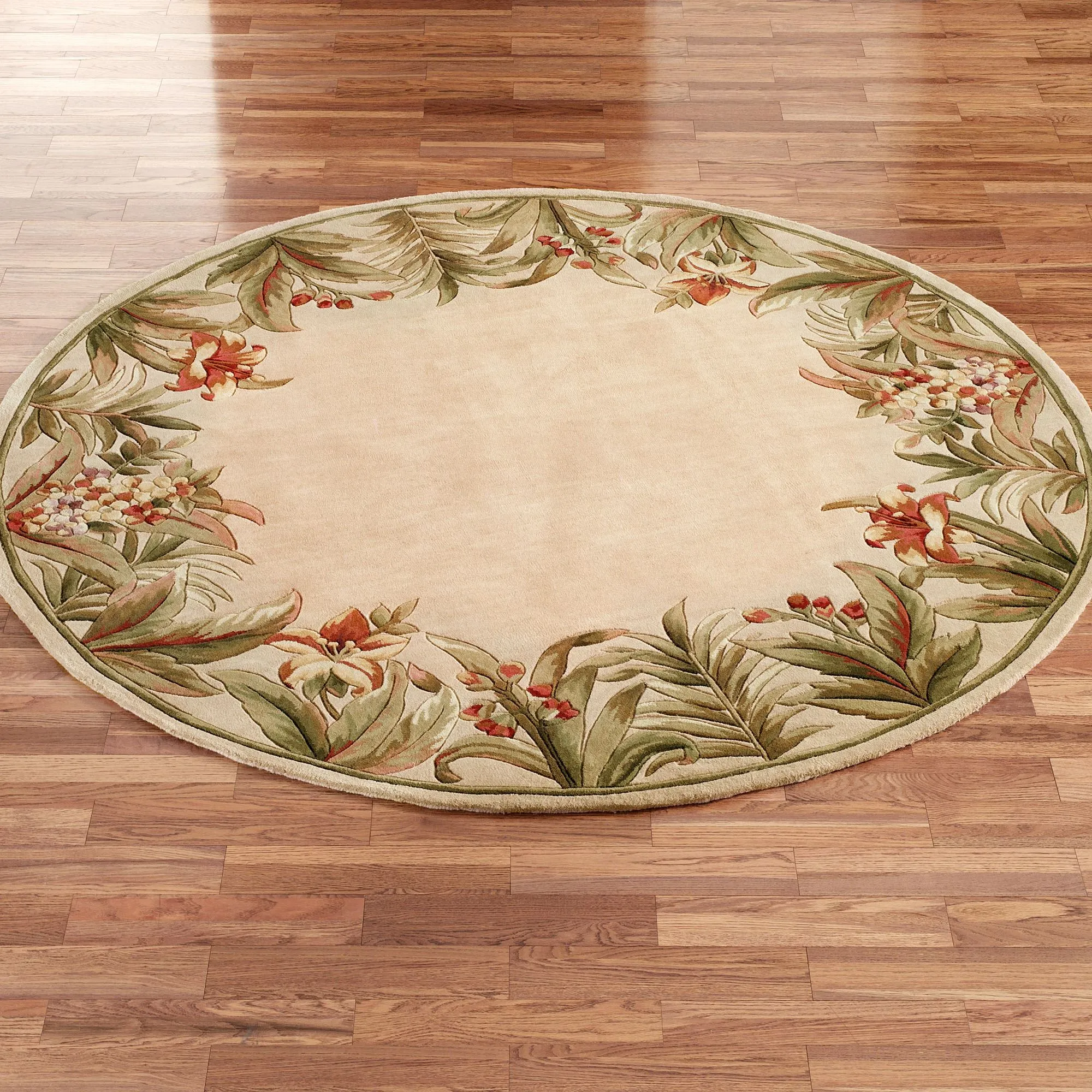 Cabana Breeze tropical-themed round rugs are made from wool. Cloth-covered latex backing. Made in India.