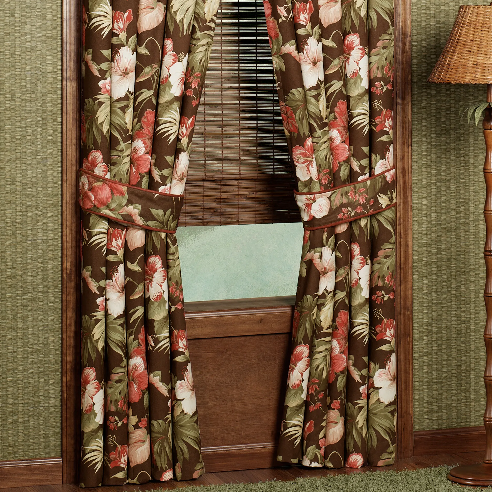 Window Treatment: Curtains have a paradise print of tropical florals and fronds in coral, spice, gold, beige, and green on cocoa; tiebacks included. 3" rod pocket. Lined Epaulet Tab Valance is cocoa faux suede with embroidered tropical florals and 2" cinnabar faux suede border on bottom. The 3" tabs are formed from the epaulet-style closures with cocoa faux suede buttons.