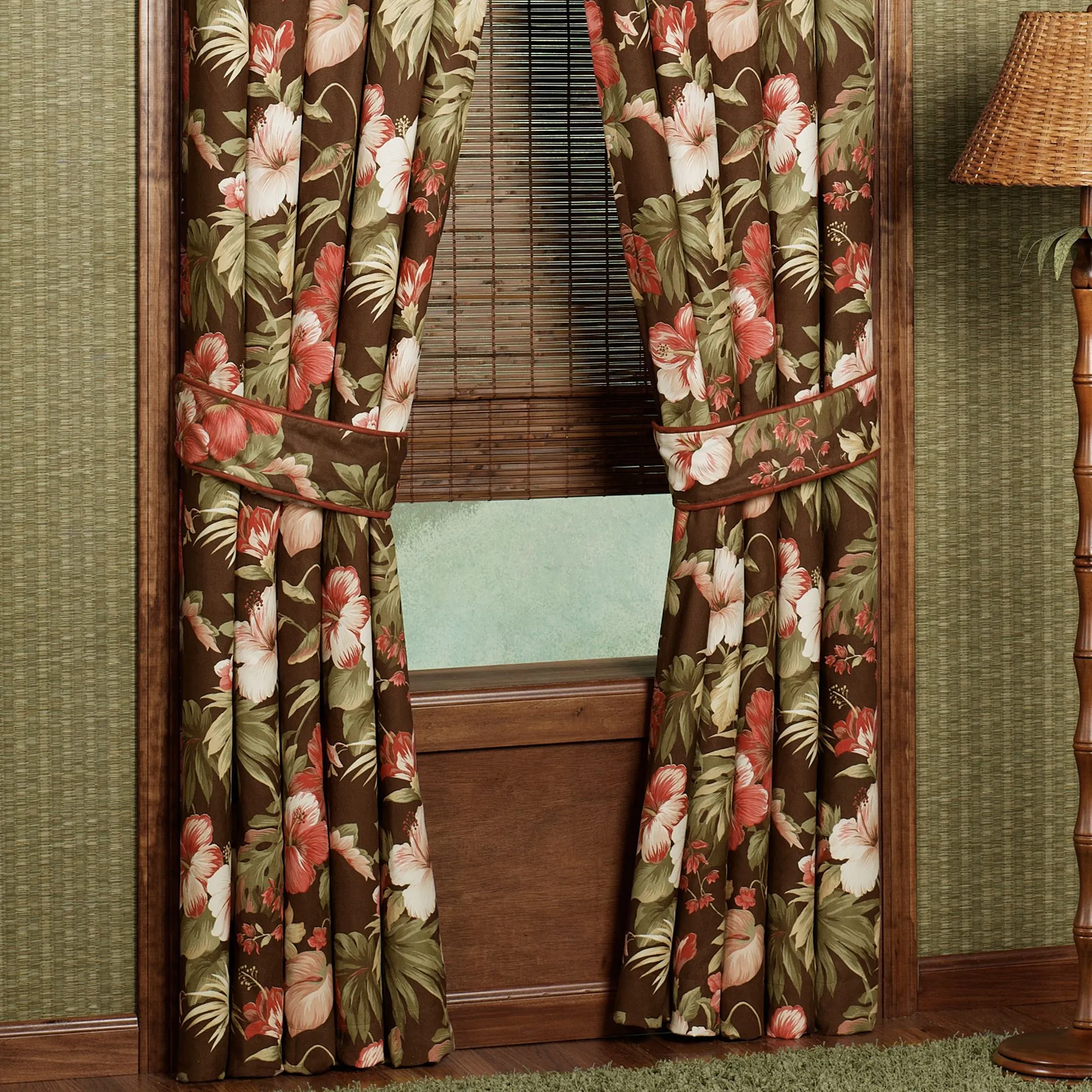 Give your room a lush, tropical look with the polyester faux suede Cabana Window Treatment. Curtains have tropical florals and fronds in coral, spice, gold, beige, and green on cocoa; 3" rod pocket. Tiebacks included. Layered Valance has a tropical, scalloped top and a cinnabar bottom layer. 3" rod pocket. Dry clean. Imported.