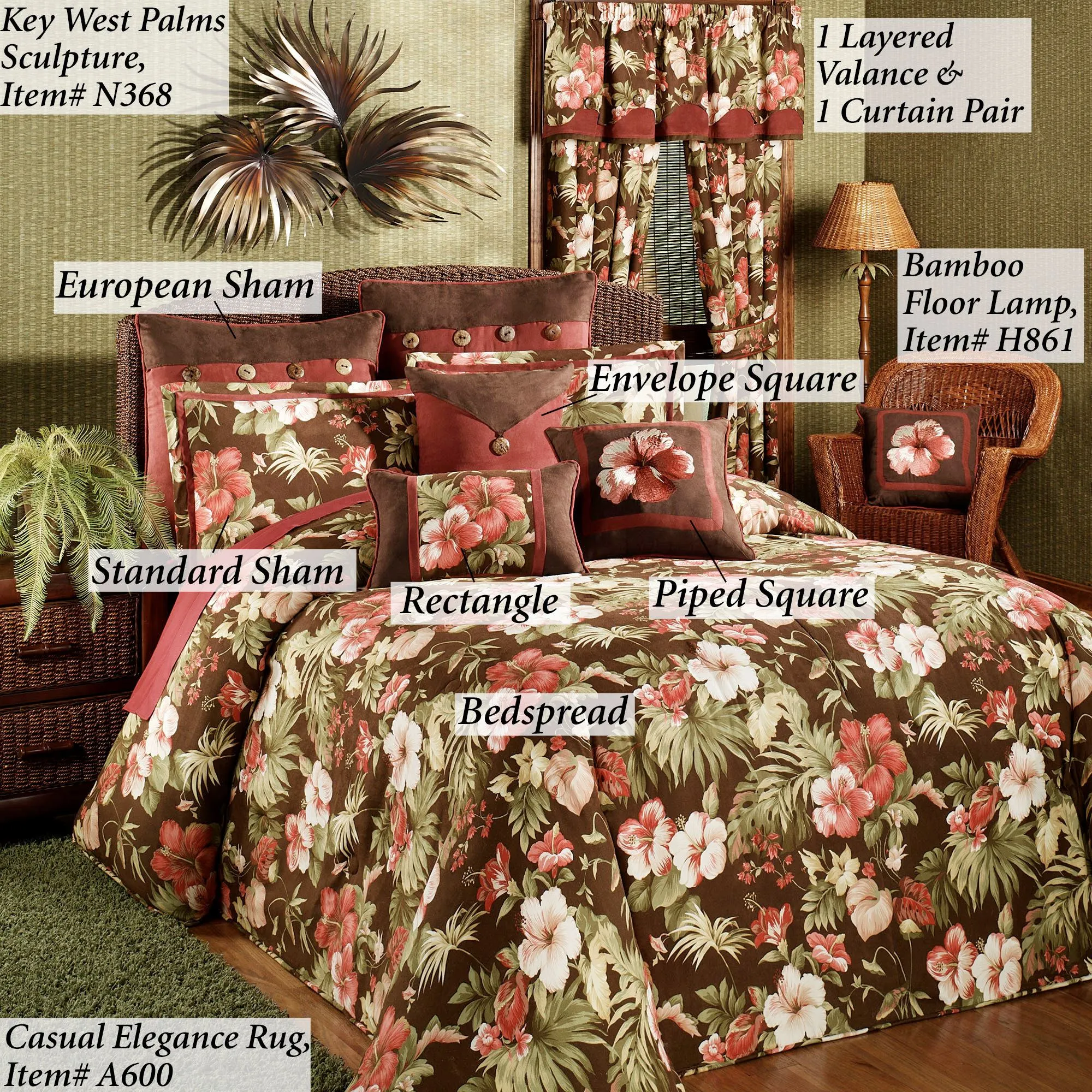 Window Treatment: Curtains have a paradise print of tropical florals and fronds in coral, spice, gold, beige, and green on cocoa; tiebacks included. 3" rod pocket. Layered Valance has a scalloped top layer of faux suede tropical print with decorative button detailing. Bottom layer is cinnabar faux suede with cocoa binding. 3" rod pocket. Lined Epaulet Tab Valance is cocoa faux suede with embroidered tropical florals and 2" cinnabar faux suede border on bottom. The 3" tabs are formed from epaulet style closure with cocoa faux suede buttons.