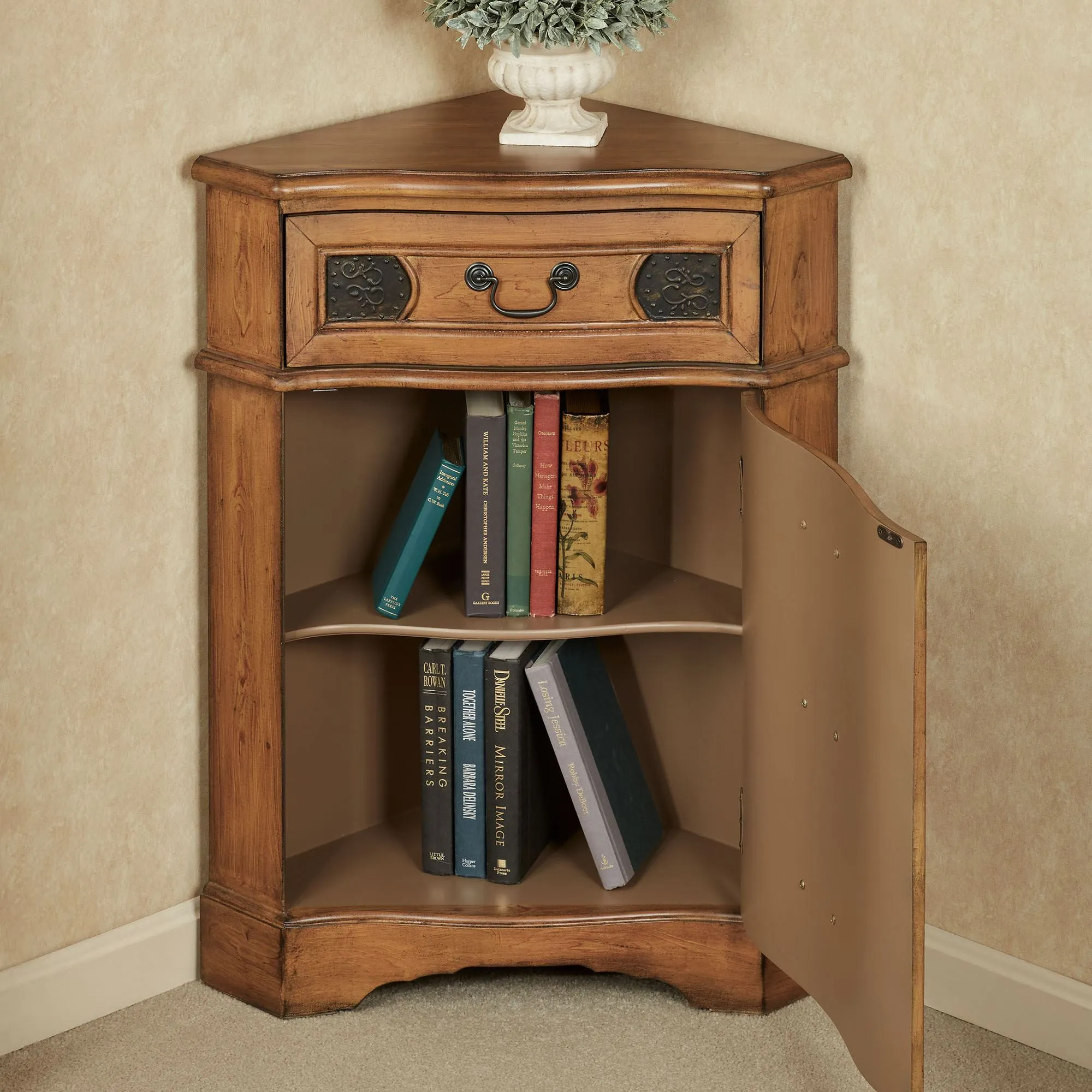 Cadiz Corner Accent Cabinet is wooden with metal hardware.