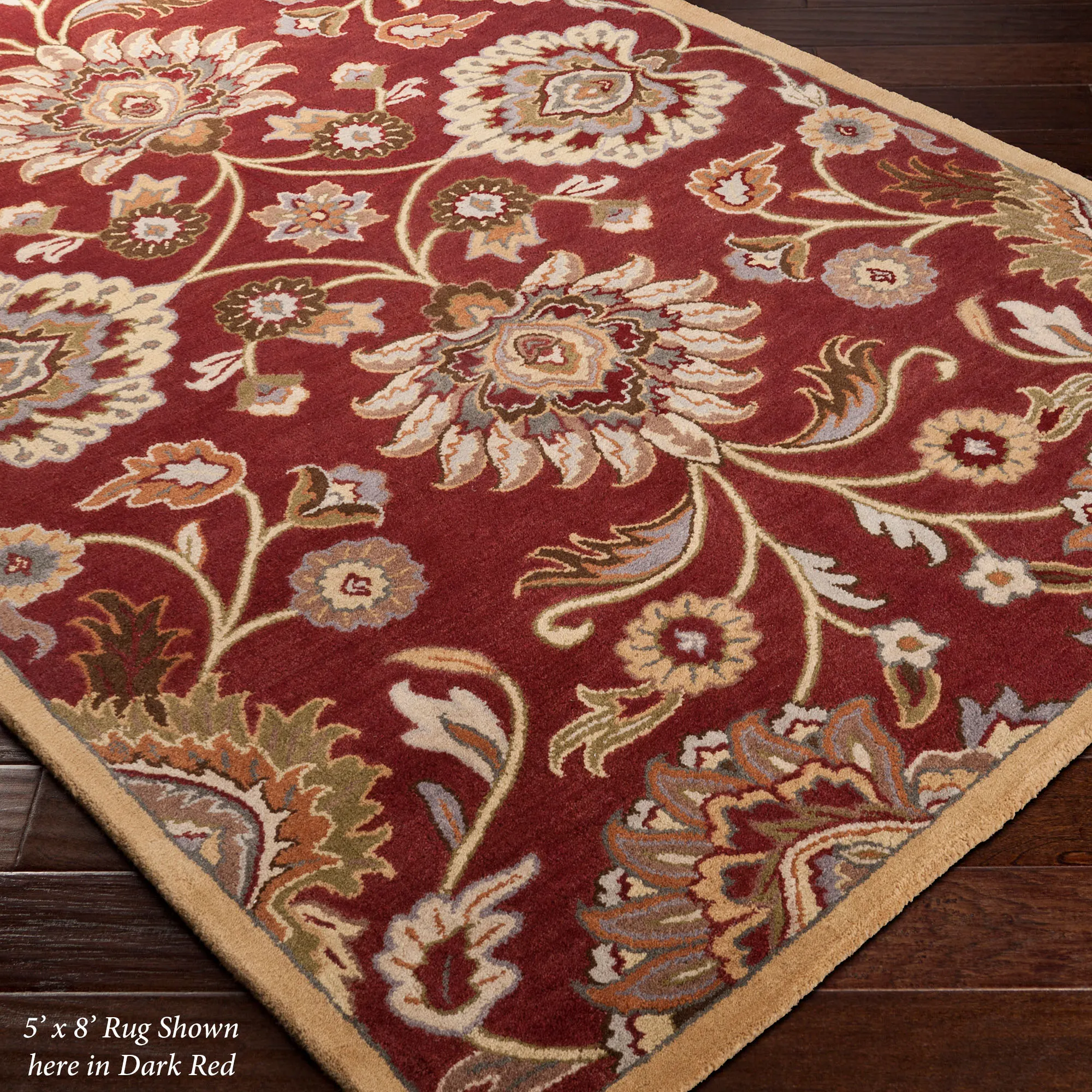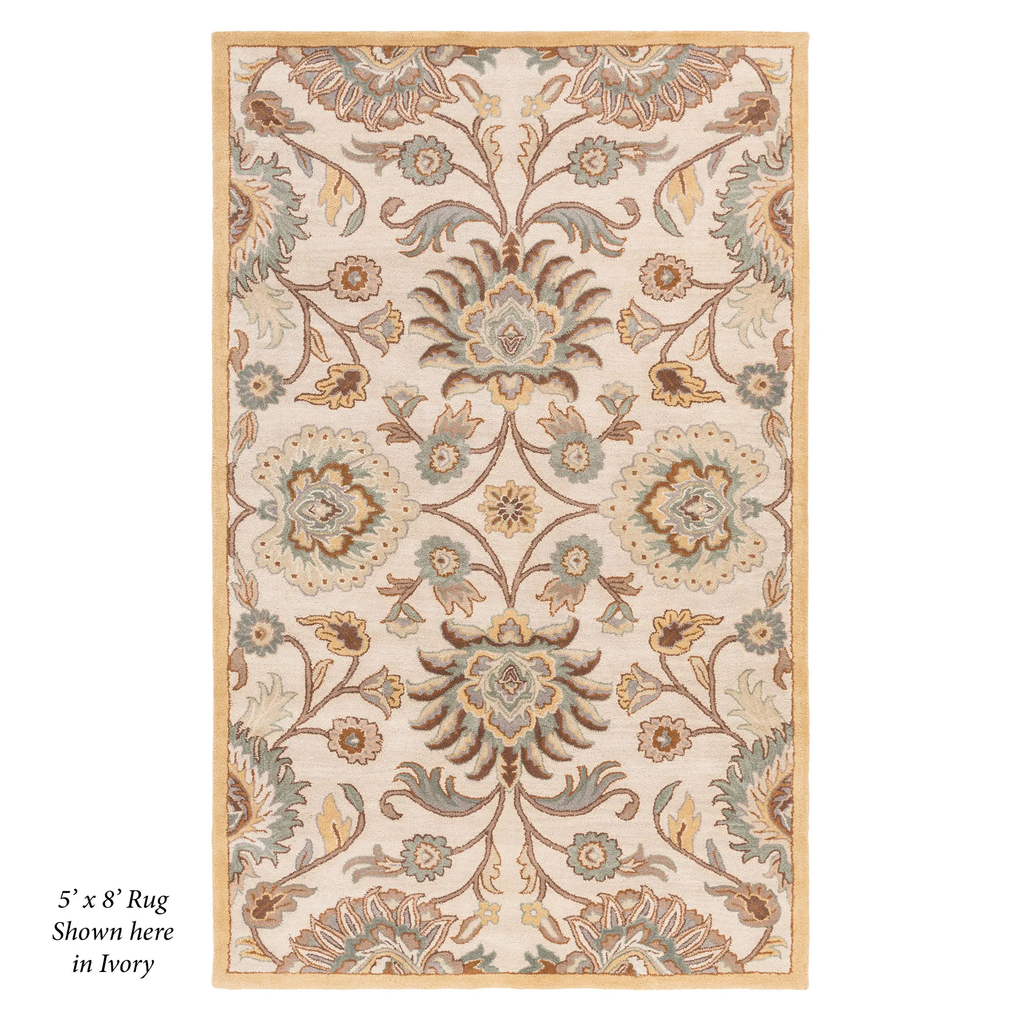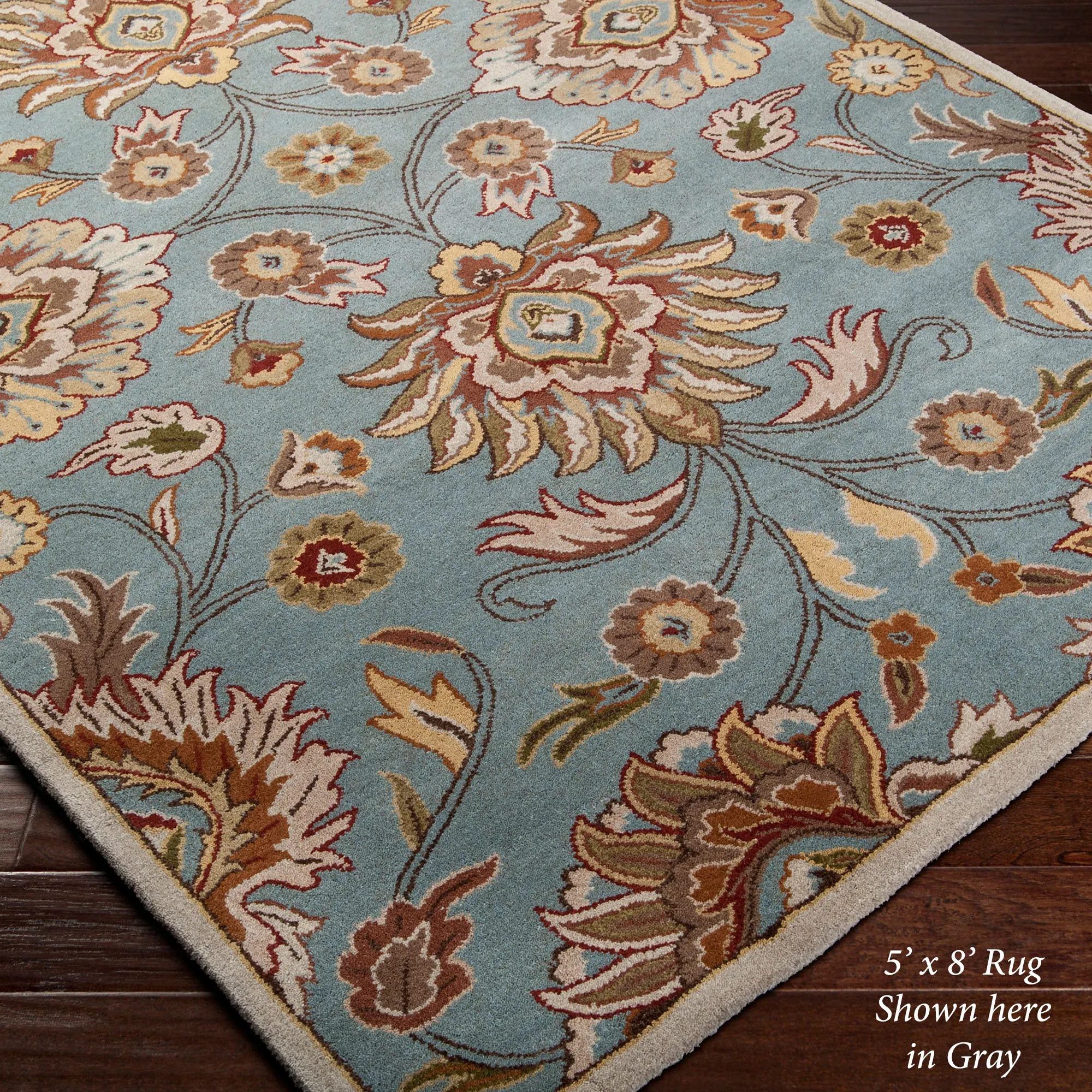 A traditional Jacobean floral design blooms across the Caesar Rug. Hand-tufted wool area rug is .87" thick and has a cloth-covered latex backing. Ivory includes shades of ivory, medium gray, tan, brown, lavender, burnt orange, and charcoal. Dark Red includes shades of dark red, tan, mustard, brown, wheat, black, burnt orange, olive, and gray. Gray includes shades of gray, burnt orange, olive, tan, brown, and brick red. Tan includes shades of tan, blue, brick red, gray, pale blue, olive, and wheat. We recommend professional cleaning by a rug cleaner. Made in India.