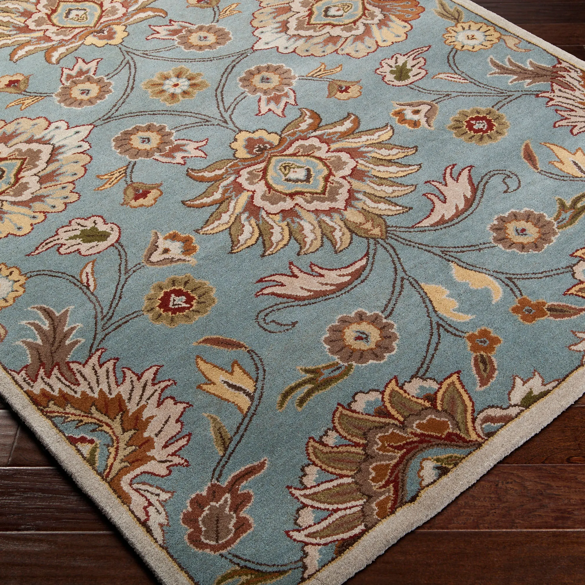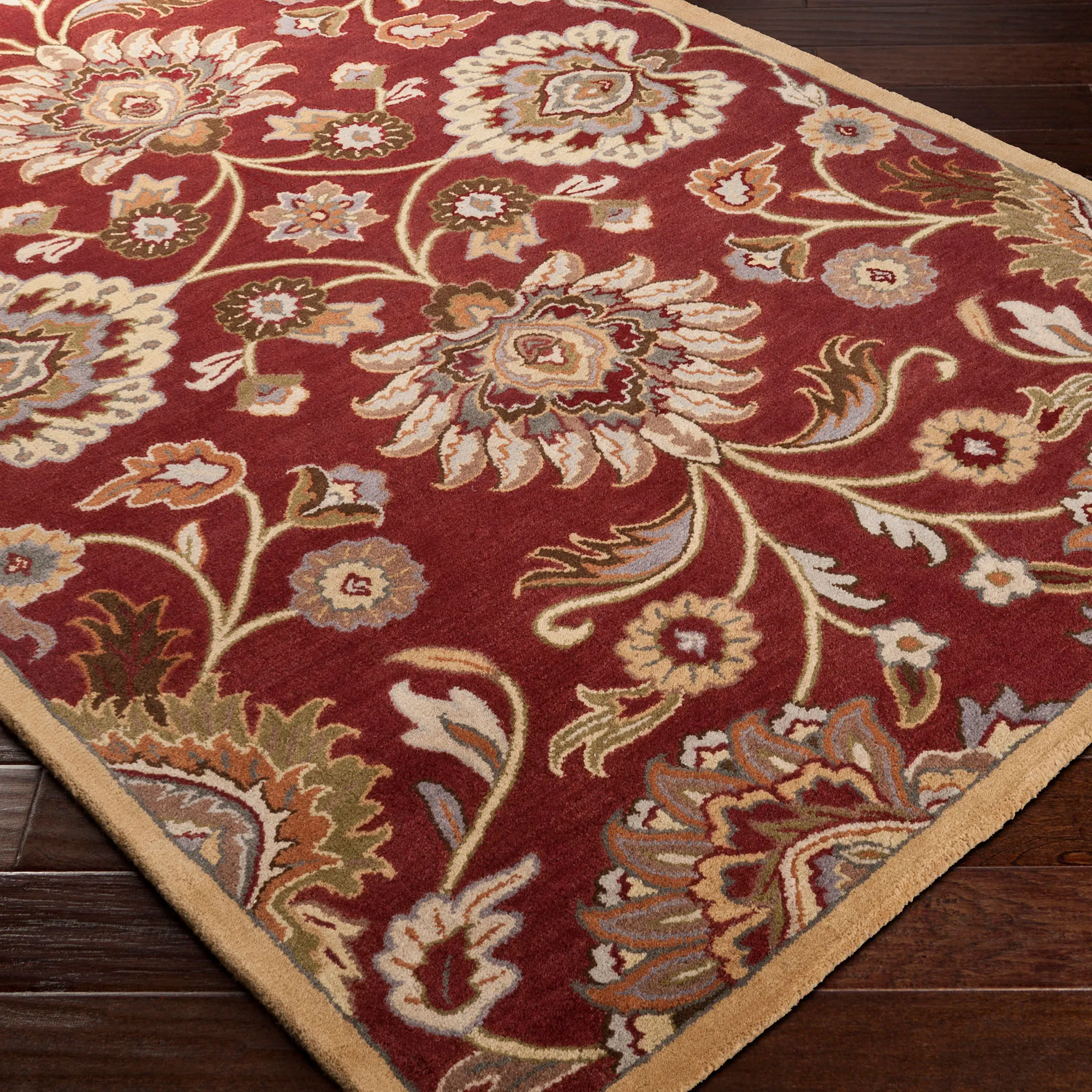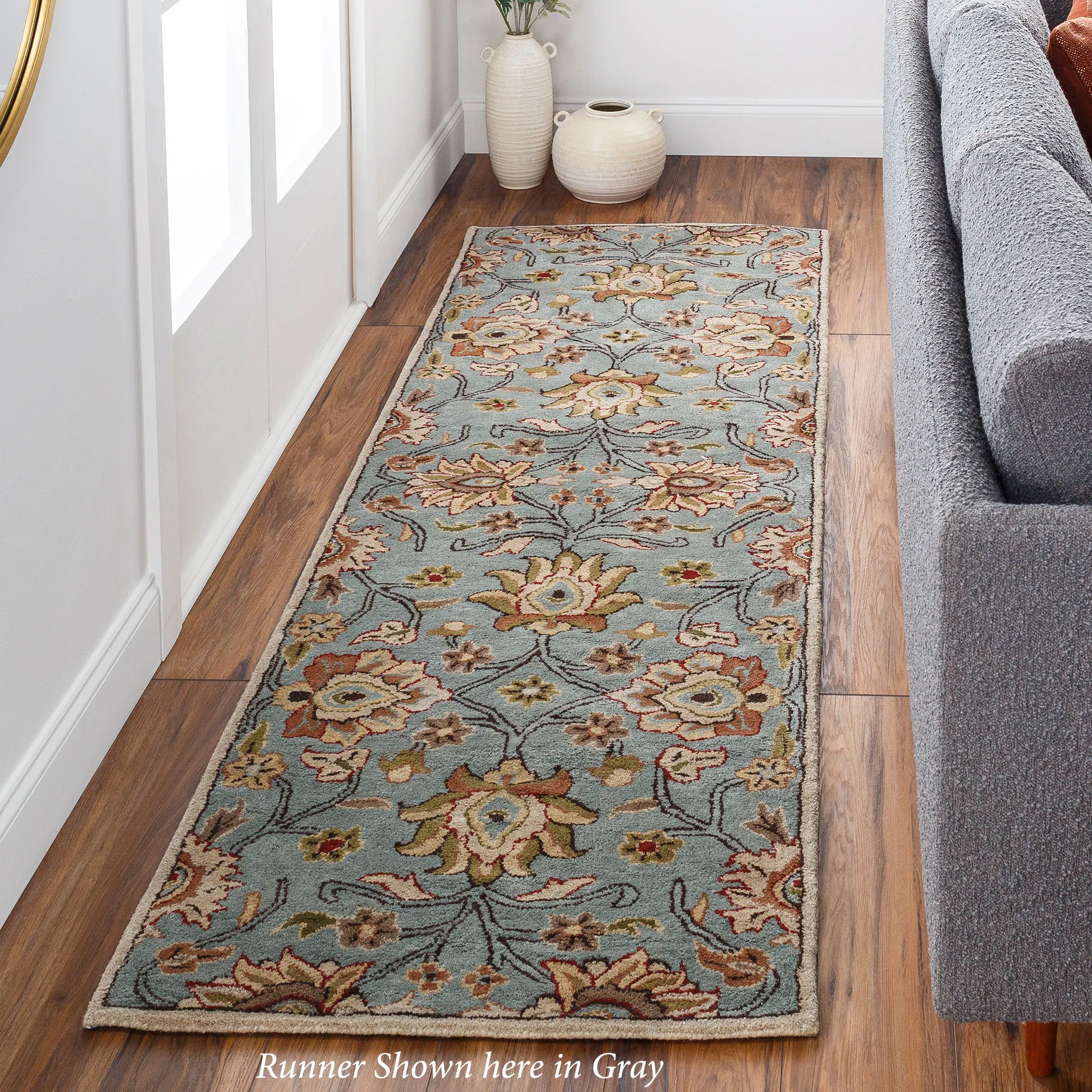 A traditional Jacobean floral design blooms across the Caesar Rug. Hand-tufted wool area rug is .87" thick and has a cloth-covered latex backing. Ivory includes shades of ivory, medium gray, tan, brown, lavender, burnt orange, and charcoal. Dark Red includes shades of dark red, tan, mustard, brown, wheat, black, burnt orange, olive, and gray. Gray includes shades of gray, burnt orange, olive, tan, brown, and brick red. Tan includes shades of tan, blue, brick red, gray, pale blue, olive, and wheat. We recommend professional cleaning by a rug cleaner. Made in India.