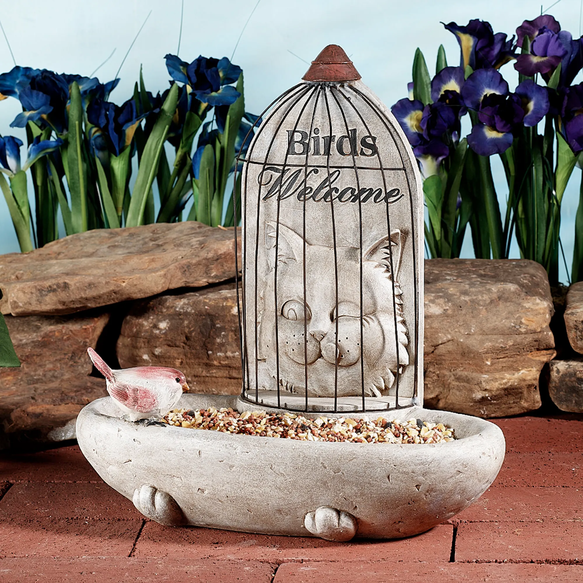 None of your feathered friends will be harmed when they perch to feast on the Caged Cat Bird Feeder. This weathered stone, resin accent features a cat holding the feeder while licking his chops behind a metal cage. The words above his head read "Birds Welcome." A dimensional salmon and white bird rests on the edge. For outdoor seasonal use. Cat bird feeder is approx. 12"Wx7"Dx12"H.