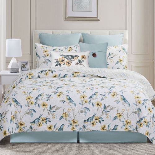 Dream of birdwatching with the sweet Calix Bluebird Floral Bedding. The Mini Quilt Set includes a quilt and shams. With a crisp white vermicelli-quilted background, the printed cotton bedding features bluebirds on flowering leafy branches in hues of blue, light taupe, and golden yellow. Quilt has a color-coordinating printed plaid reverse; fill is cotton/polyester. Machine washable. Imported.