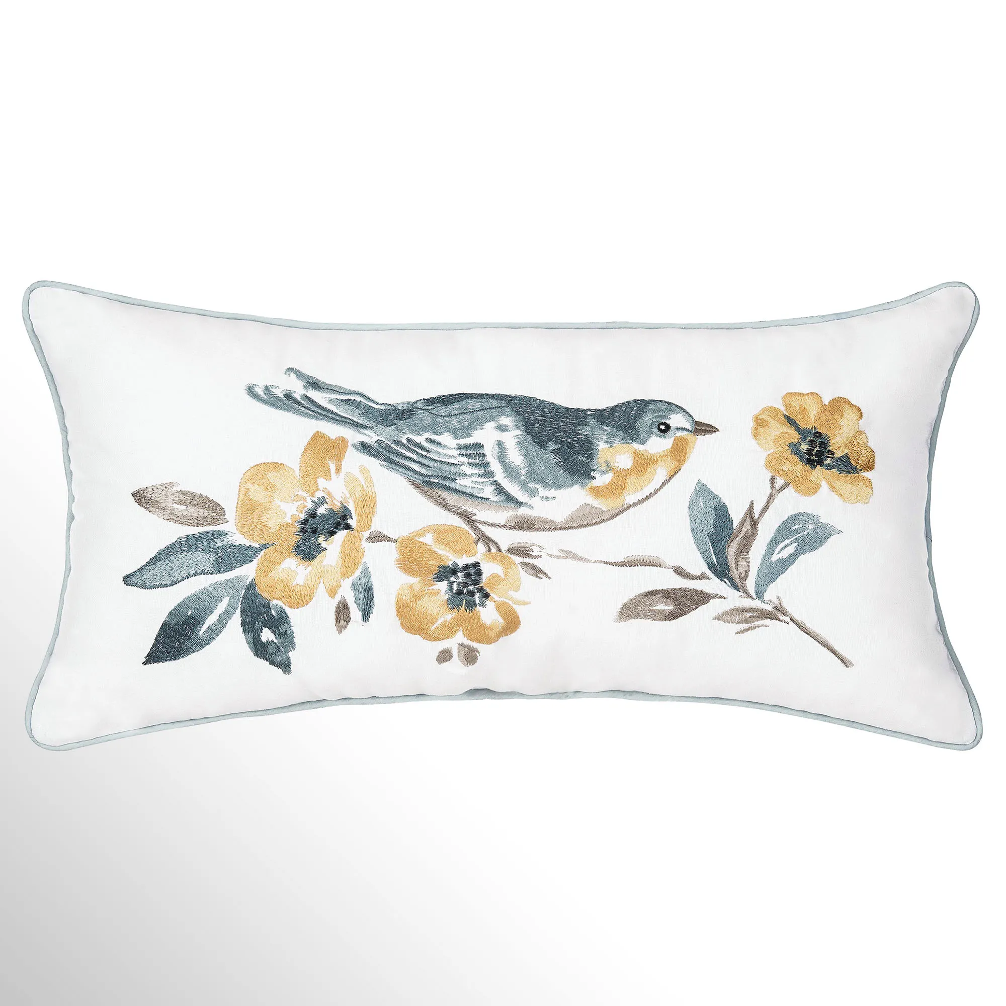 The piped Rectangle Pillow is white cotton with an embroidered coordinating bird on a branch. Fill is polyester. Spot clean.
