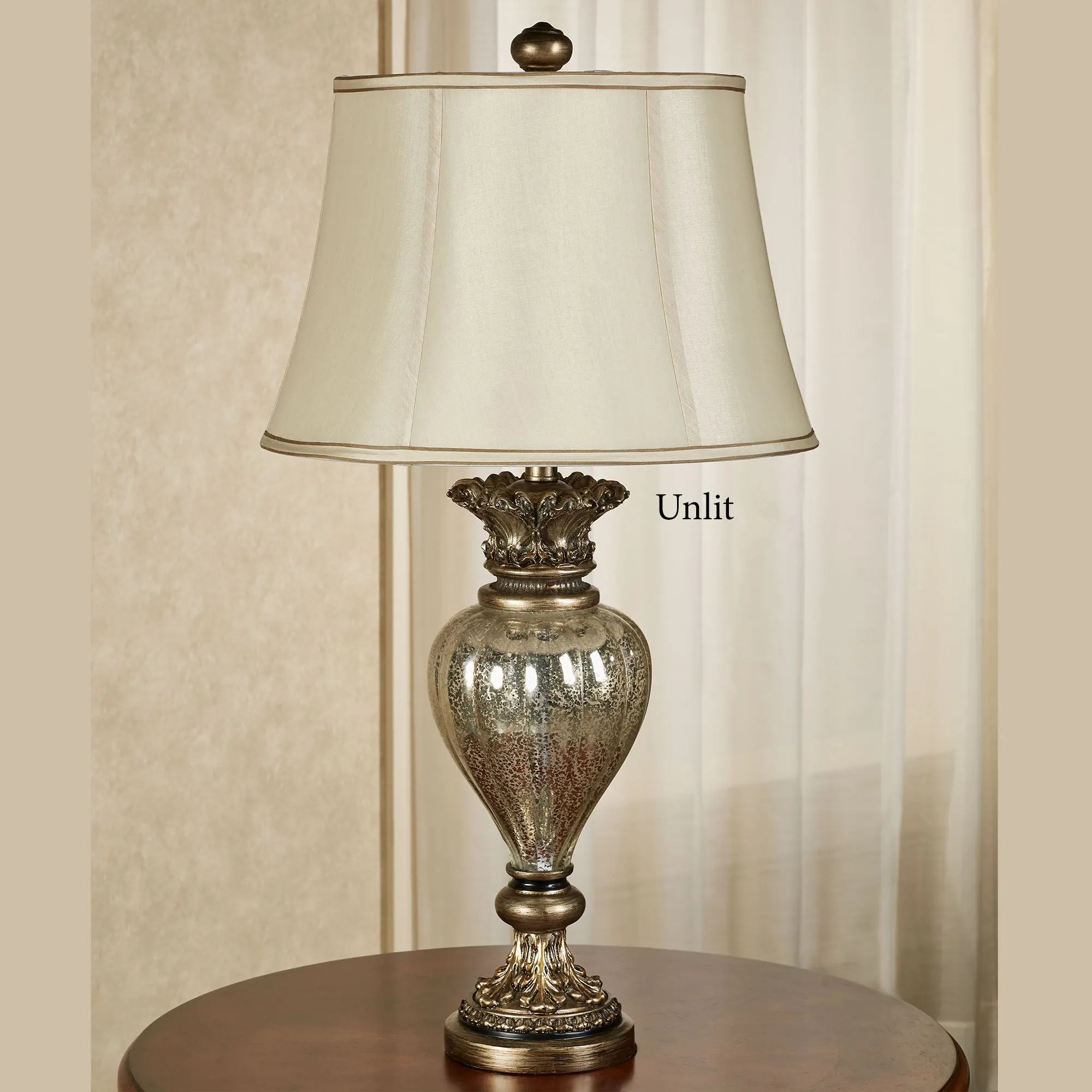 Traditional grandeur flourishes throughout the Callie Table Lamp. Finished in antique gold, the resin base and topper feature a beautiful stepped design detailed with acanthus leaves whose flowing curves complement the shaped mercury glass font. A cream faux silk empire shade with dark taupe trim adds an elegant finishing touch. UL listed. Requires one 150W max. bulb. Lamp measures 17"dia.x32"H, including the 2.5"H matching round finial.