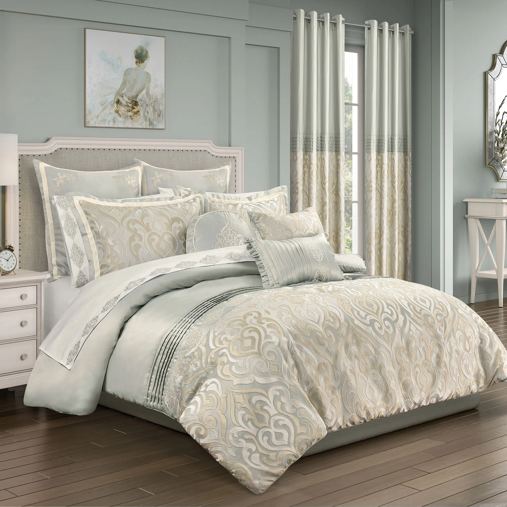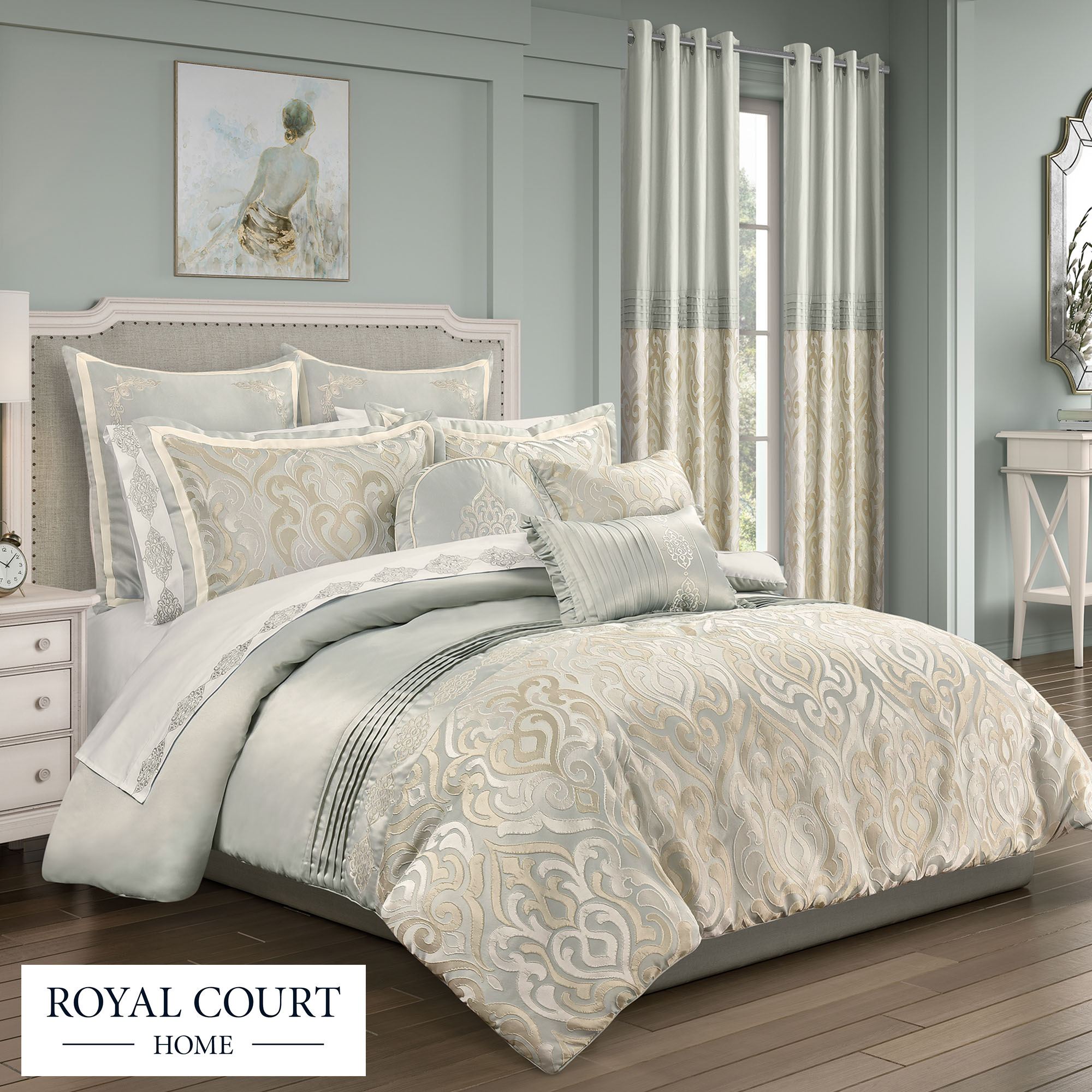 The luxe look of the Calmfield Bedding reigns with elegance. This sophisticated polyester ensemble, from Royal Court, features a grand-scale, woven-jacquard damask design. Colors include shades of cream, gold, and aqua.