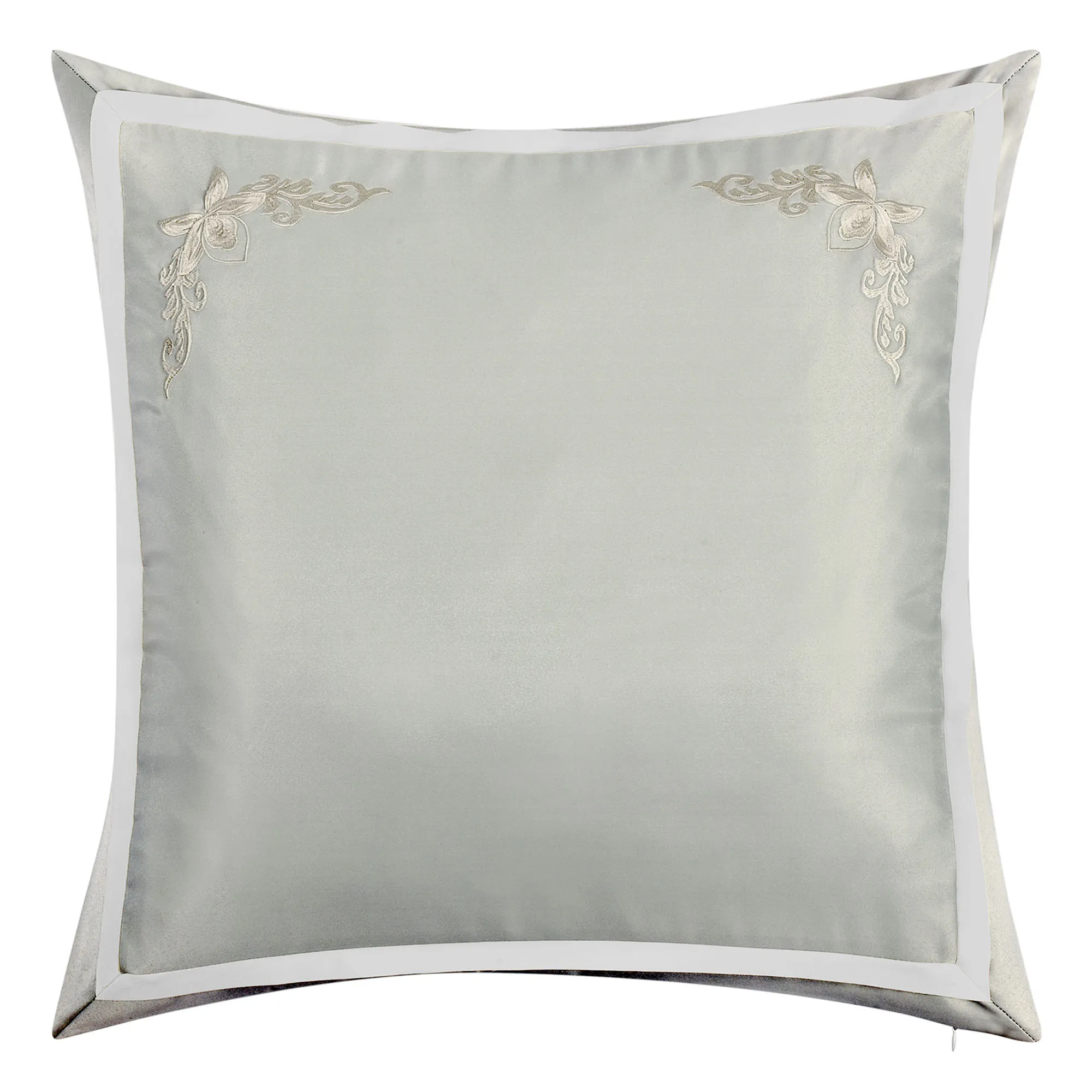 The solid aqua European Sham has embroidery, a pieced cream frame, mitred corners, and a zipper closure.