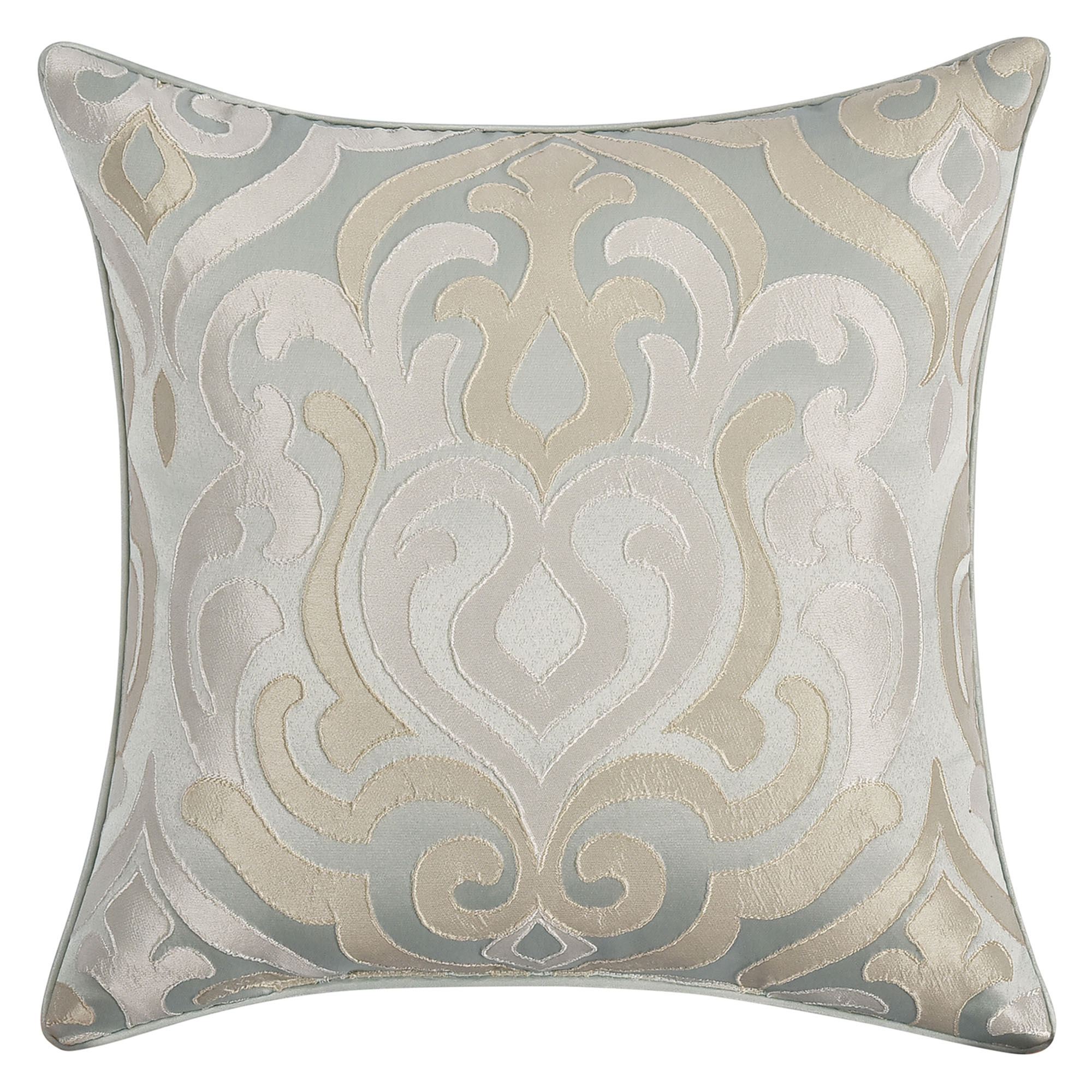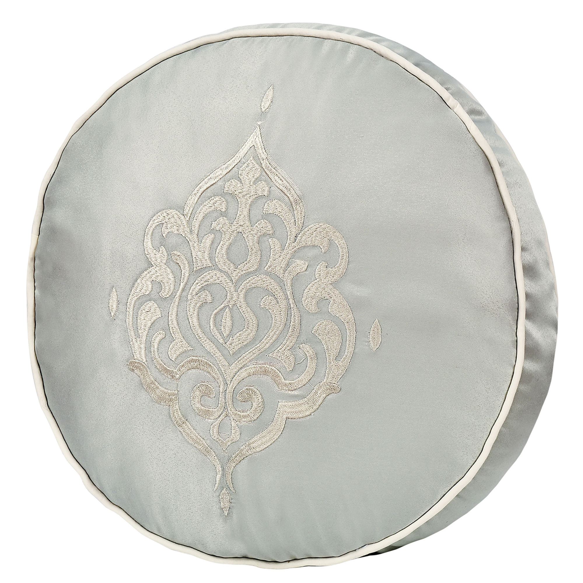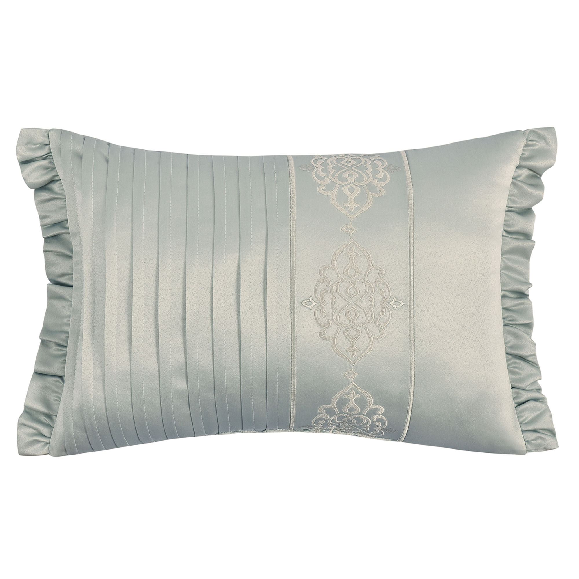 Pillows: Spot clean. The piped Round is solid aqua with an embroidered damask design and a 2" side gusset. The solid aqua Rectangle has pleats, embroidery, and a ruffled flange on the length ends. The Square has damask designs and piped ends.