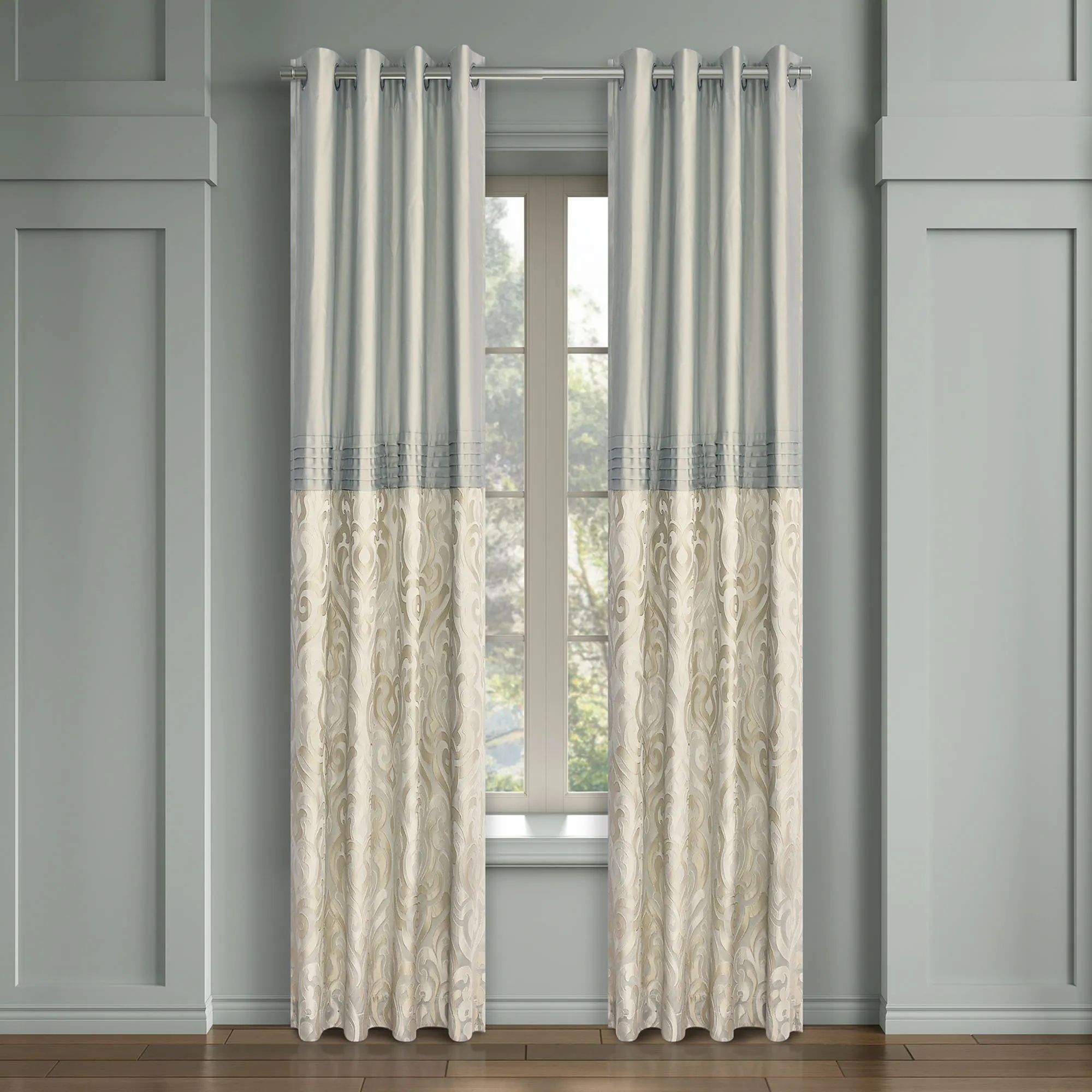 The lined Wide Grommet Curtain Pair is aqua with accent pleats, pieced woven damask designs, and 3" dia. silver metal grommets.