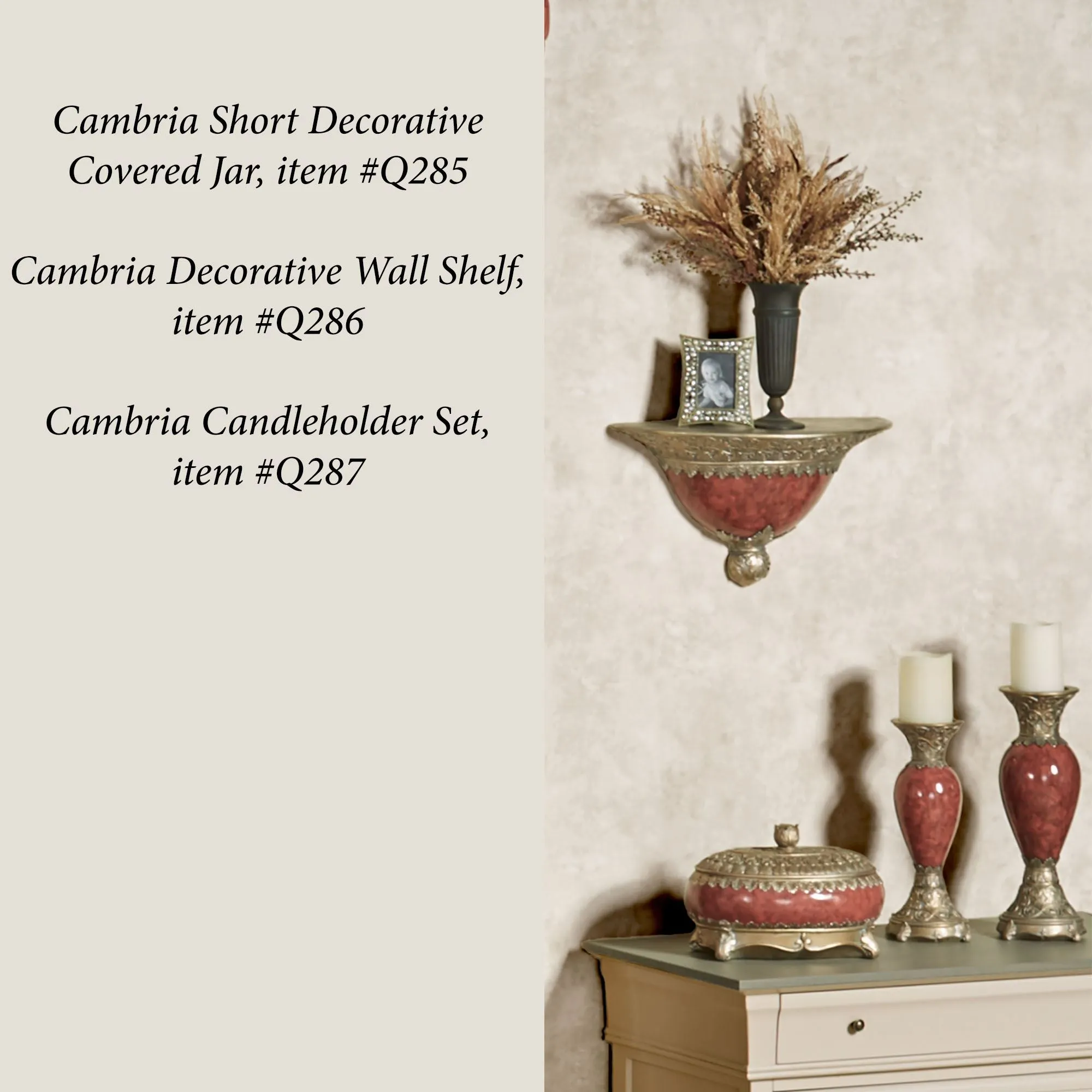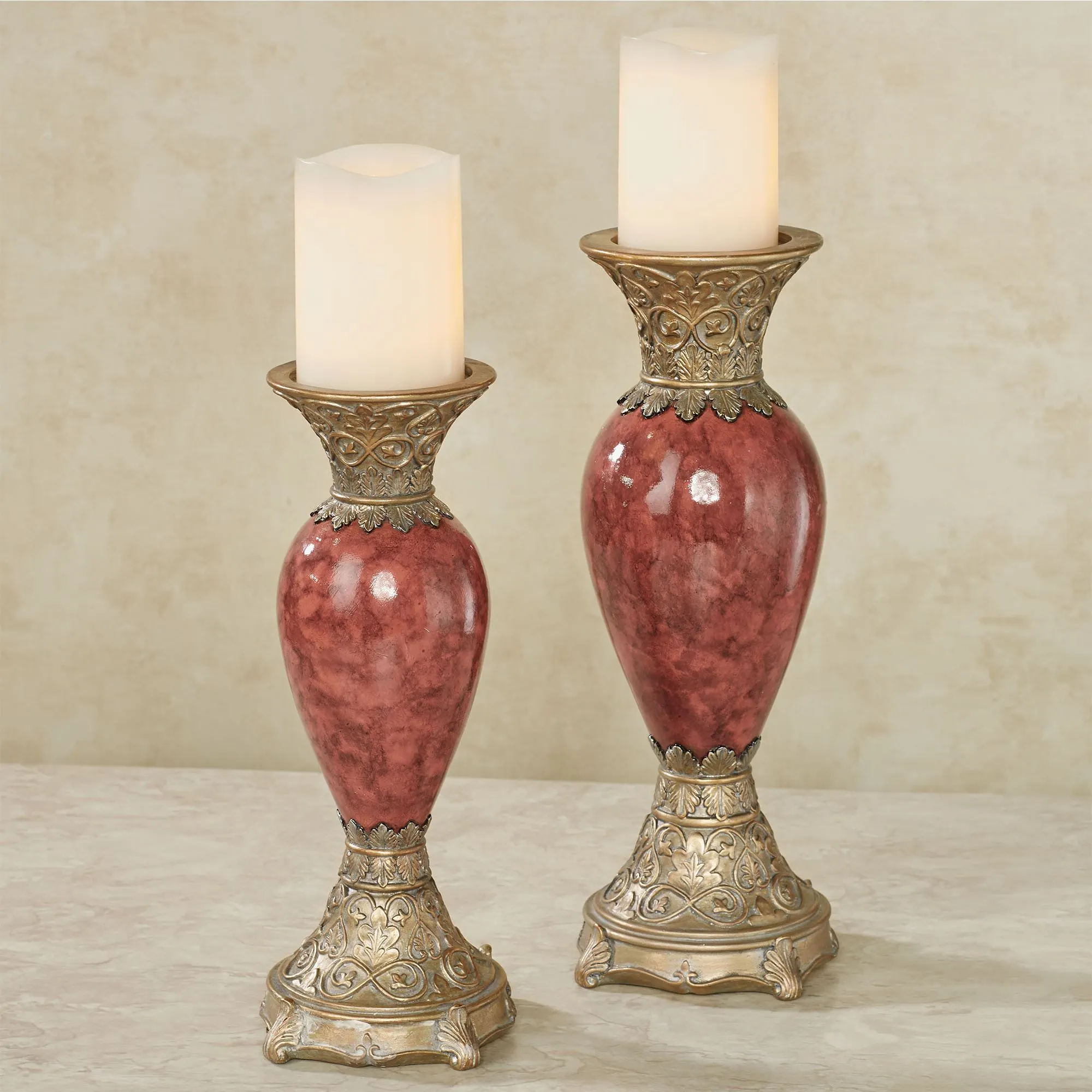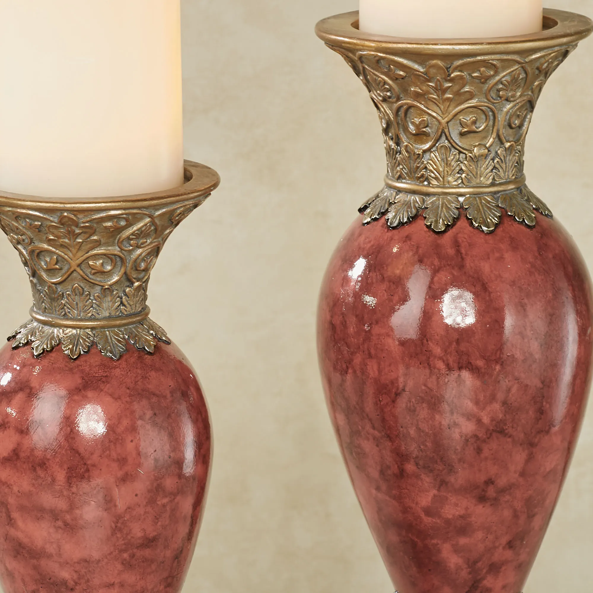 Exquisite detailing refines the Cambria Cinnabar Candleholder Set. Each handpainted resin candleholder features meticulously detailed, champagne gold scrolling leaf designs on the footed base and candlecup. The shaped center contains cinnabar marbled hues for a beautiful accent. Each holds your 3" dia. pillar candle. Small candleholder is 5"dia.x12.5"H; large is 5.5"dia.x14"H.