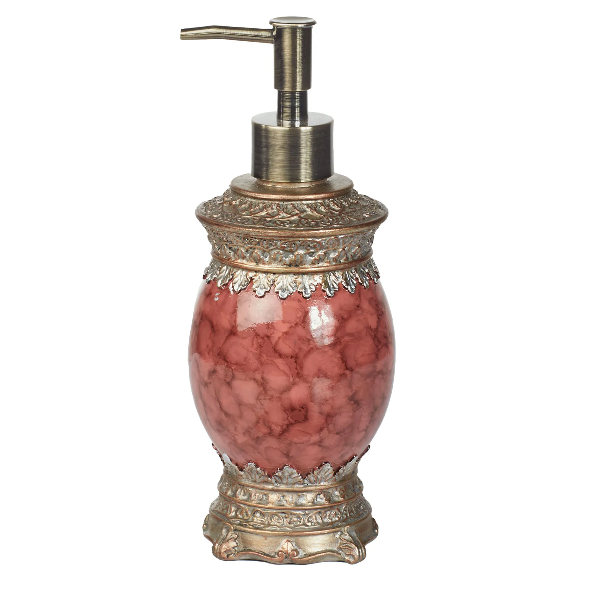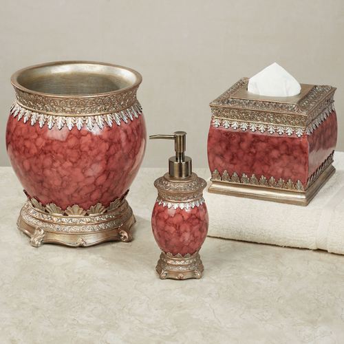 Exquisite detailing adds refined elegance to the Cambria Cinnabar Bath Accessories. Made of resin, these handpainted accessories feature champagne gold scroll and leaf designs and a marbled cinnabar hue. Lotion/Soap Dispenser is 4"Wx4"Dx9"H. Tissue Cover is 6.5"sq.x6"H. Wastebasket is 9"dia.x10"H.