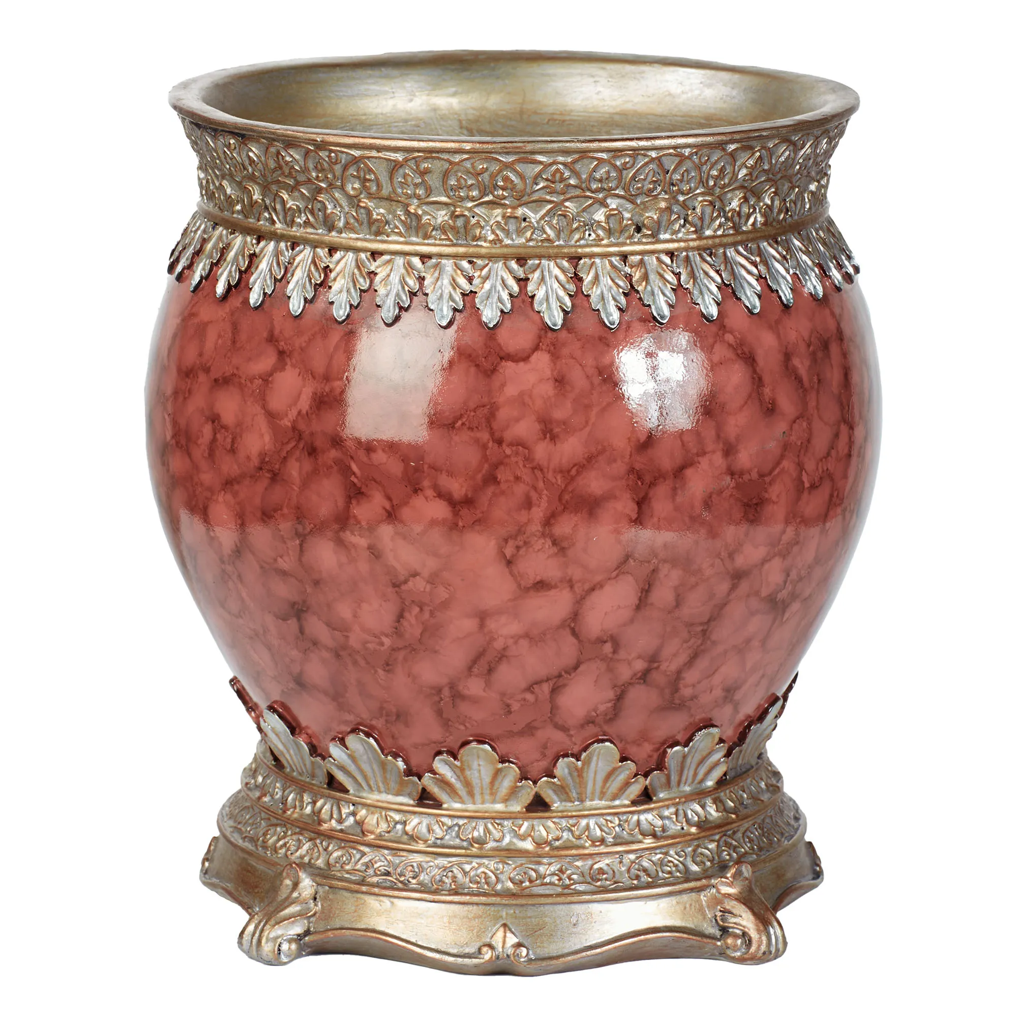 Exquisite detailing adds refined elegance to the Cambria Cinnabar Bath Accessories. Made of resin, these handpainted accessories feature champagne gold scroll and leaf designs and a marbled cinnabar hue. Lotion/Soap Dispenser is 4"Wx4"Dx9"H. Tissue Cover is 6.5"sq.x6"H. Wastebasket is 9"dia.x10"H.