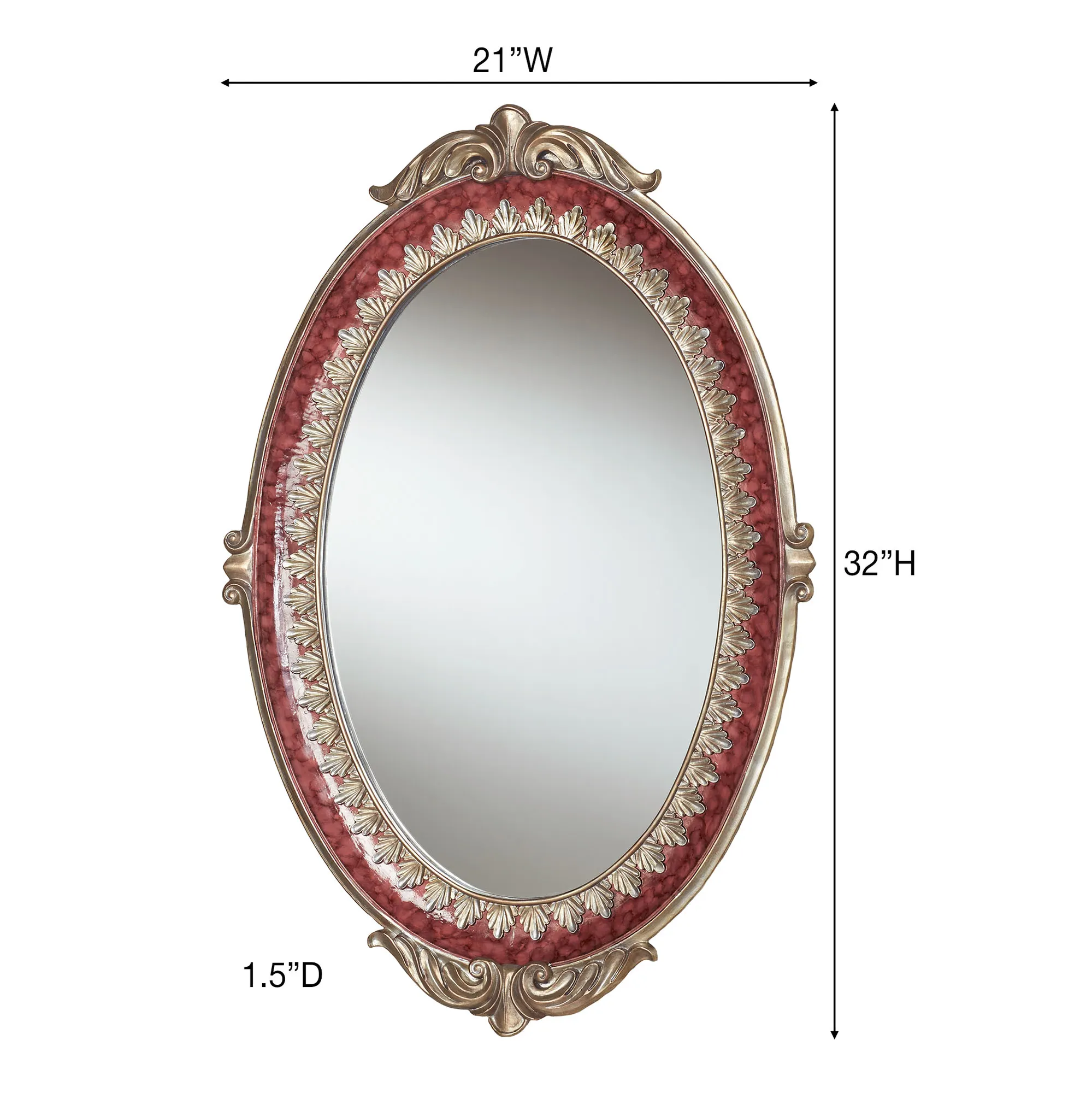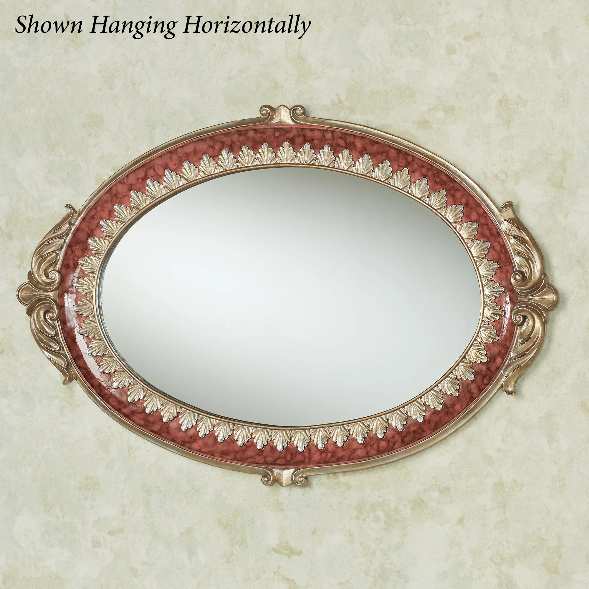 Exquisite detailing adds refined elegance to the Cambria Cinnabar Oval Wall Mirror. This resin wall mirror features handpainted champagne gold scroll and leaf designs, a central glass mirror, and a cinnabar marble-hued border. Oval wall mirror may hang vertically or horizontally. Measures 21"Wx1.5"Dx32"H.