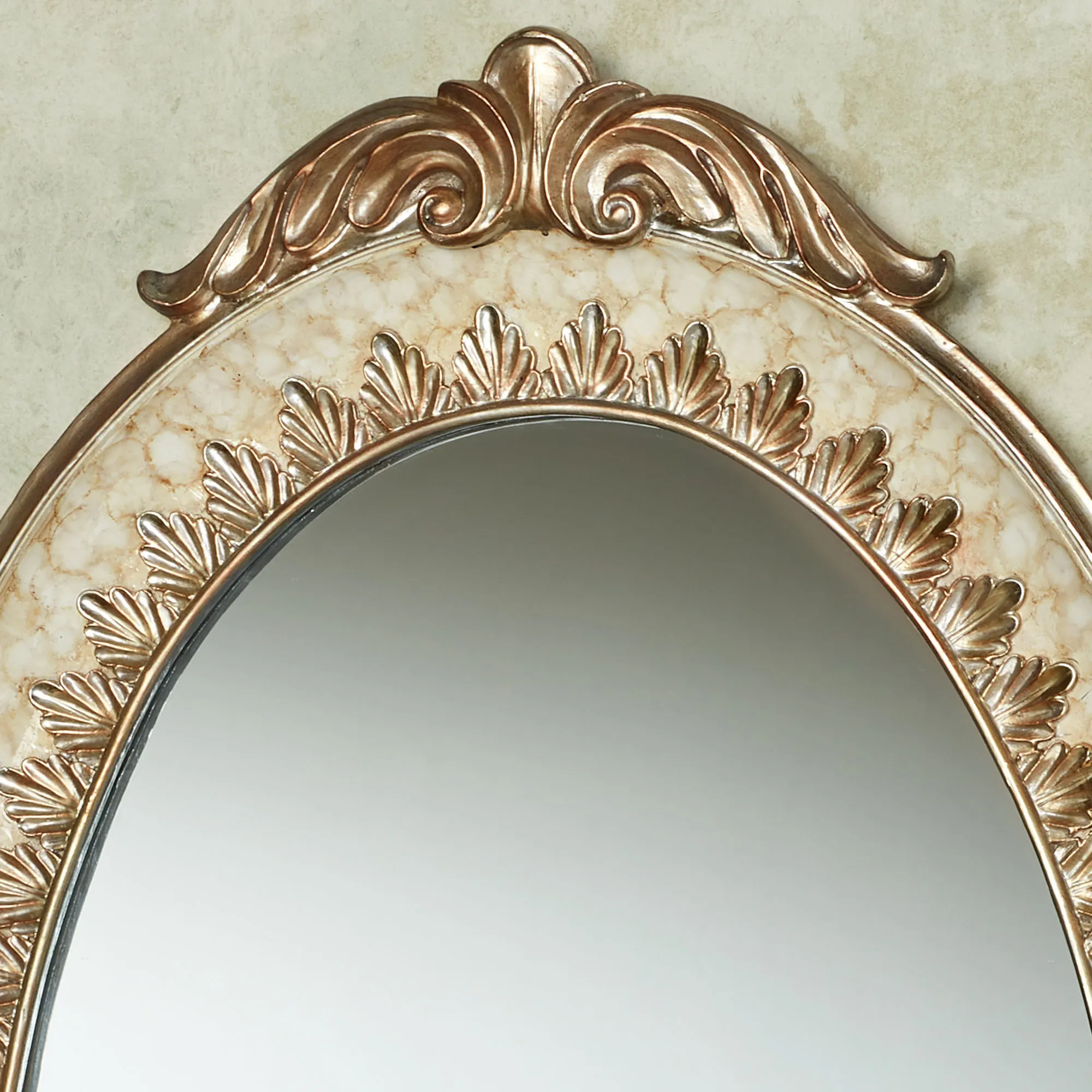 Exquisite detailing adds refined elegance to the Cambria Ivory/Beige Oval Wall Mirror. This resin wall mirror features handpainted champagne gold scroll and leaf designs, a central glass mirror, and an ivory and beige marble-hued border. Oval wall mirror may hang vertically or horizontally. Measures 21"Wx1.5"Dx32"H.