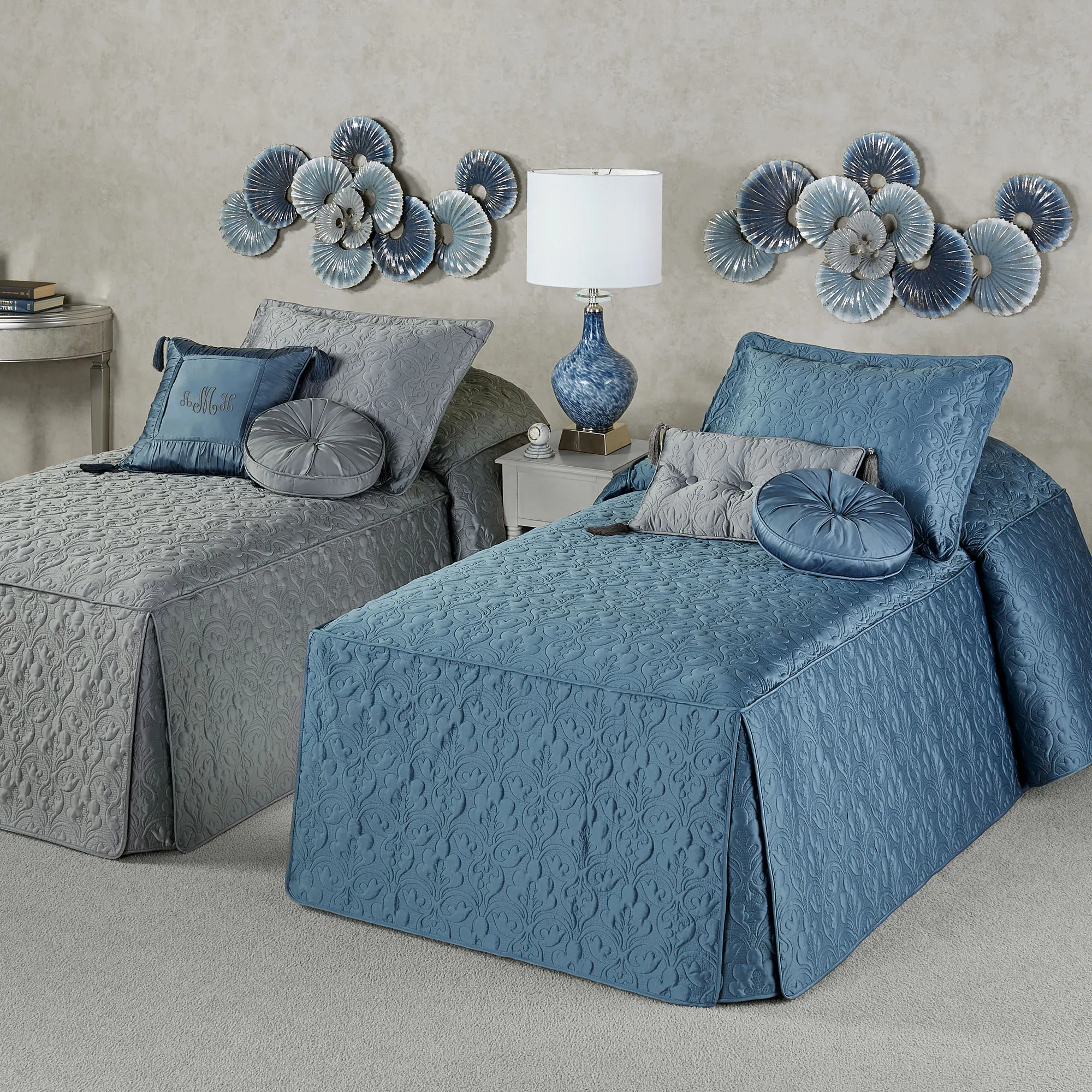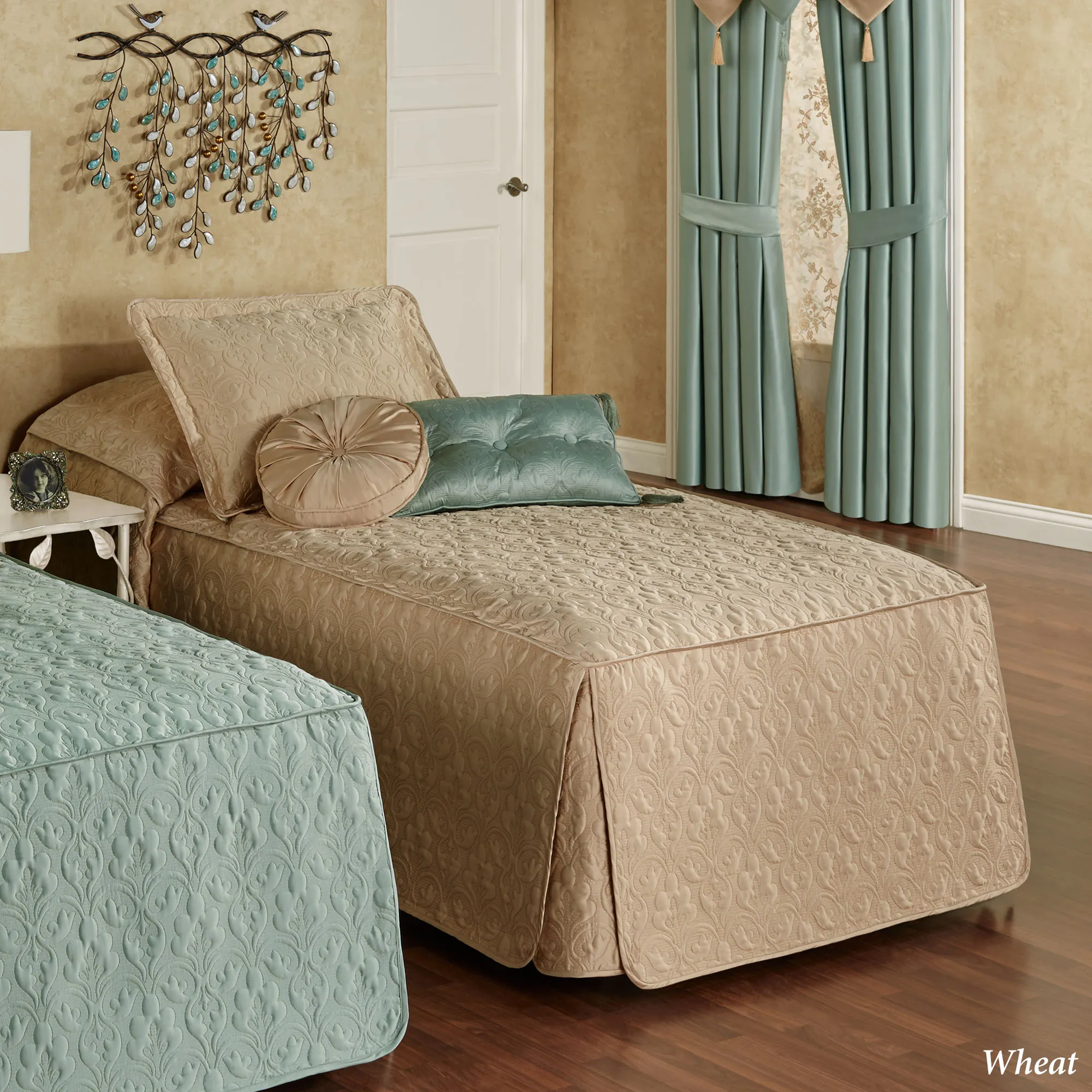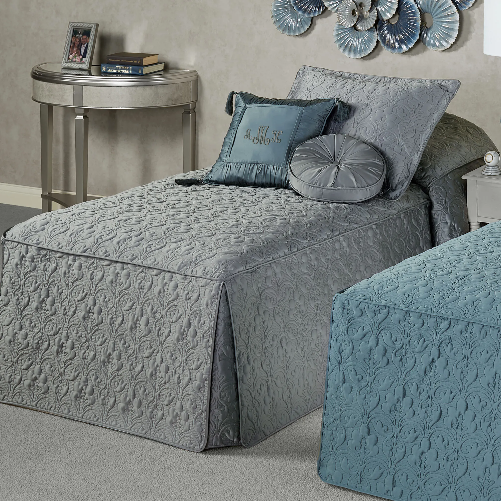 The Cambridge Classics Fitted Bedspread features a luxuriously quilted damask design. The solid color, polyester microfiber satin bedspread has an ornate pattern and dimensional texture. Fitted bedspread has split, gusseted corners. Classic sizes have a 21" drop. Classic Twin size fits an Extra-Long Twin bed. Specify Aqua Mist, Blue Shadow, Cinnabar, Golden Bronze, Mink, Warm Gray, or Wheat. Back is color-matched, brushed polyester microfiber. Bedding fill is polyester. Machine washable. Imported.