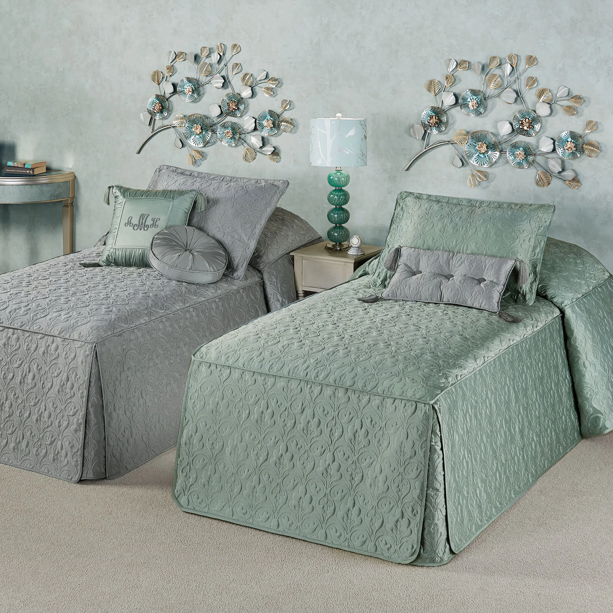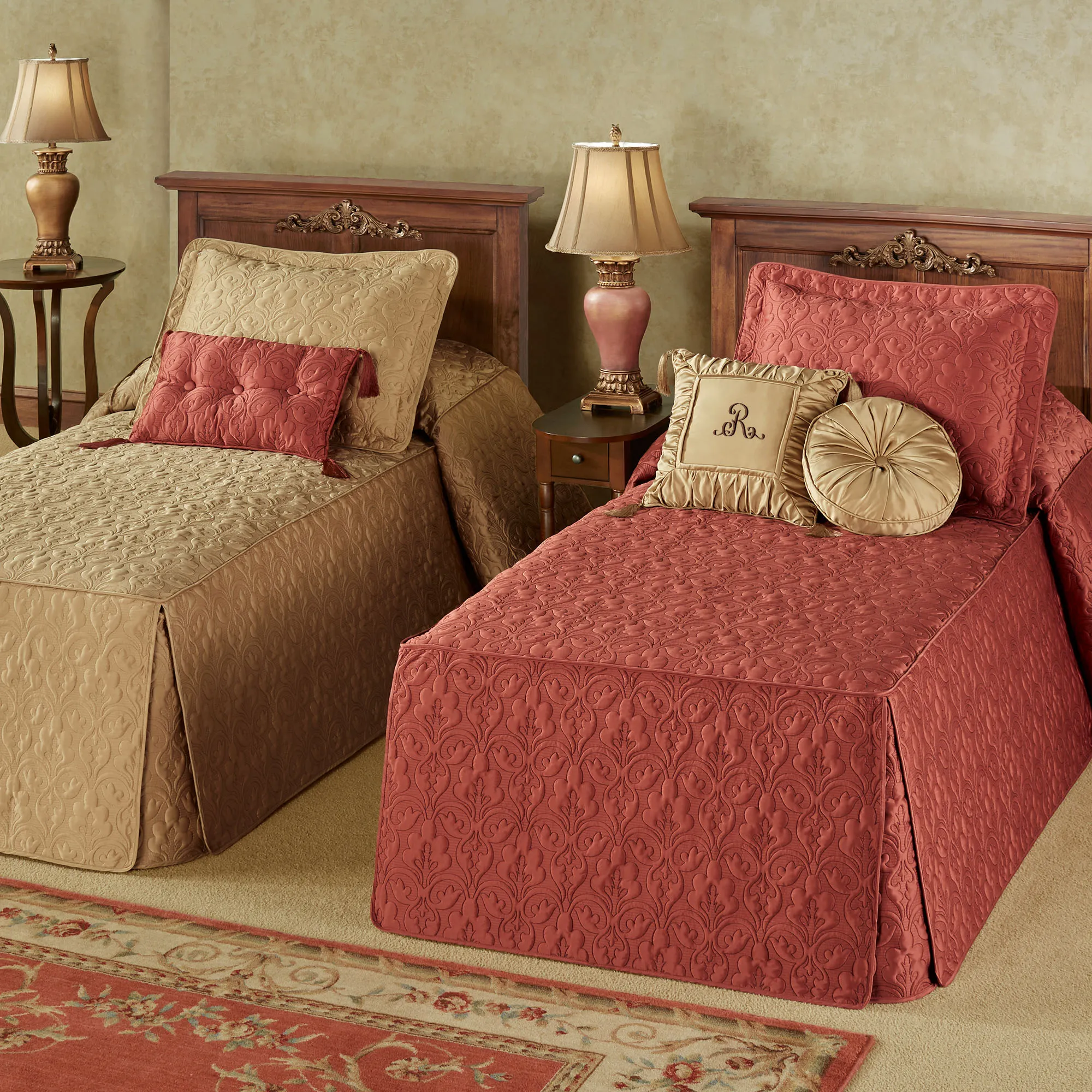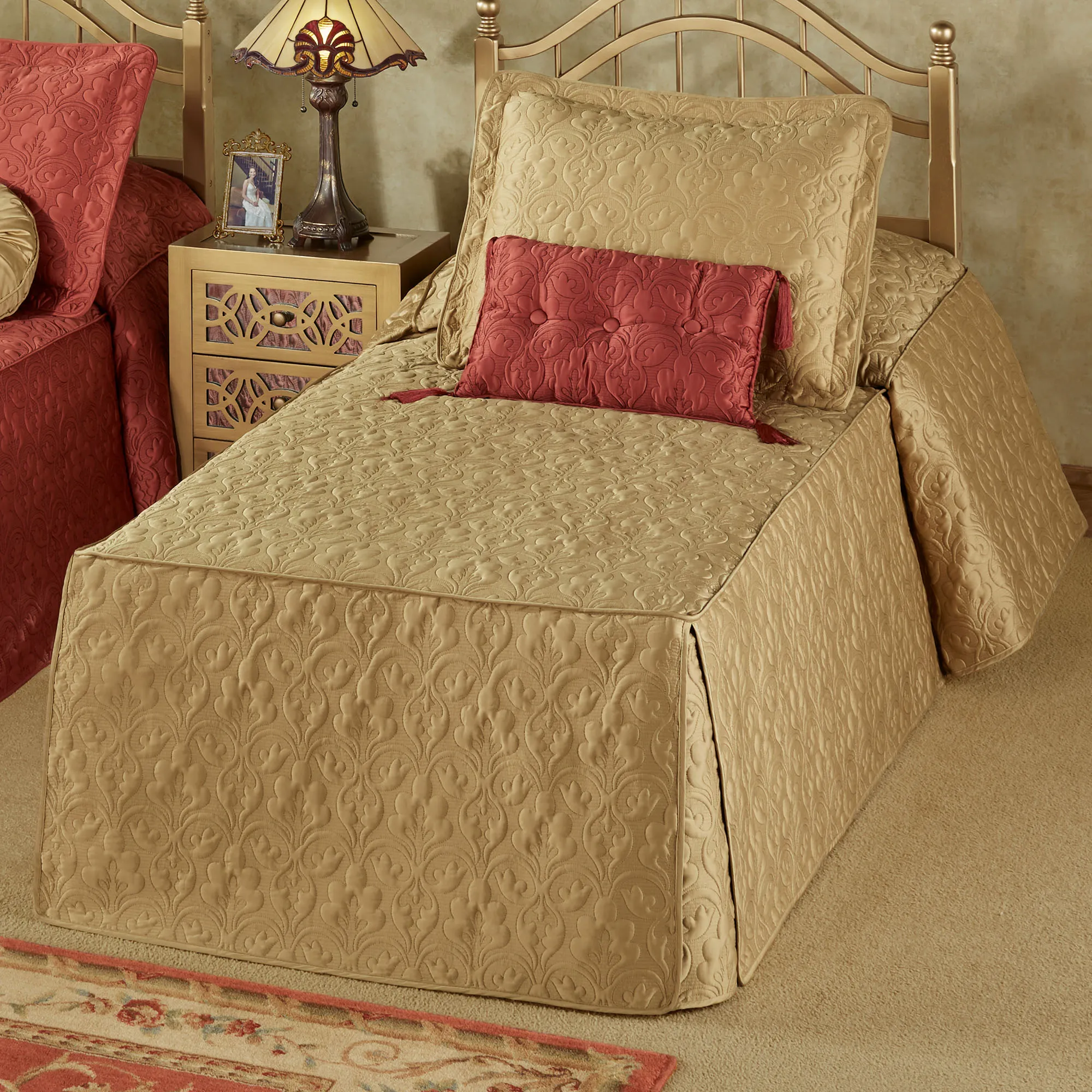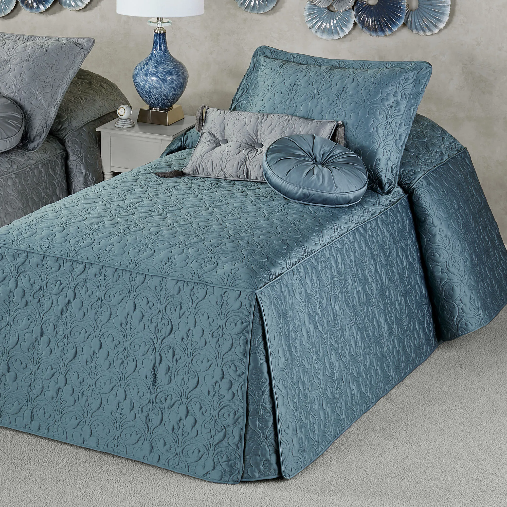 The Cambridge Classics Fitted Bedspread features a luxuriously quilted damask design. The solid color, polyester microfiber satin bedspread has an ornate pattern and dimensional texture. Fitted bedspread has split, gusseted corners. Classic sizes have a 21" drop. Classic Twin size fits an Extra-Long Twin bed. Specify Aqua Mist, Blue Shadow, Cinnabar, Golden Bronze, Mink, Warm Gray, or Wheat. Back is color-matched, brushed polyester microfiber. Bedding fill is polyester. Machine washable. Imported.