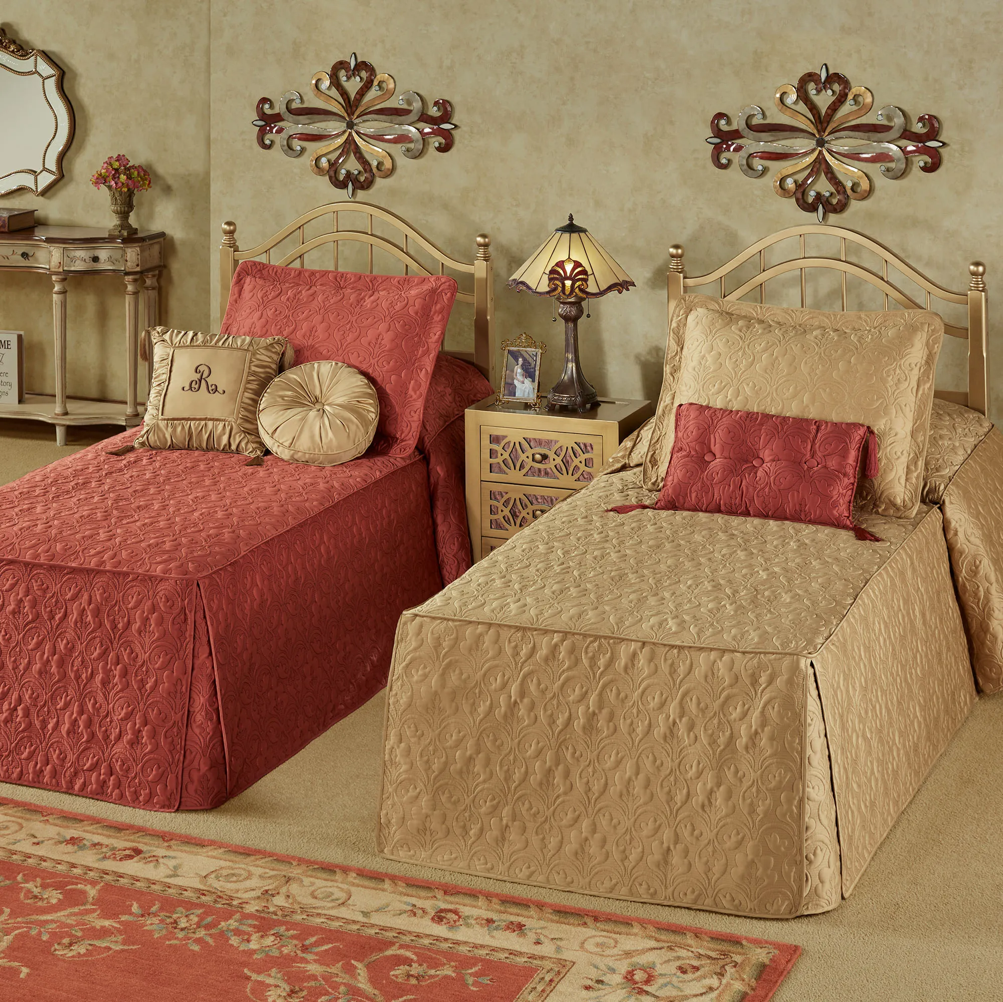 The Cambridge Classics Bedding is adorned with an elegant display of a luxuriously quilted damask design. This solid color, polyester microfiber satin ensemble has an ornate pattern and dimensional texture. Specify Aqua Mist, Blue Shadow, Cinnabar, Golden Bronze, Mink, Warm Gray, or Wheat.