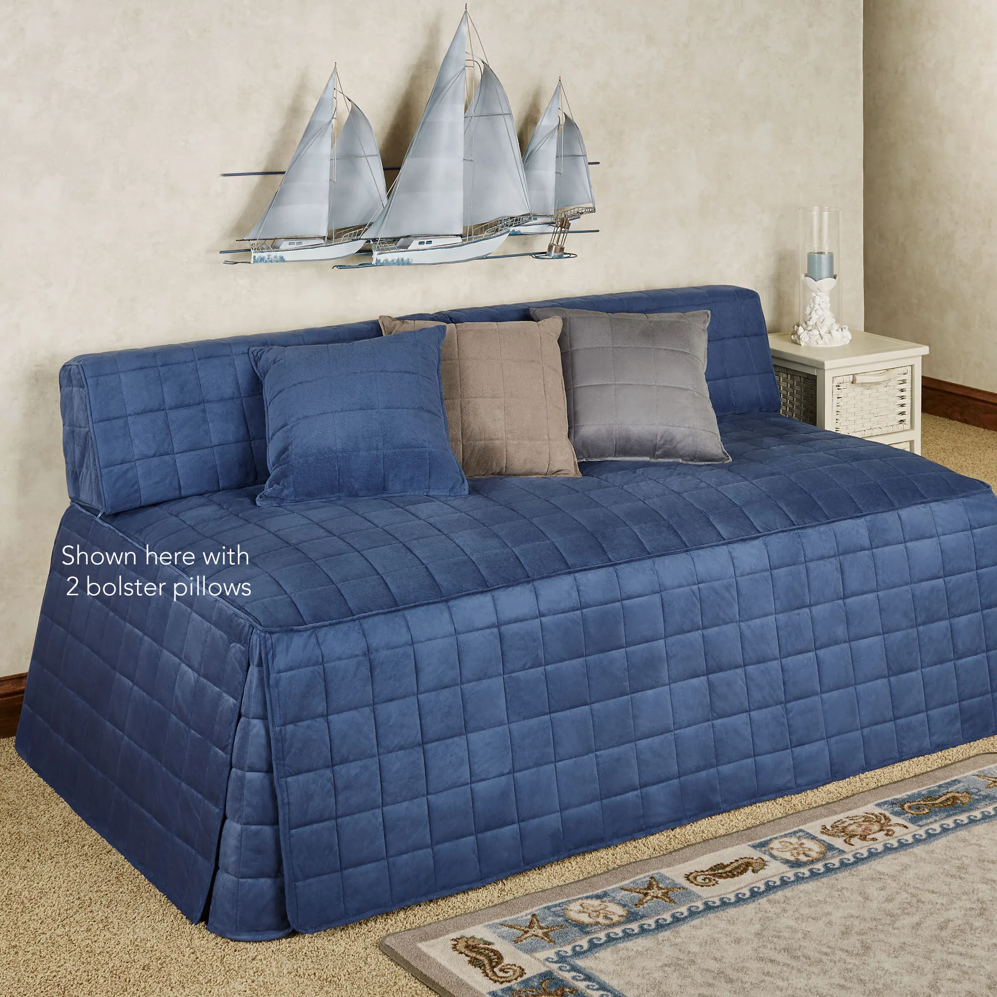 Sofa by day... Bed by night! The Camden Indigo Fitted Hollywood Daybed Cover has a relaxed look and clean lines. Cover features the lavishly soft, smooth feel of polyester faux suede and a timeless box-quilted design. Use the fitted Hollywood daybed cover for extra seating or bedding. Cover has gusseted, split-inset corners in the three-sided, 21" drop; a cap on back keeps it in place. Backing is color-matched cotton. Fill is polyester. Washable. Imported. Two bolster pillows are shown on the Hollywood/daybed cover.