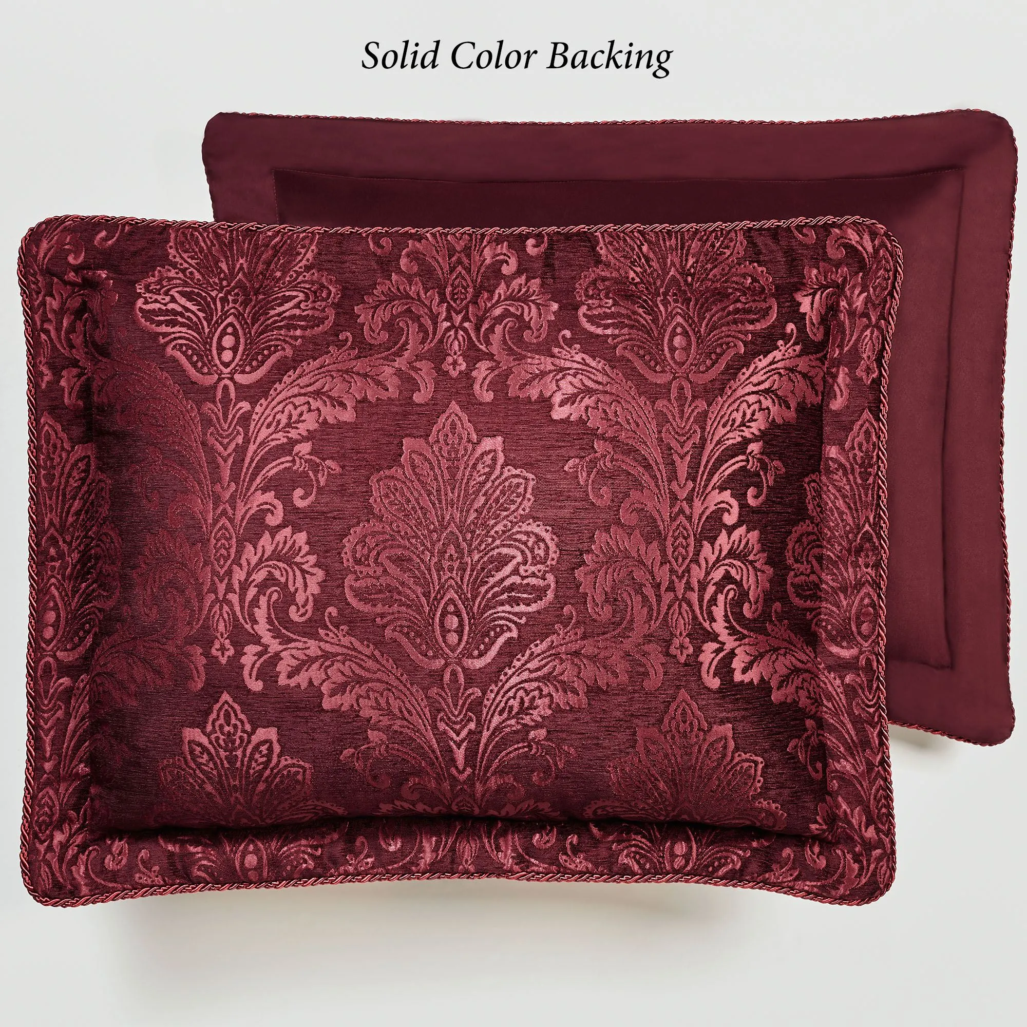 The burgundy Camelot Bedding enhances the bedroom with a regal state of elegance. This lavish jacquard-woven polyester chenille ensemble features luxurious matte satin damask designs.