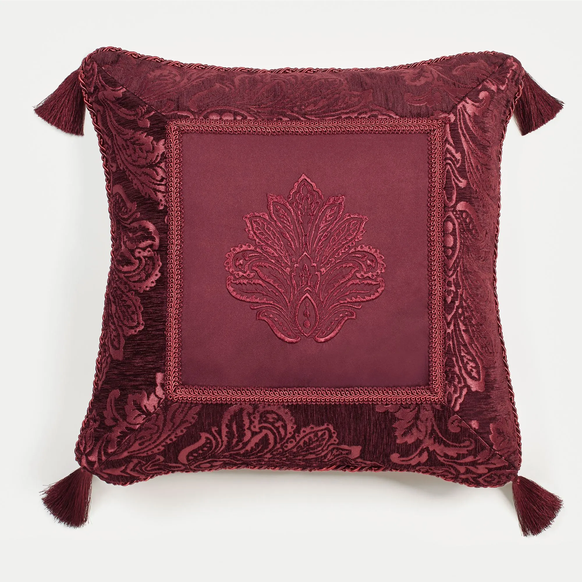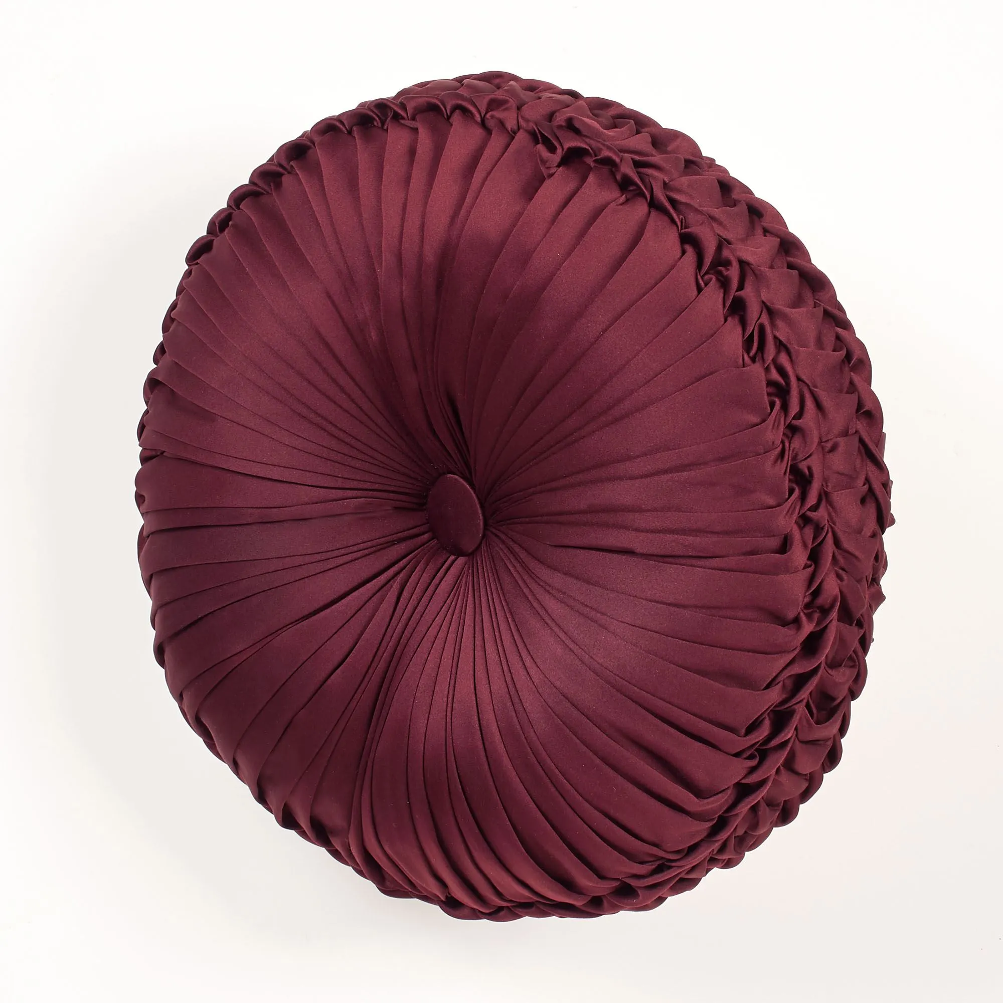 Pillows: Spot clean. The pleated, solid color reversible Round has a central button tuft and 4" side gusset. Square has damask embroidery, matte satin designs on jacquard-woven chenille, gimp trim, twist cording, and corner tassels. The pieced Rectangle has matte satin designs on jacquard-woven chenille, gimp trim, shirred sides, and 3" fringe on the length ends. The corded, polyester matte satin Christmas Square features an embroidered design of "Merry Christmas," green holly leaves, and red berries. Specify Burgundy, Emerald Green, Ivory, or Navy.