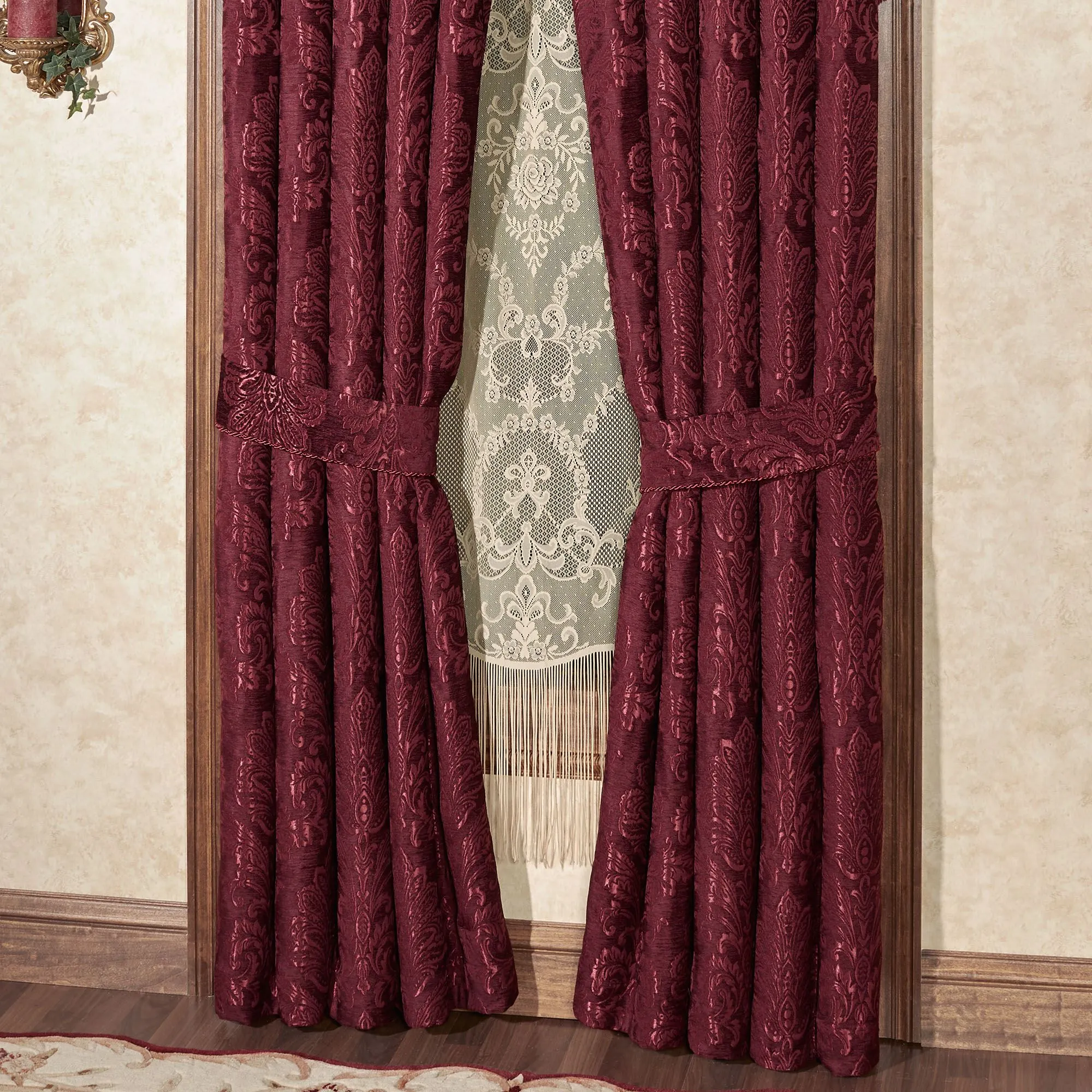 Window Treatment has matte satin designs on jacquard-woven chenille and 3" rod pockets. Tailored, lined Curtains include tiebacks with twist cording accents. Curtains are available in two lengths. Wide Empire Valance has gimp trim and 3" brushed fringe on the ends. One empire valance best fits a 32"W-42"W window. Purchase multiple empire valances for wider windows. The 110"W measurement is when the valance is flat, not hung. Scalloped Valance has a solid color bottom and gimp trim.