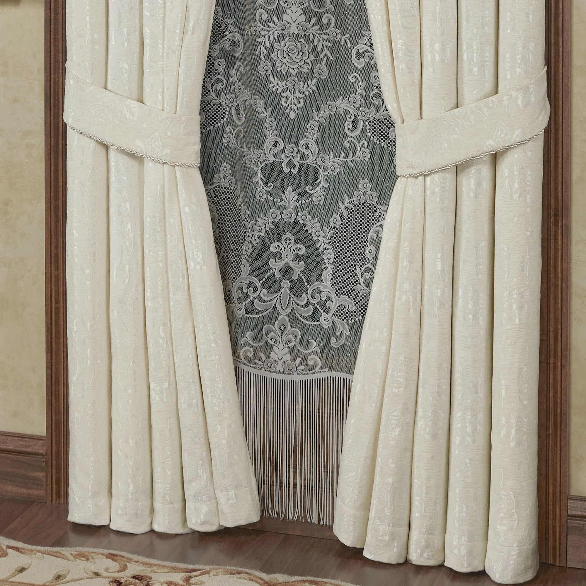 Window Treatment has matte satin designs on jacquard-woven chenille and 3" rod pockets. Tailored, lined Curtains include tiebacks with twist cording accents. Curtains are available in two lengths. Wide Empire Valance has gimp trim and 3" brushed fringe on the ends. One empire valance best fits a 32"W-42"W window. Purchase multiple empire valances for wider windows. The 110"W measurement is when the valance is flat, not hung. Scalloped Valance has a solid color bottom and gimp trim.