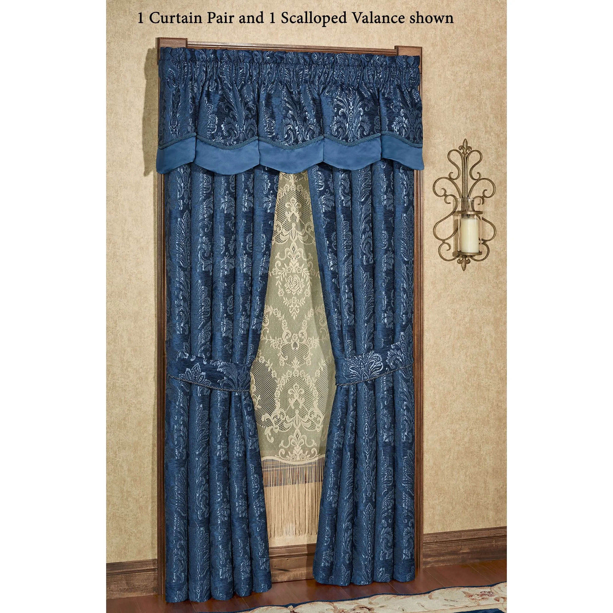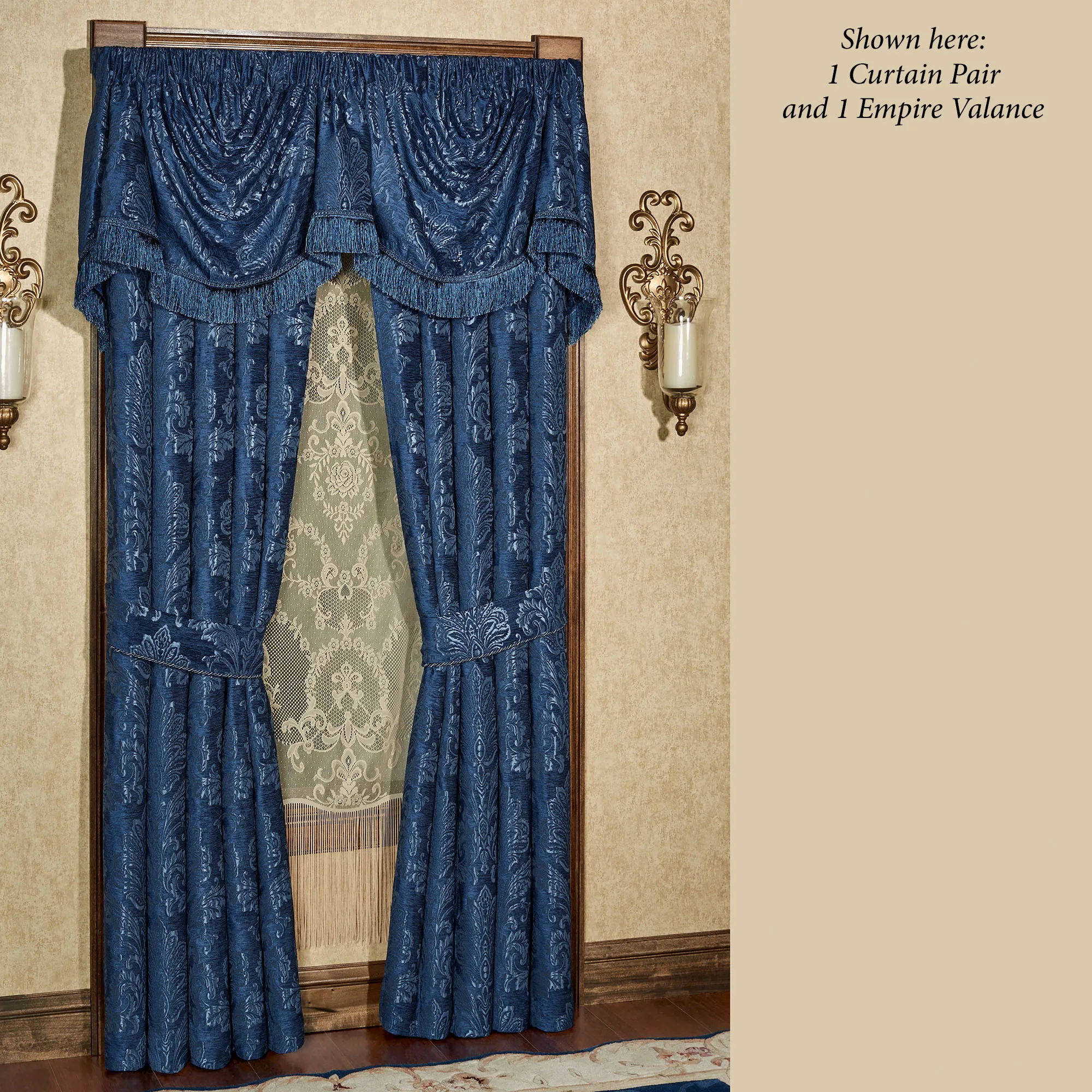 Window Treatment has matte satin designs on jacquard-woven chenille and 3" rod pockets. Tailored, lined Curtains include tiebacks with twist cording accents. Curtains are available in two lengths. Wide Empire Valance has gimp trim and 3" brushed fringe on the ends. One empire valance best fits a 32"W-42"W window. Purchase multiple empire valances for wider windows. The 110"W measurement is when the valance is flat, not hung. Scalloped Valance has a solid color bottom and gimp trim.