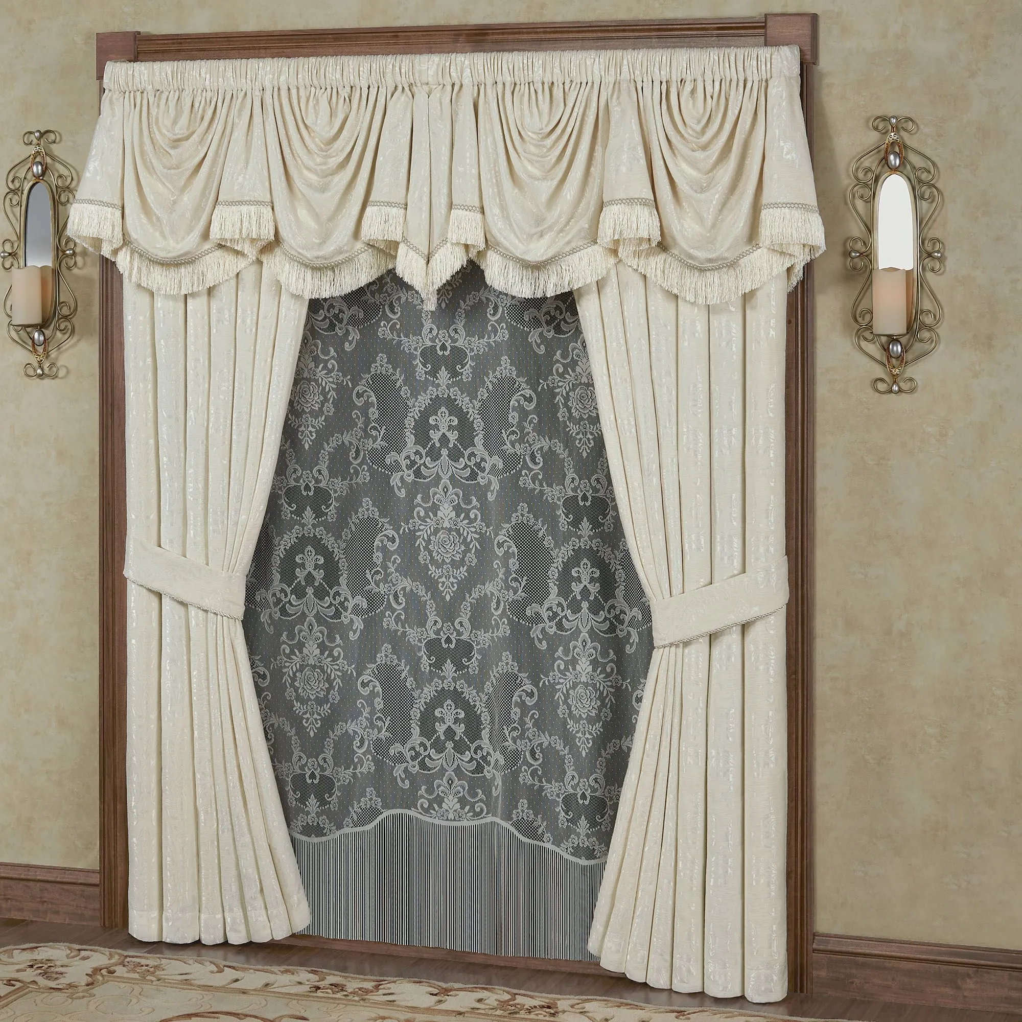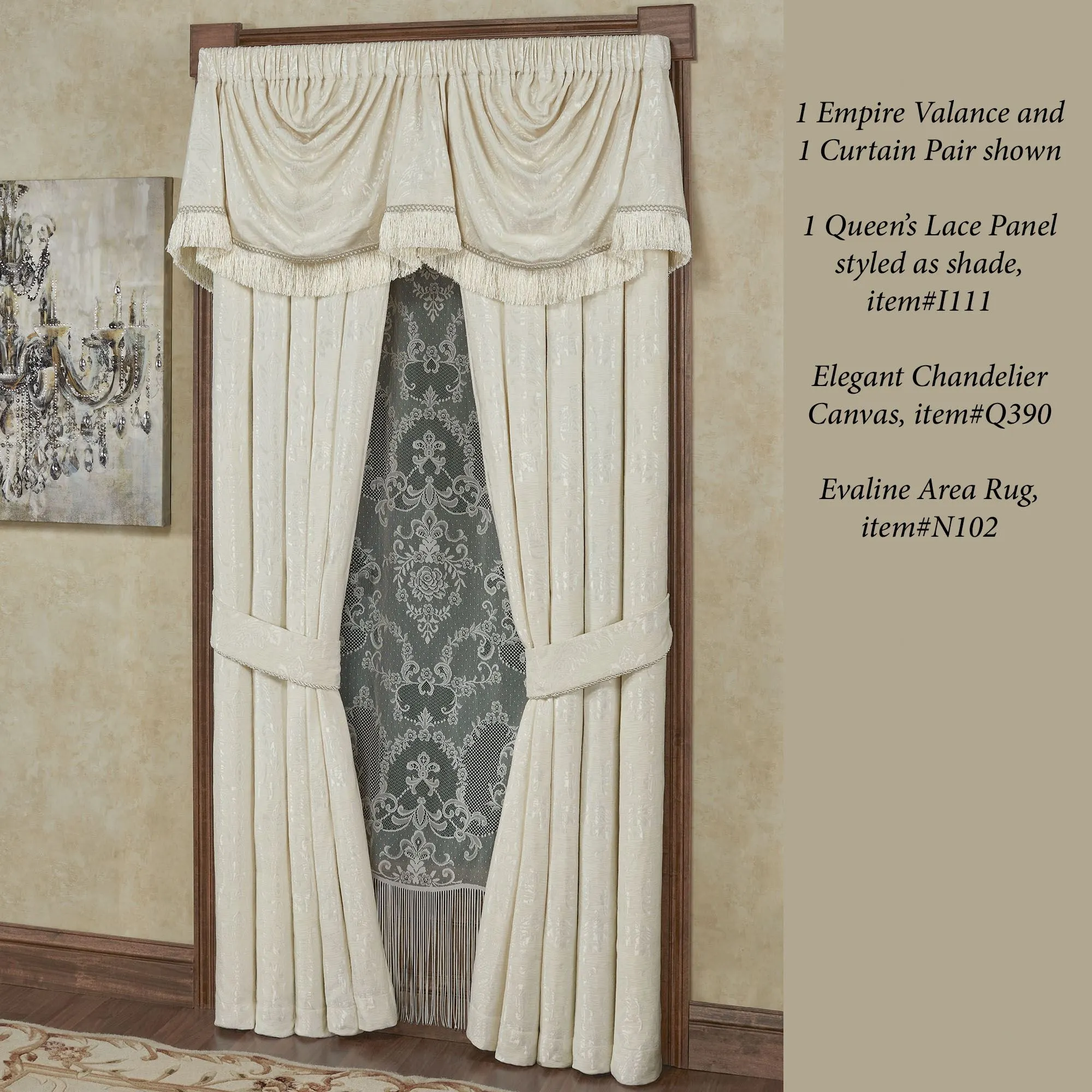 The ivory Camelot Window Treatment will enhance your room with regal elegance. Lavish window treatment features matte satin damask designs on jacquard-woven polyester chenille; rod pockets are 3". Specify Empire Valance or Curtain Pair. Wide Empire Valance has gimp trim and 3" brushed fringe on the ends. One empire valance best fits a 32"W-42"W window. Purchase multiple empire valances for wider windows. The 110"W measurement is when the valance is flat, not hung. Tailored, lined Curtains include tiebacks with twist cording accents. Machine washable. Imported. One curtain pair is shown in the main image. For extra fullness on wide windows, we suggest using two curtain pairs. The curtain pair width is the total width of two panels together.