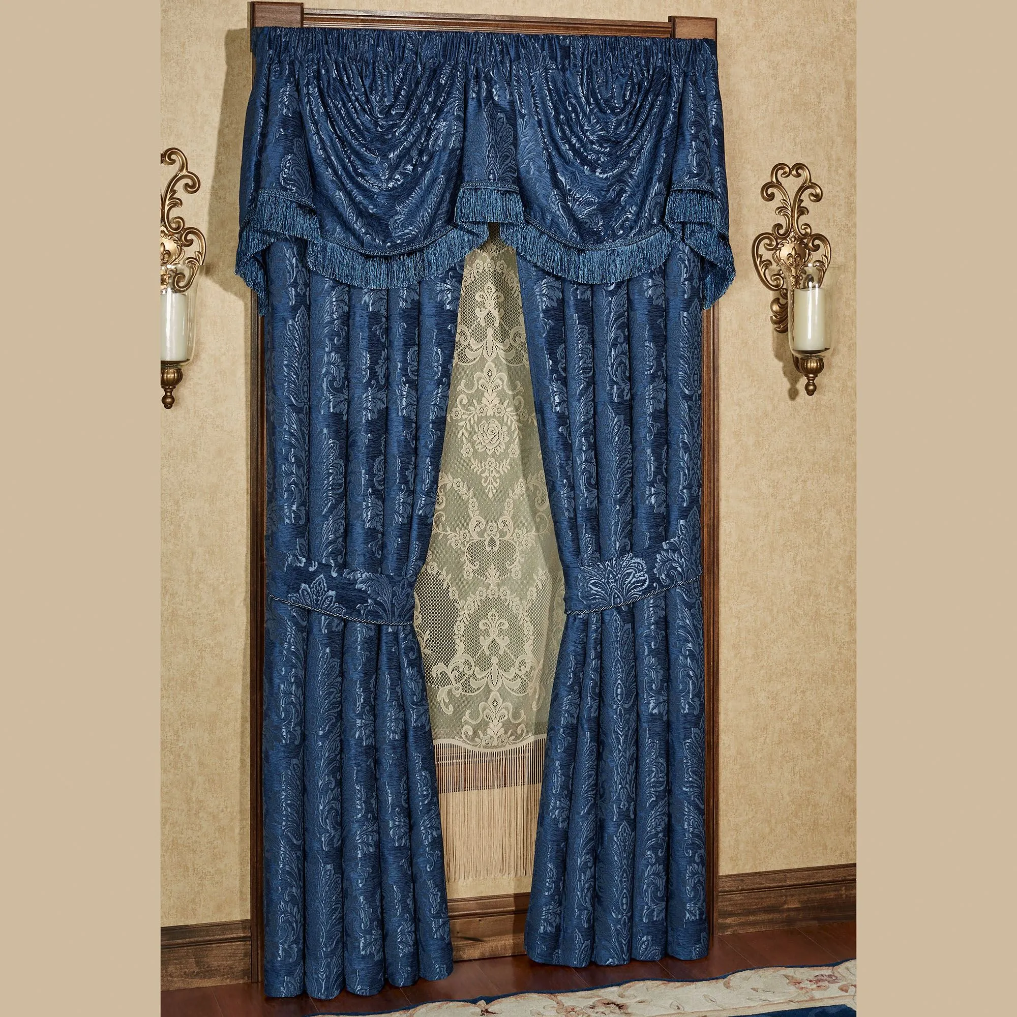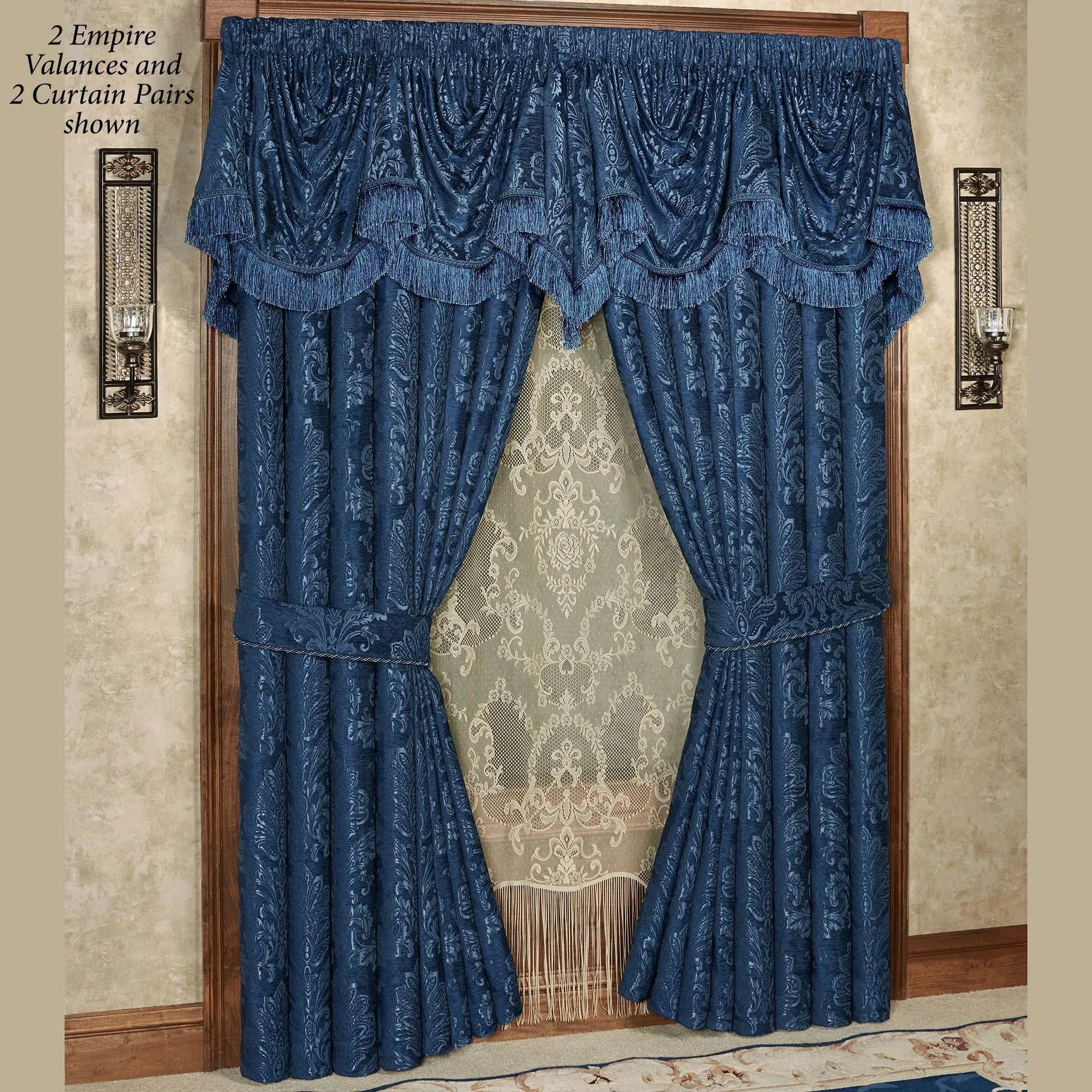 The navy Camelot Window Treatment will enhance your room with regal elegance. Lavish window treatment features matte satin damask designs on jacquard-woven polyester chenille; rod pockets are 3". Specify Empire Valance or Curtain Pair. Wide Empire Valance has gimp trim and 3" brushed fringe on the ends. One empire valance best fits a 32"W-42"W window. Purchase multiple empire valances for wider windows. The 110"W measurement is when the valance is flat, not hung. Tailored, lined Curtains include tiebacks with twist cording accents. Machine washable. Imported. The curtain pair width is the total width of two panels together.