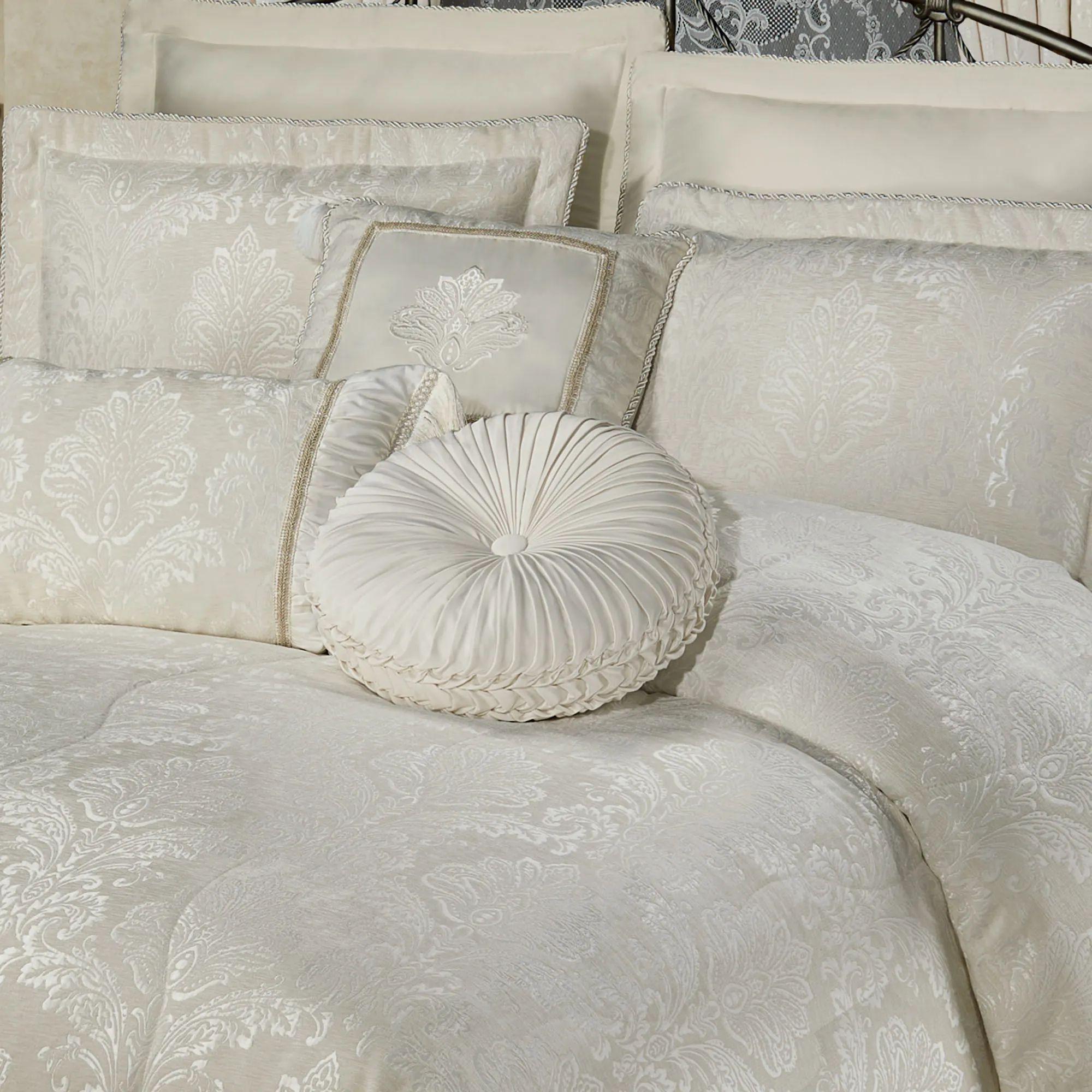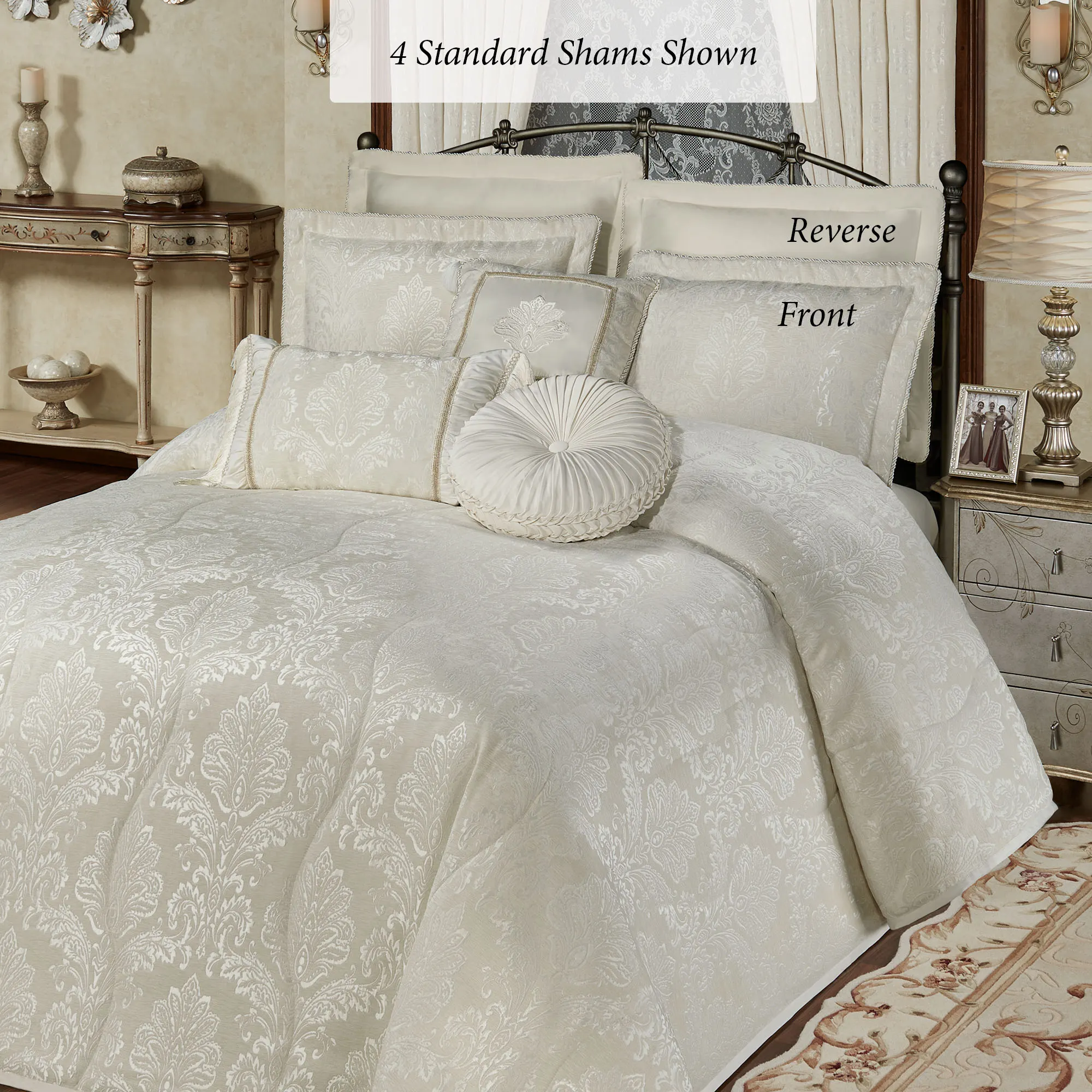 The ivory Camelot Bedding enhances the bedroom with a regal state of elegance. This lavish jacquard-woven polyester chenille ensemble features luxurious matte satin damask designs.