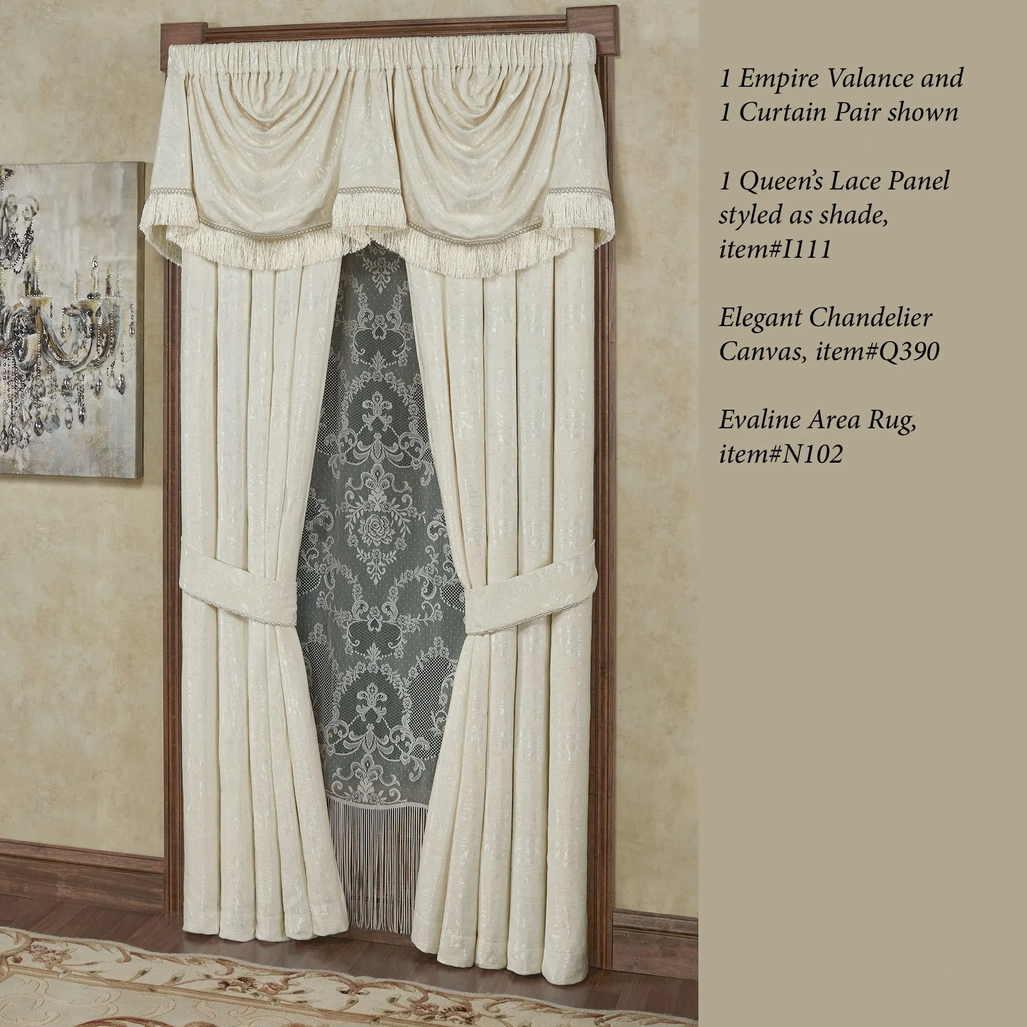 Window Treatment has matte satin designs on jacquard-woven chenille and 3" rod pockets. Tailored, lined Curtains include tiebacks with twist cording accents. Curtains are available in two lengths. Wide Empire Valance has gimp trim and 3" brushed fringe on the ends. One empire valance best fits a 32"W-42"W window. Purchase multiple empire valances for wider windows. The 110"W measurement is when the valance is flat, not hung. Scalloped Valance has a solid color bottom and gimp trim.