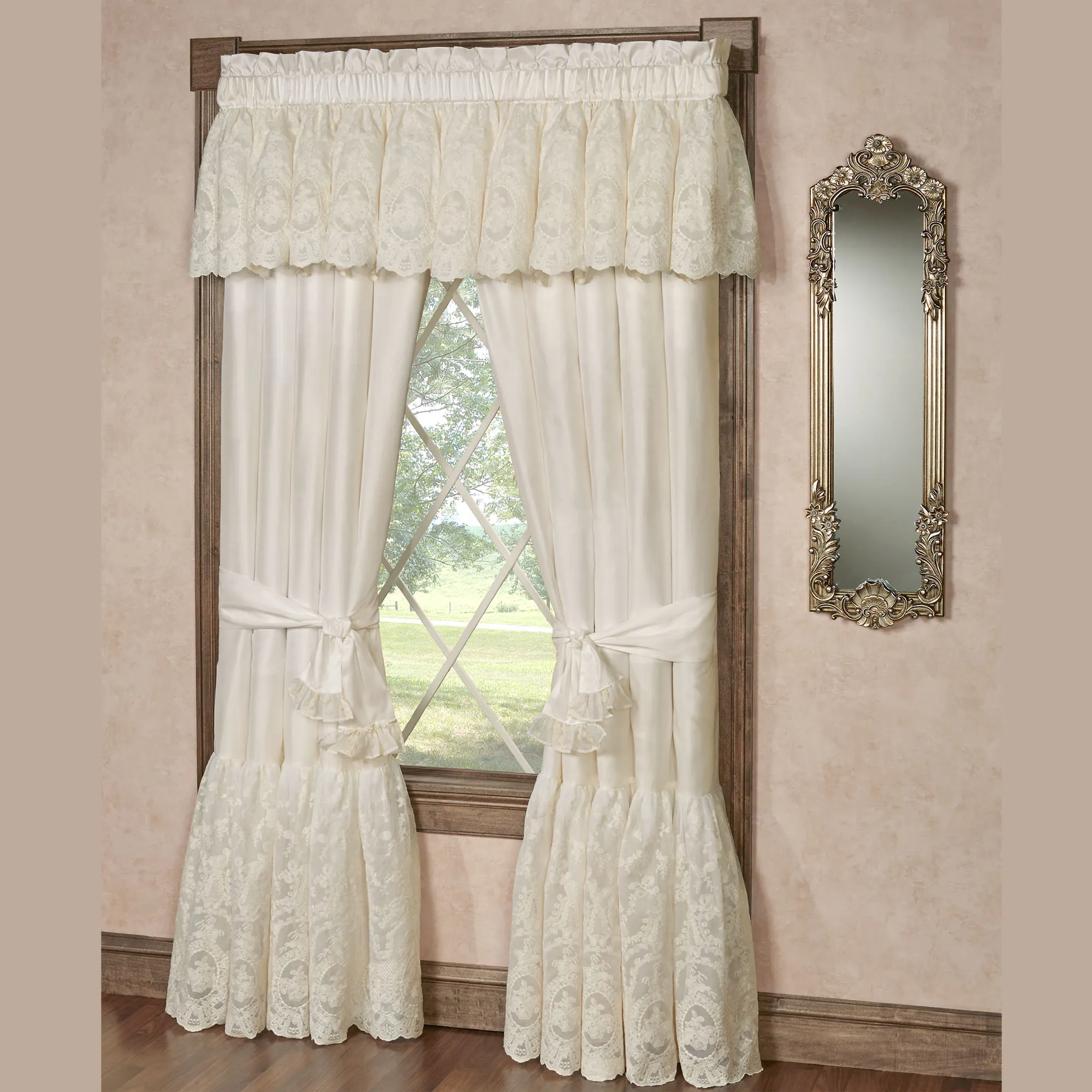 Resembling an antique heirloom, the Cameo Lace Window Treatment defines luxury with its intricate vintage lace-like patterns. This polyester window treatment is sure to add a touch of elegance in any setting. Specify Curtain Pair or Tailored Valance. Lined Curtains are pearl faux silk at the top; the ruffled bottom has delicate lace-like embroidered floral cameo motifs on sheer voile atop a pearl faux silk underlay. Rod pocket is 3". Tiebacks are included. Tailored Valance has lace-like embroidery atop a faux silk underlay. Rod pocket is 3". Machine washable. Imported. The curtain pair width is the total width of two panels together.