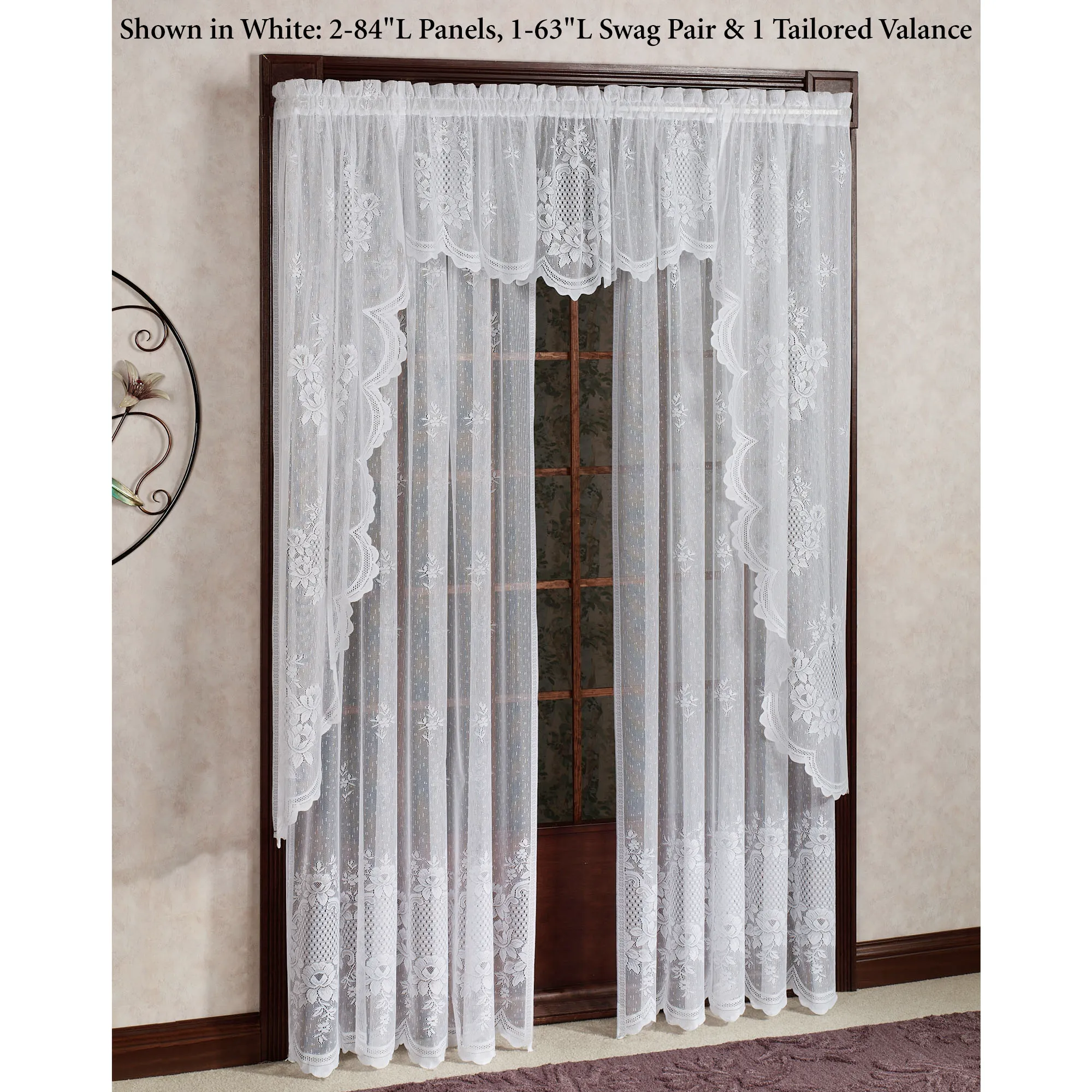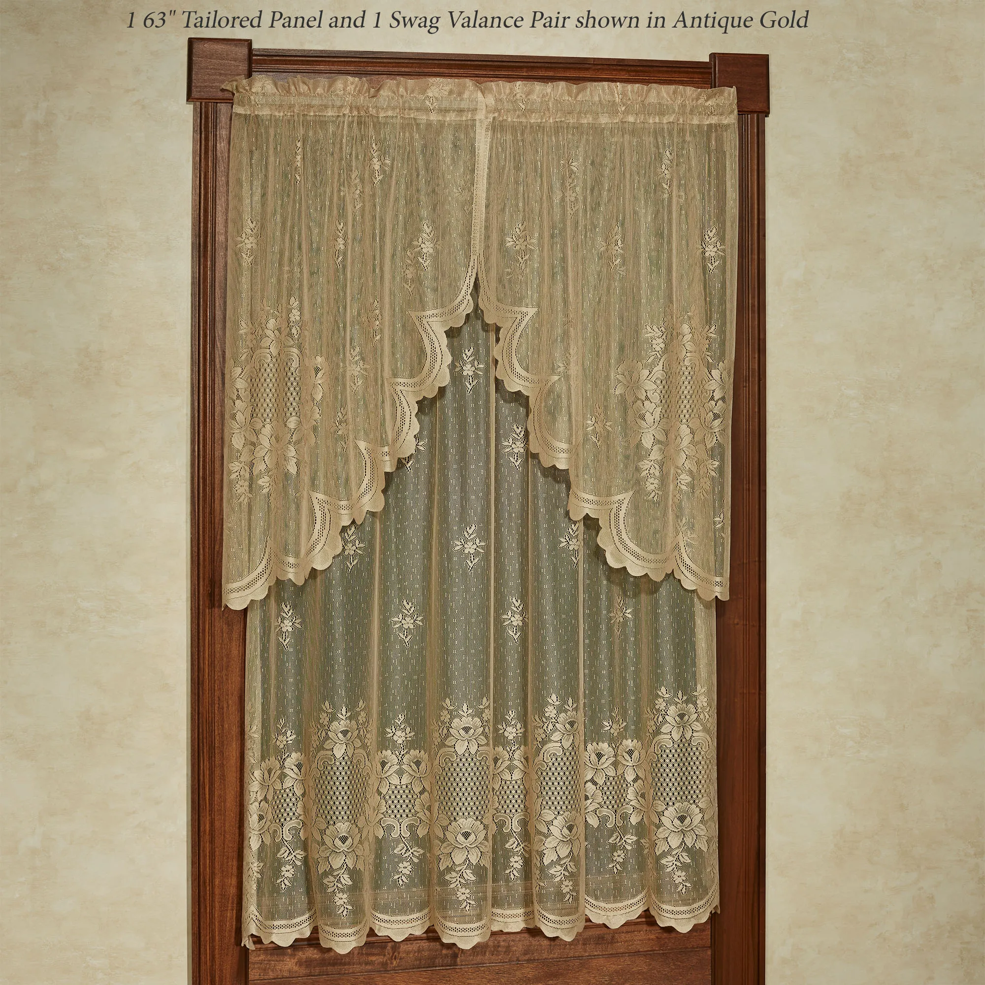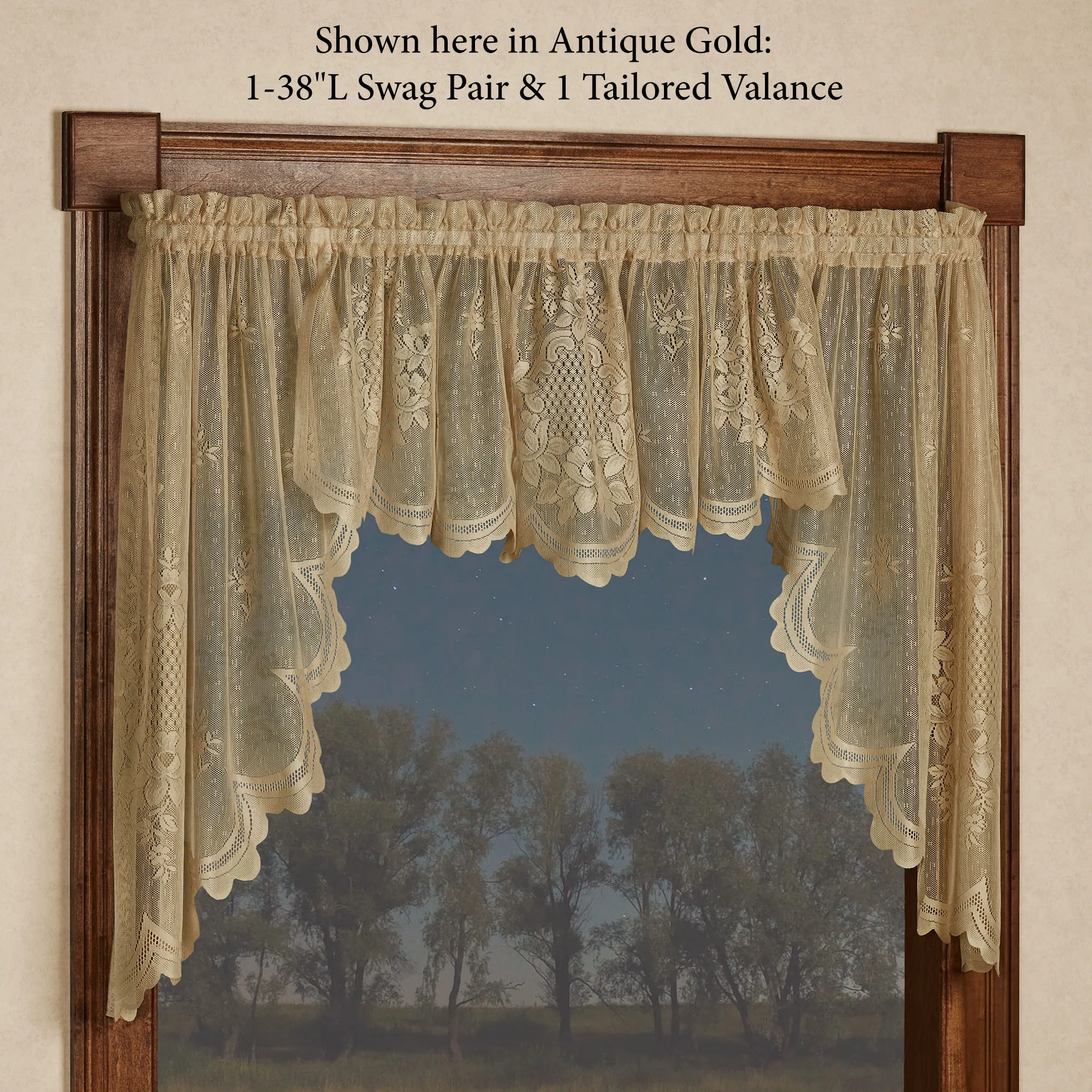 The 100% polyester Cameo Rose Lace Window Treatment has a traditional lace motif and nicely textured ground. Petite floral bouquets complement large rose cameos. Lace window treatment also features a scalloped bottom edge and decorative selvedge sides. Specify Lace Curtain Panel, Swag Valance Pair, or Tailored Valance. Window treatment has 1.75" rod pockets. Machine washable. Imported.
