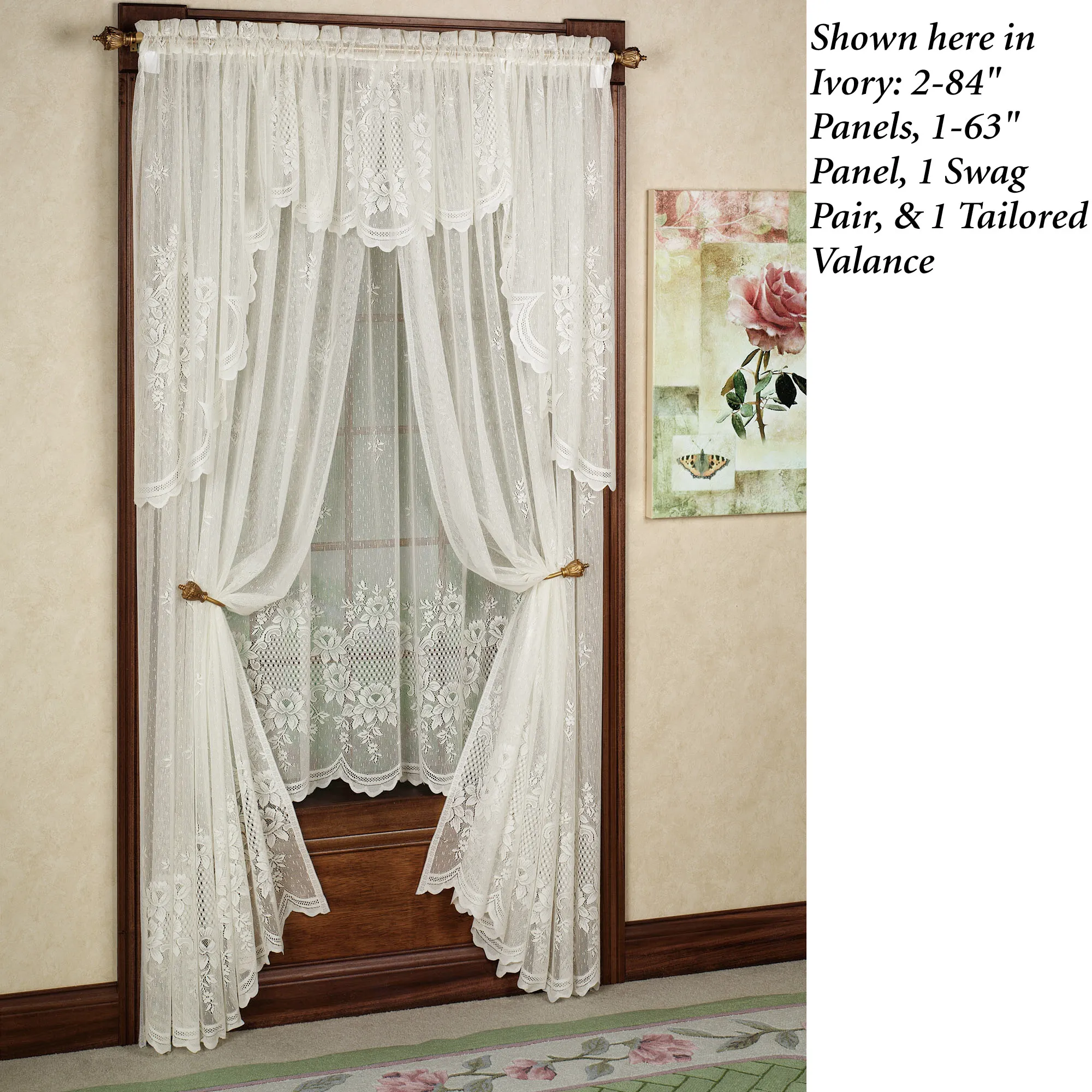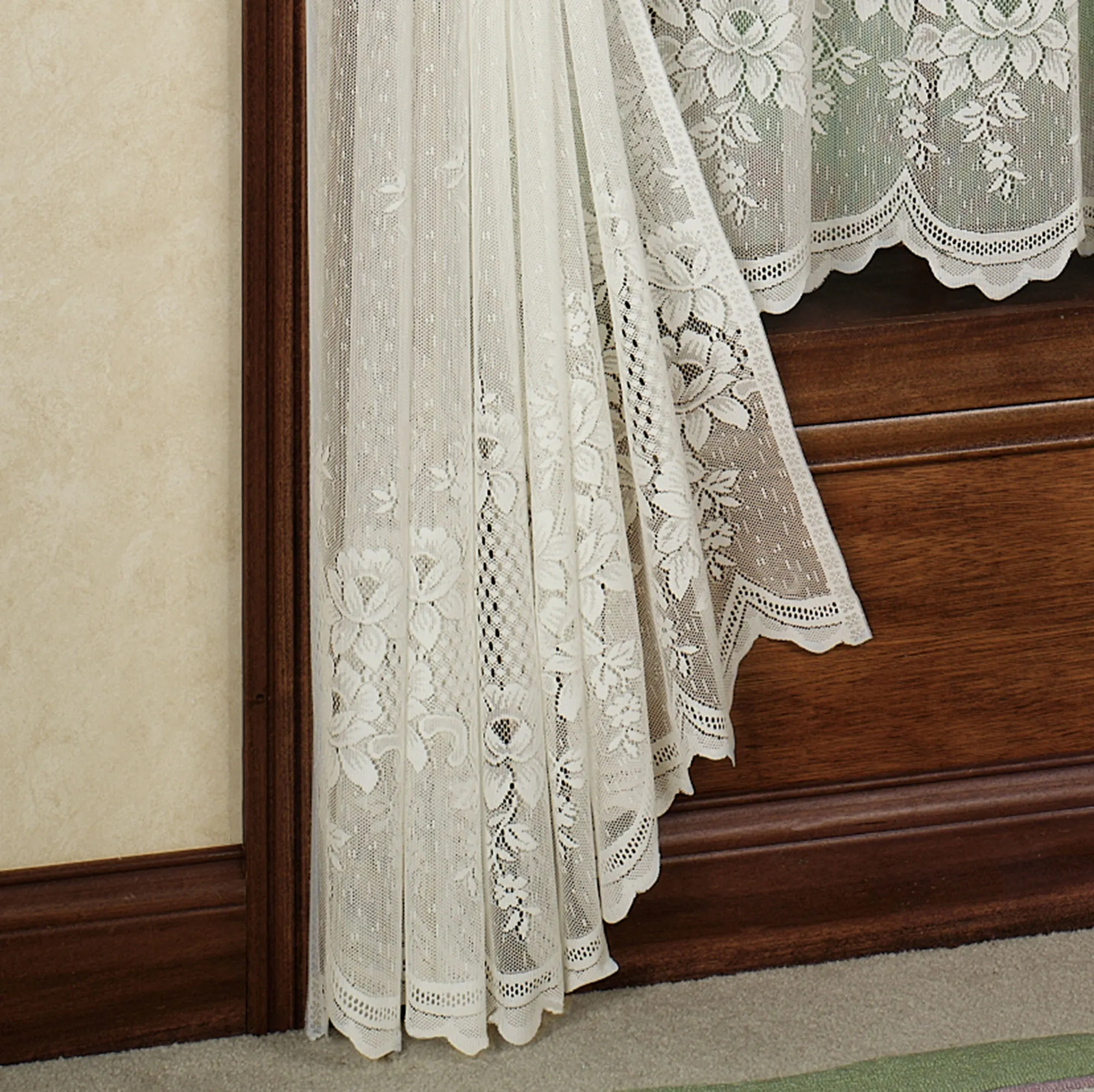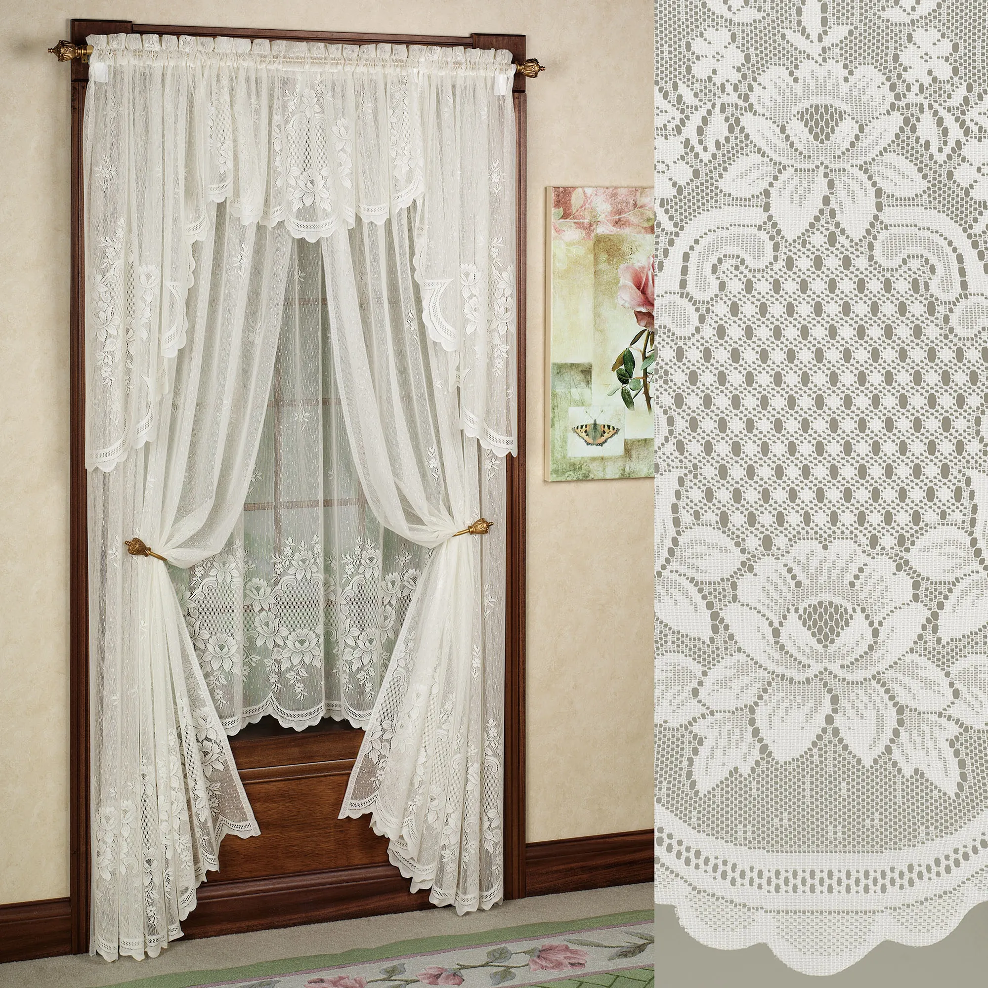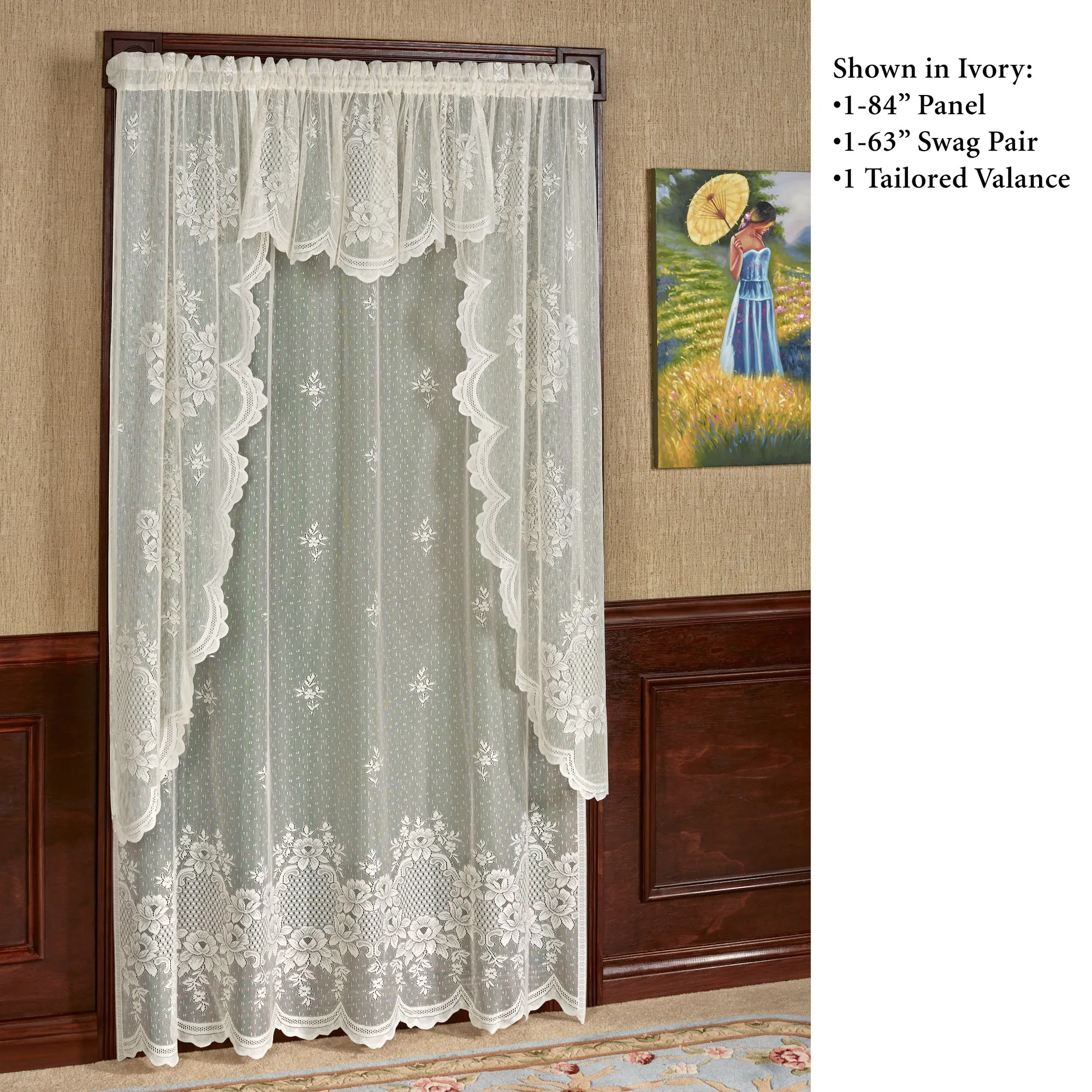 The 100% polyester Cameo Rose Lace Window Treatment has a traditional lace motif and nicely textured ground. Petite floral bouquets complement large rose cameos. Lace window treatment also features a scalloped bottom edge and decorative selvedge sides. Specify Lace Curtain Panel, Swag Valance Pair, or Tailored Valance. Window treatment has 1.75" rod pockets. Machine washable. Imported.