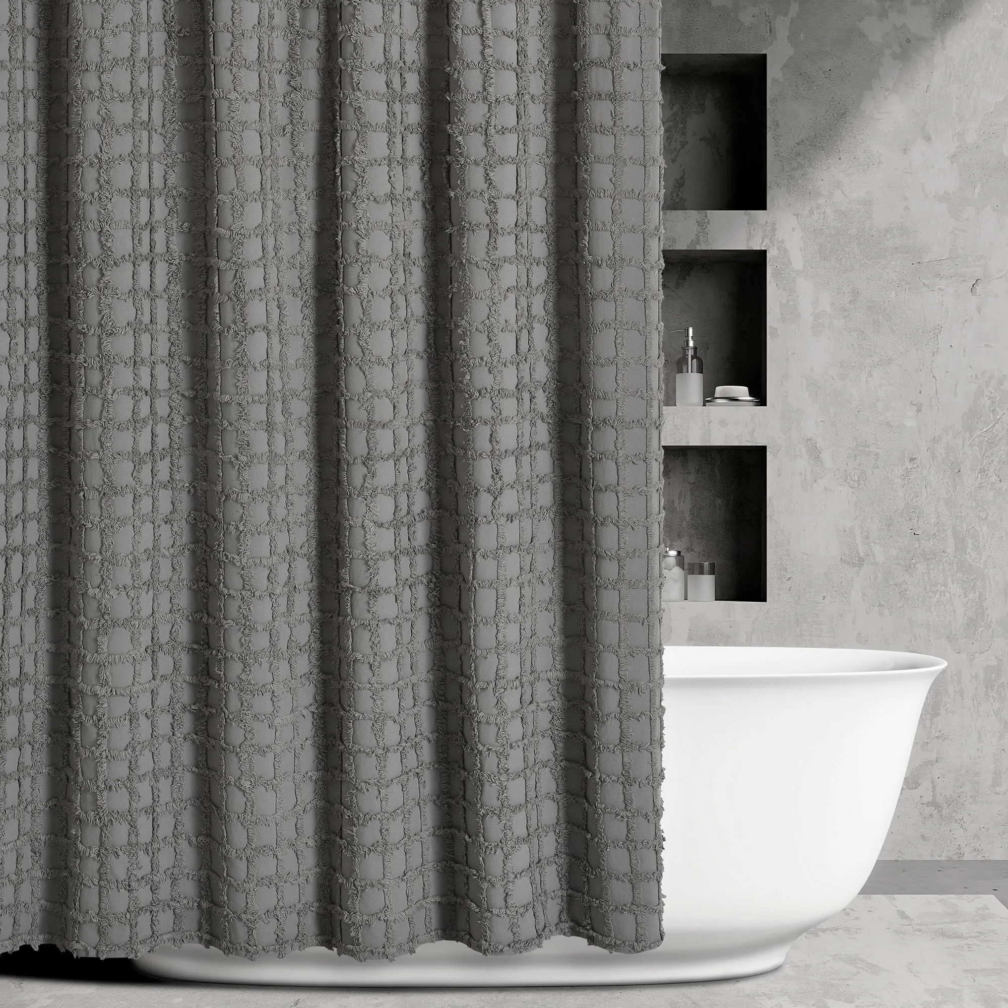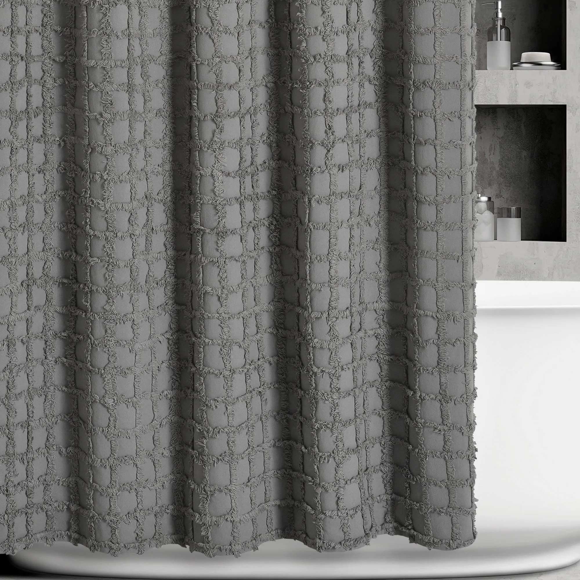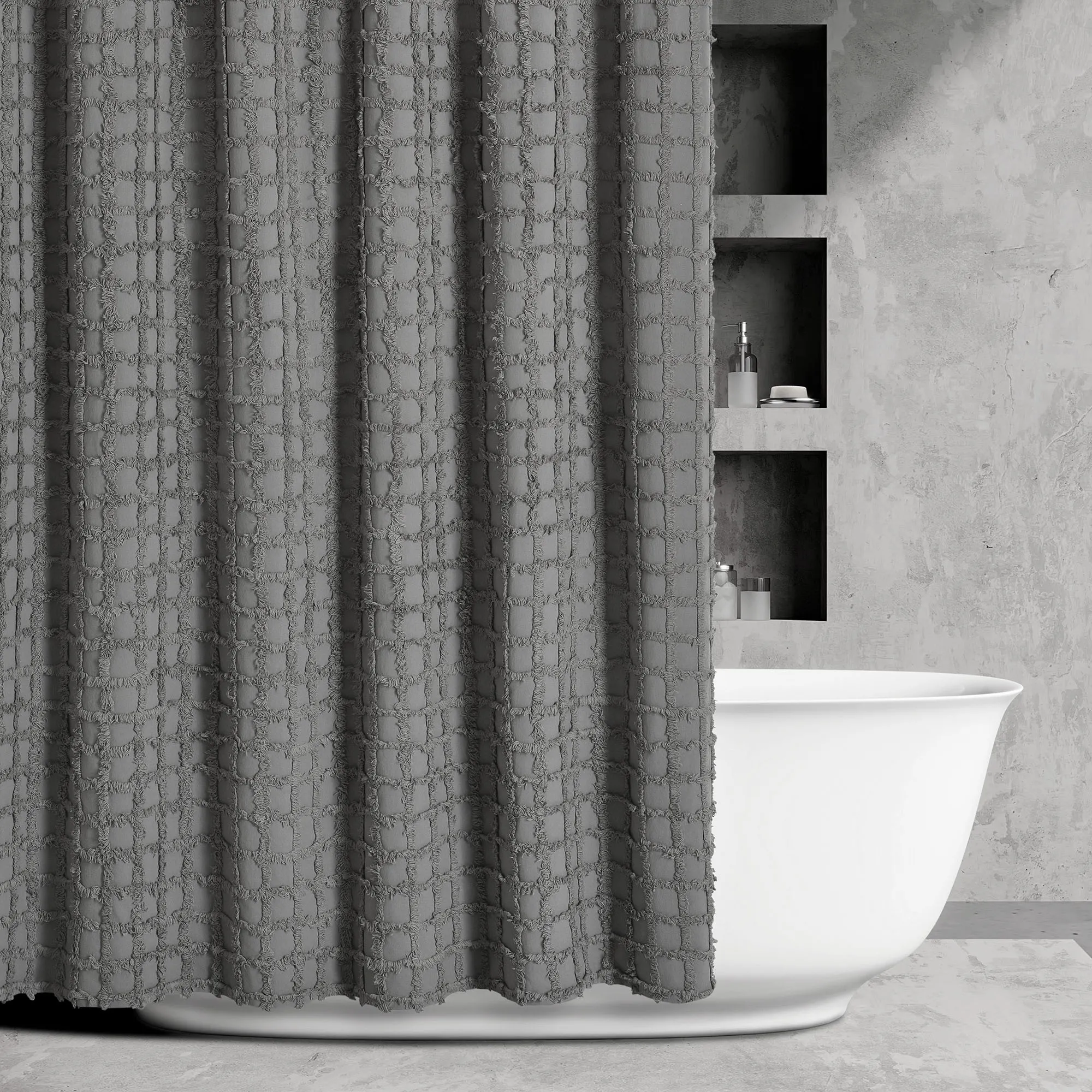 The Cameron Shower Curtain decorates your shower with a unique grid pattern. The contemporary, solid color cotton shower curtain, by Oscar Oliver New York City, has over-tufted panes. We recommend the use of a waterproof shower curtain liner. Measures 72"Wx72"L. Machine washable. Imported.