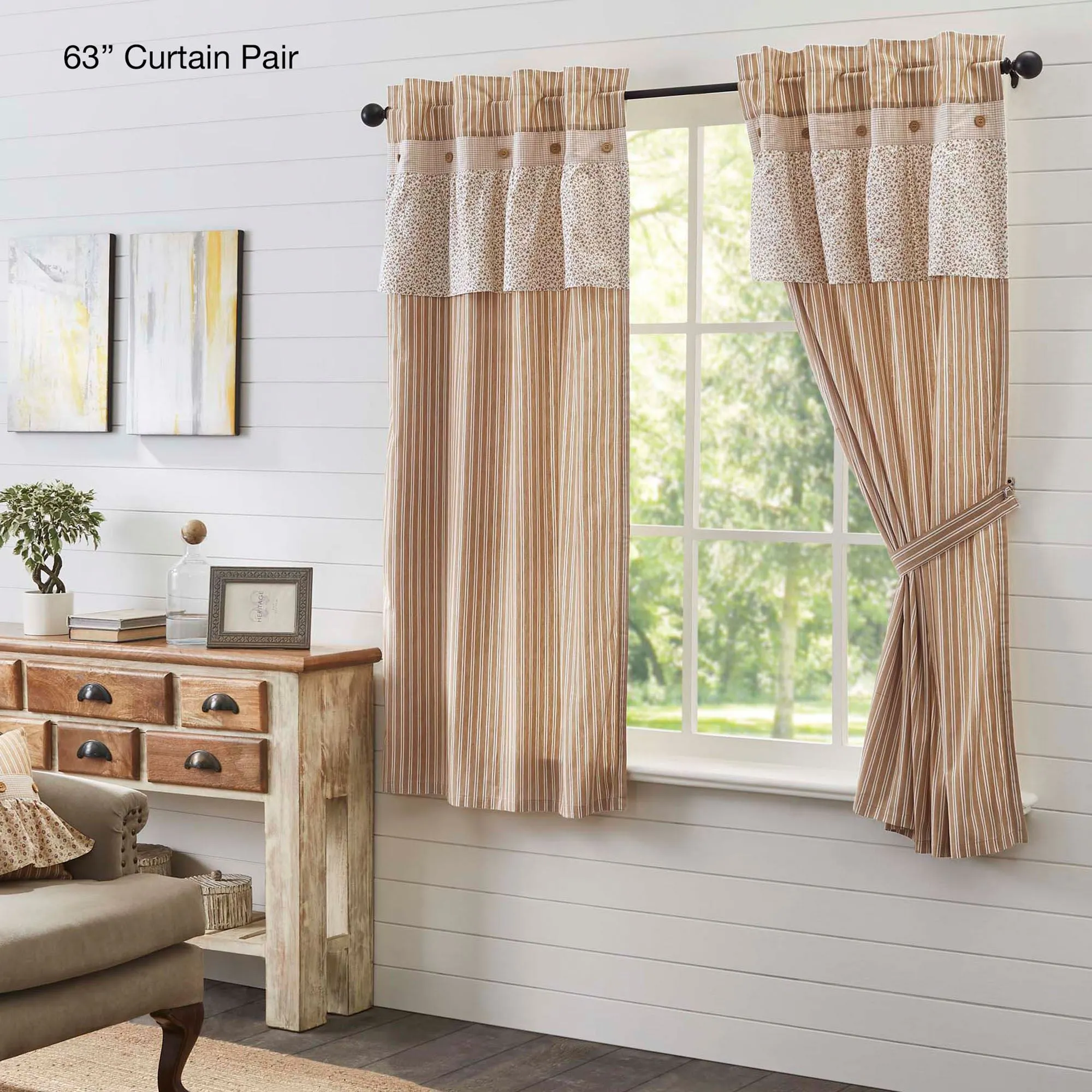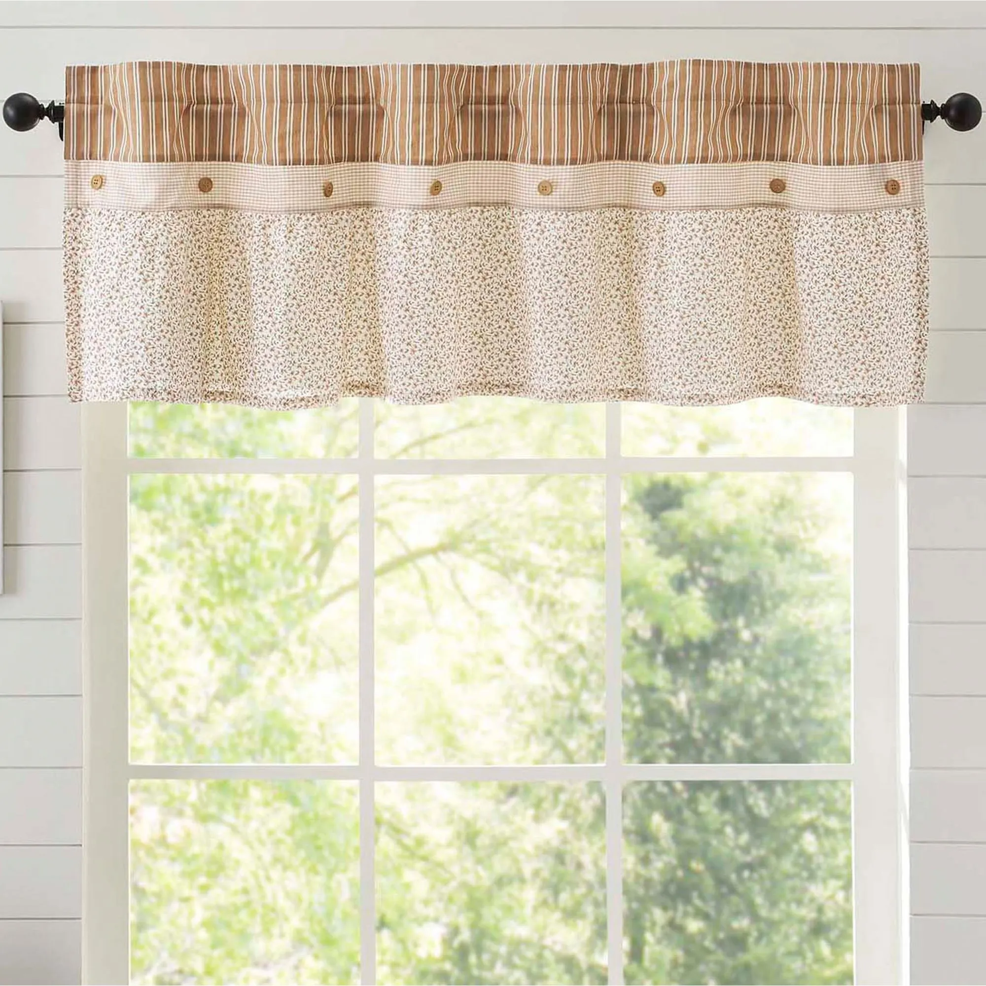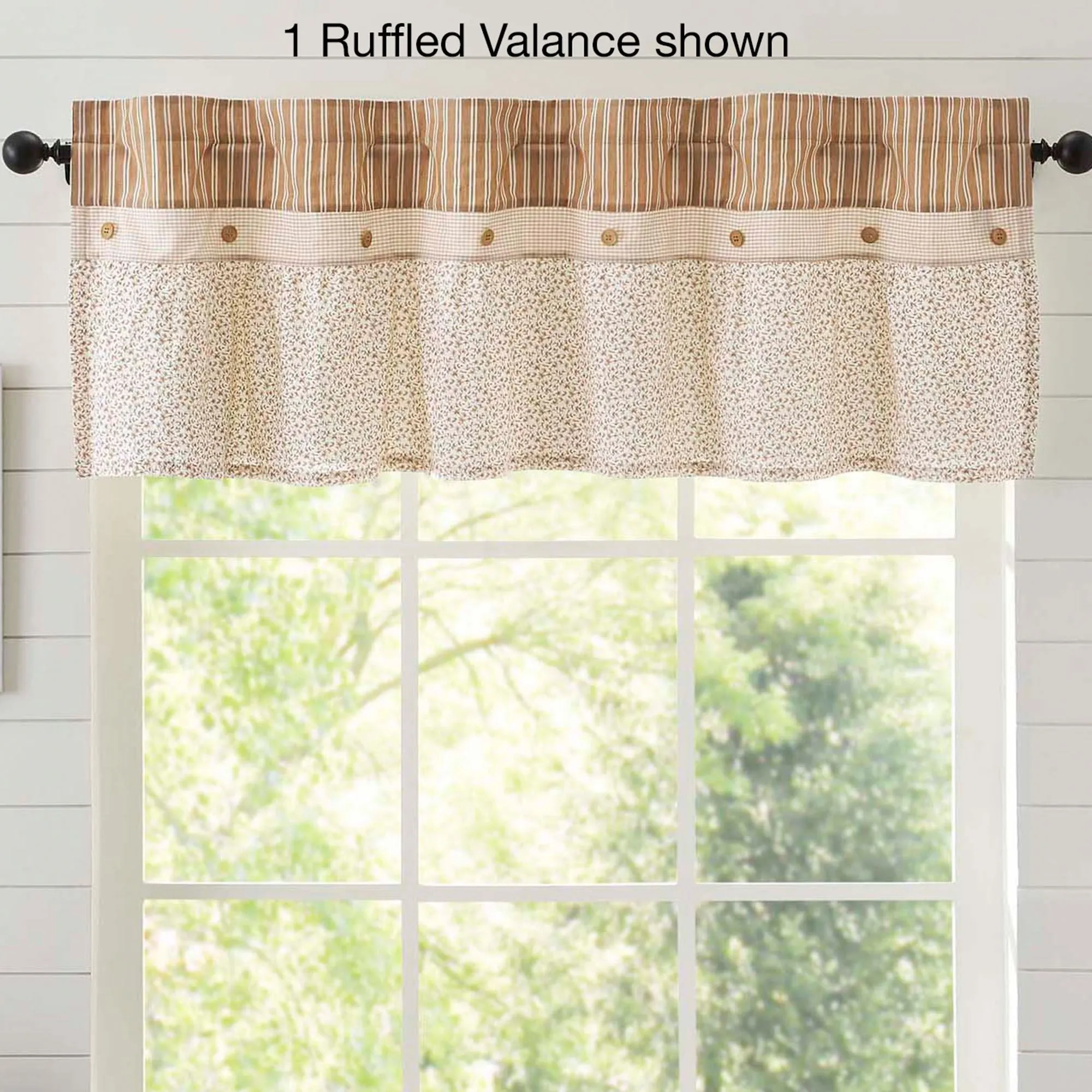 Lined Window Treatment has wooden accent buttons and is pieced with stripes, gingham plaid, and ruffles. Rod pocket is 3.25". Curtains include tiebacks. Available in two sizes. Ruffled Valance is available in two widths.