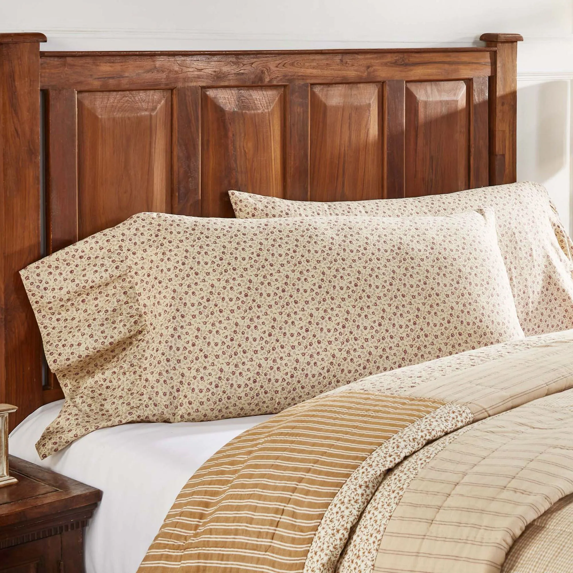 Florals and stripe patterns combine to create the homespun country look of the Camilia Bedding. This pre-washed cotton ensemble features printed designs in shades of almond, brown, amber, straw, eggshell, honey, natural, and mauve.