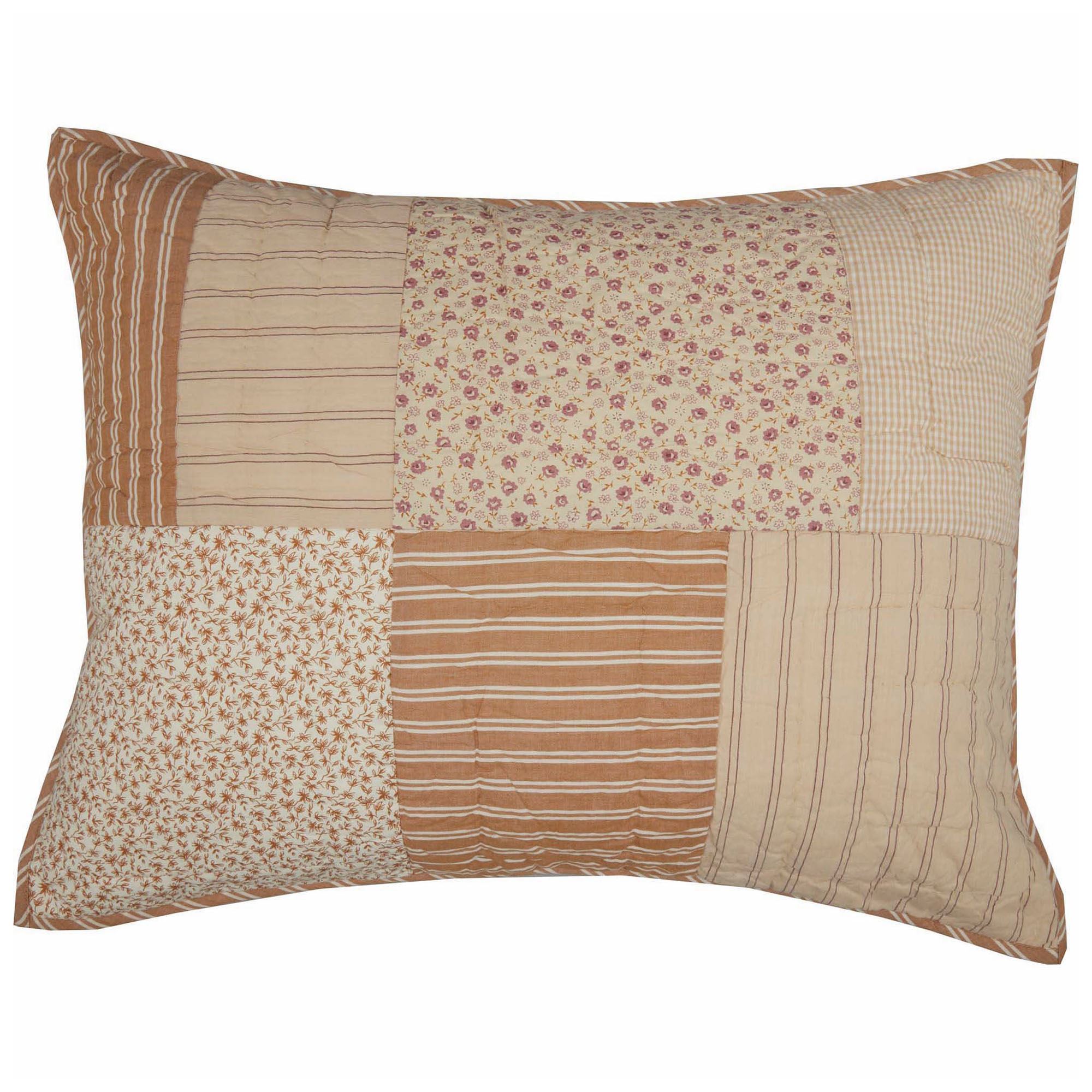 Give your bedroom a homespun country aesthetic with the Camilia Patchwork Quilt. This pre-washed cotton quilt features printed floral and stripe designs in shades of almond, brown, amber, straw, eggshell, honey, natural, and mauve. Quilt has echo and stitch-in-the-ditch hand-quilting. Reverse has mauve florals on a straw background. Quilt fill is cotton. Machine washable. Imported.