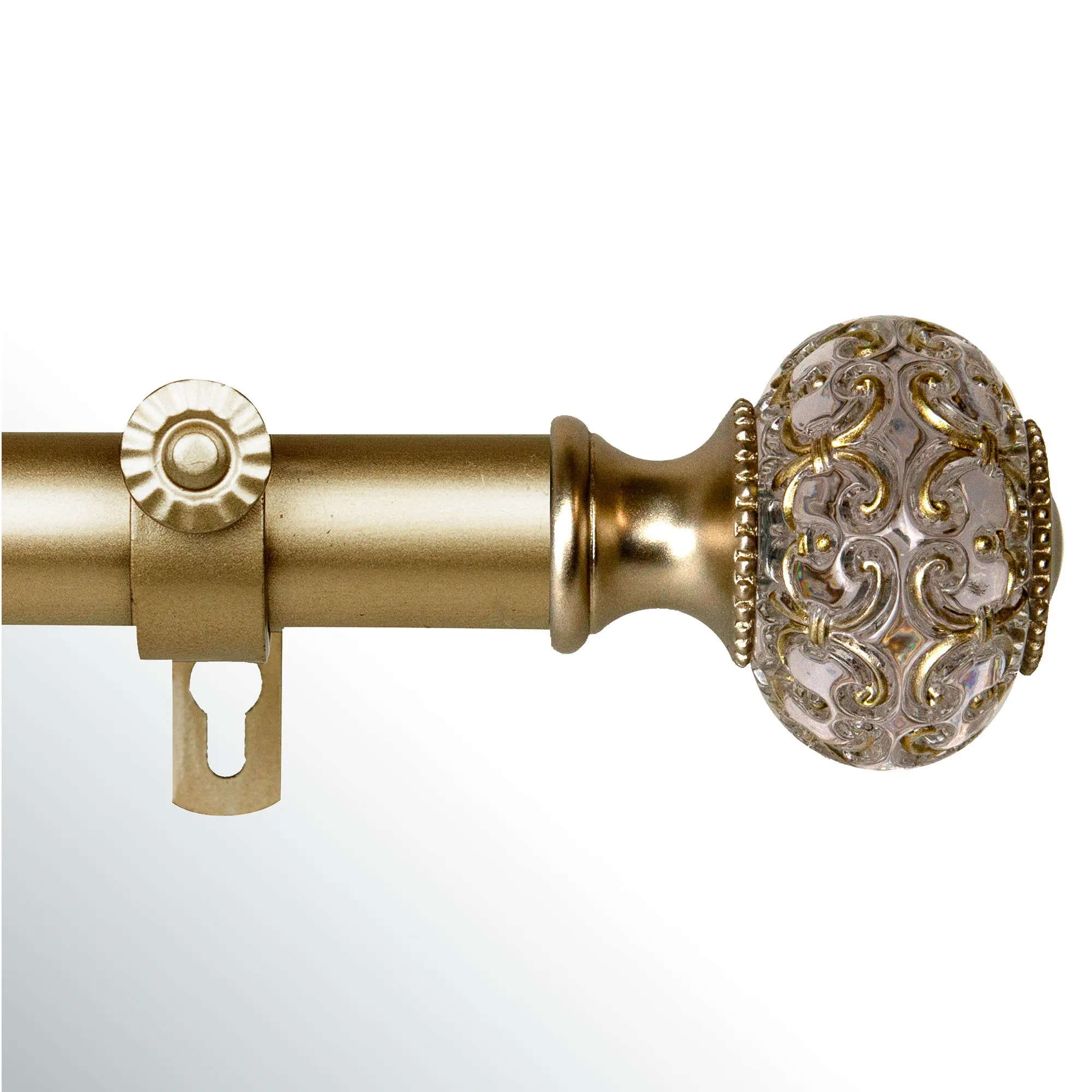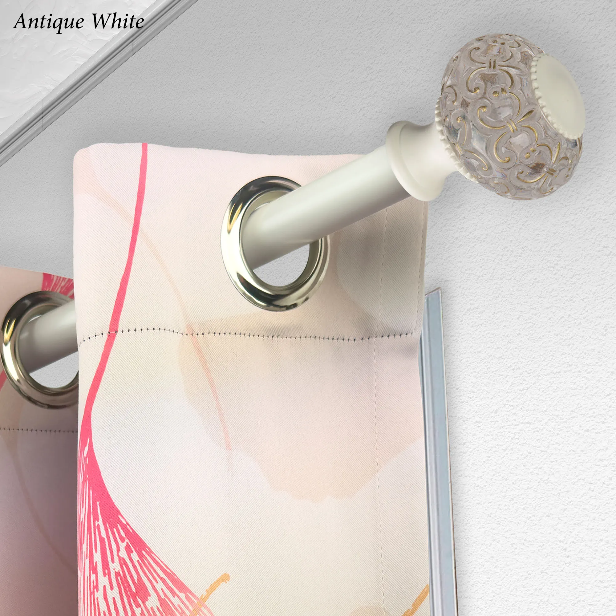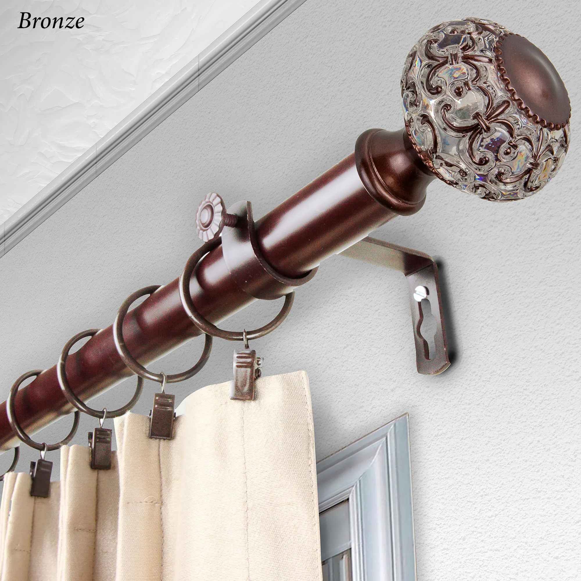 The style of the Camina Curtain Rod and Finial Set will add a traditional look to any window treatment. The telescopic steel rod has two clear finials with a filigree pattern. Set includes the 1" adjustable rod, brackets that project 3.625" from the wall, and two resin finials, 3.25"Wx3"Dx2.75"H. Antique White has a light gold pattern; Black has a black pattern; Bronze has a bronze pattern; Light Gold has a light gold pattern; and Satin Nickel has a satin nickel pattern. The 28"-48" size has two brackets; the 48"-84" and 66"-120" sizes have three brackets; the 120"-170" size has four brackets; and the 160"-240" size has five brackets.