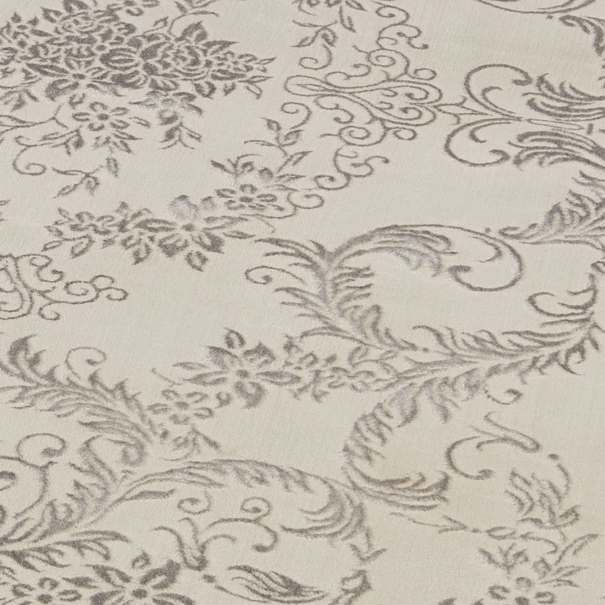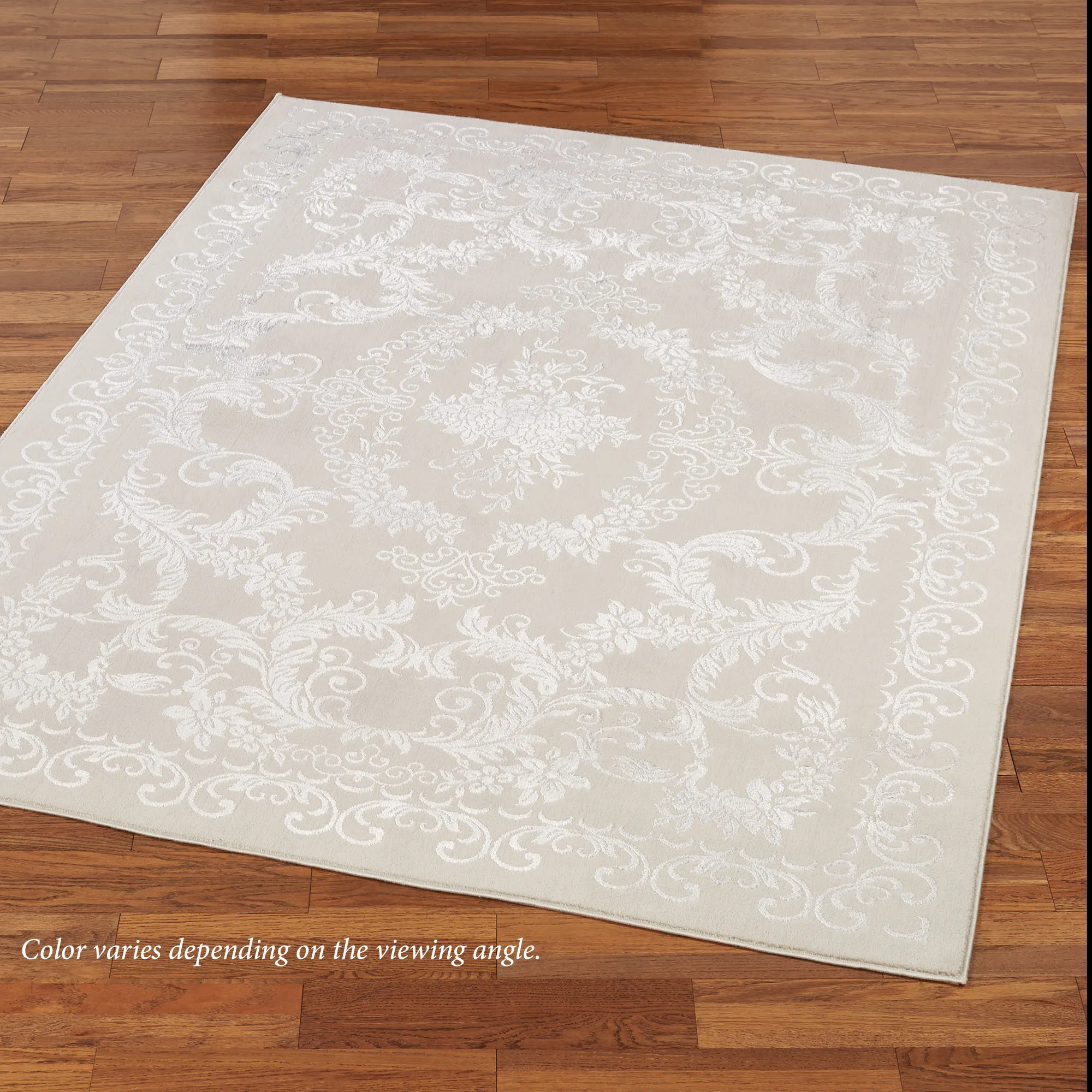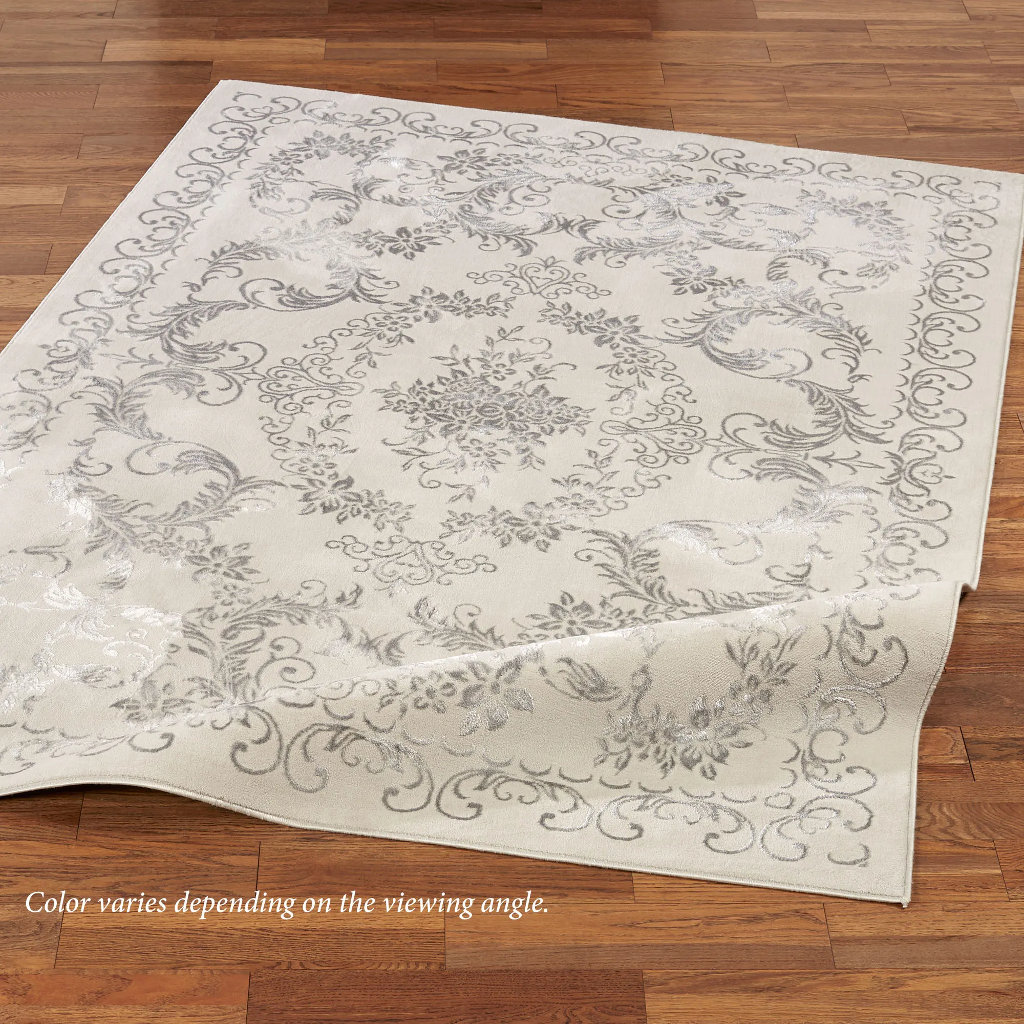 Classic swirls, acanthus leaves, and floral designs flourish magnificently on the Campiello Rug. Power-loomed of polyester, this area rug, .25" thick, has silver ornate designs on ivory. Color varies based on the viewing angle. We recommend professional cleaning by a rug cleaner. Imported.