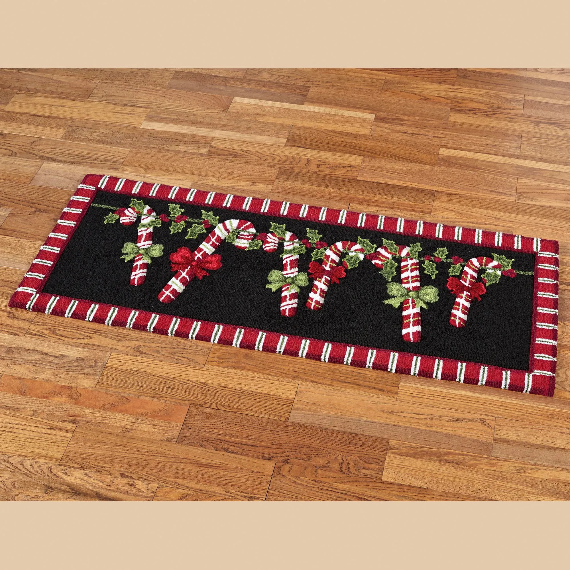 Give your guests the greatest of season's greetings with the Candy Cane Garland Holiday Rug Runner. This hand-hooked, polyester rug runner features a black field with candy canes hanging on a holly garland, with each candy cane decorated with a red or green bow. The border of this .375" thick rug runner is red with stripes of green and white, creating a block effect. Backing is cloth-covered latex. Holiday rug runner is 1'10"x4'6" (22"x54"). Indoor use only. Spot clean or machine wash. Imported.