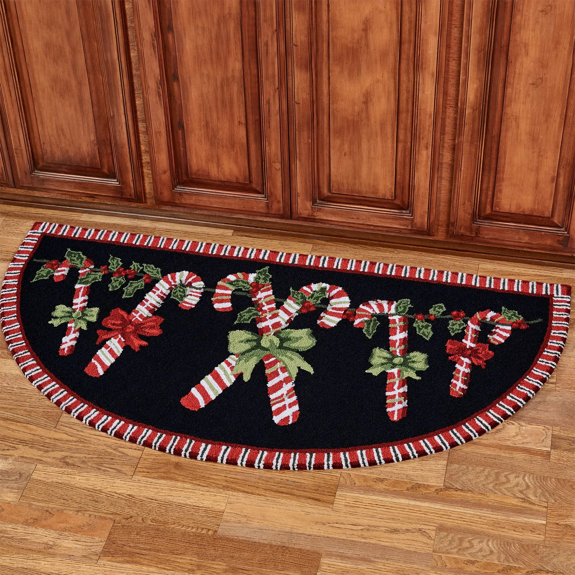 Give your guests the greatest of season's greetings with the Candy Cane Garland Holiday Slice Rug. This hand-hooked, polyester rug, .375" thick, features a black field with candy canes hanging on a holly garland, with each candy cane decorated with a red or green bow. The border has a stripe design in red, green, and white. Backing is cloth-covered latex. Holiday slice rug is 5'x2'6" (60"x30"). Indoor use only. Spot clean or machine wash. Imported.